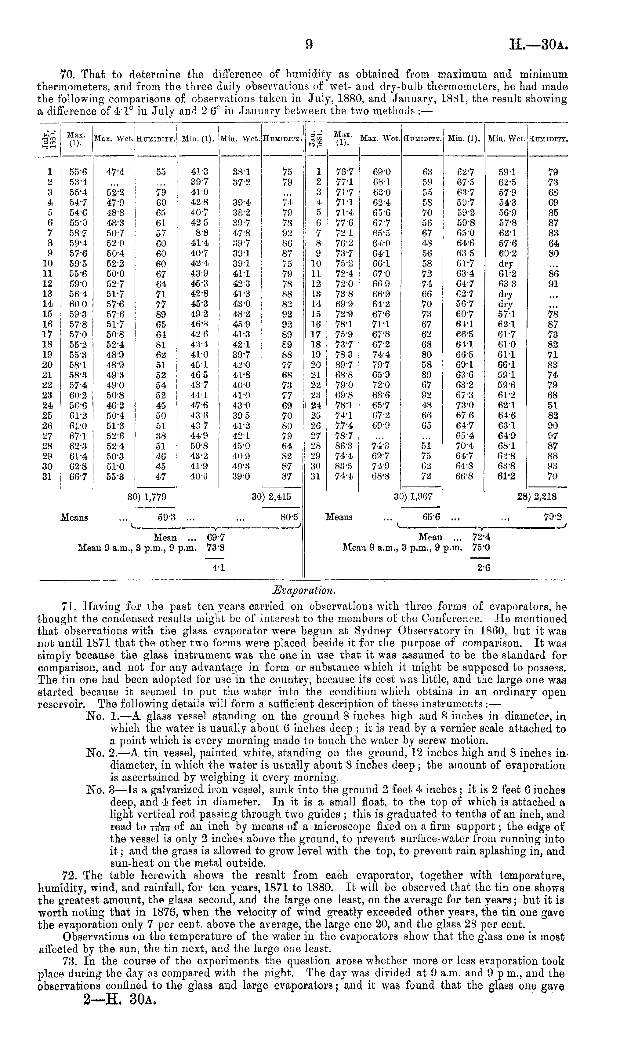 70. That to determine the difference of humidity as obtained from maximum and minimum thermometers, and from the three daily observations of wet- and dry-bulb thermometers, he had made the following comparisons of observations taken in July, ISBO, and January, 1881, the result showing a difference of 4'l° in July and 2'6° in January between the two methods : —