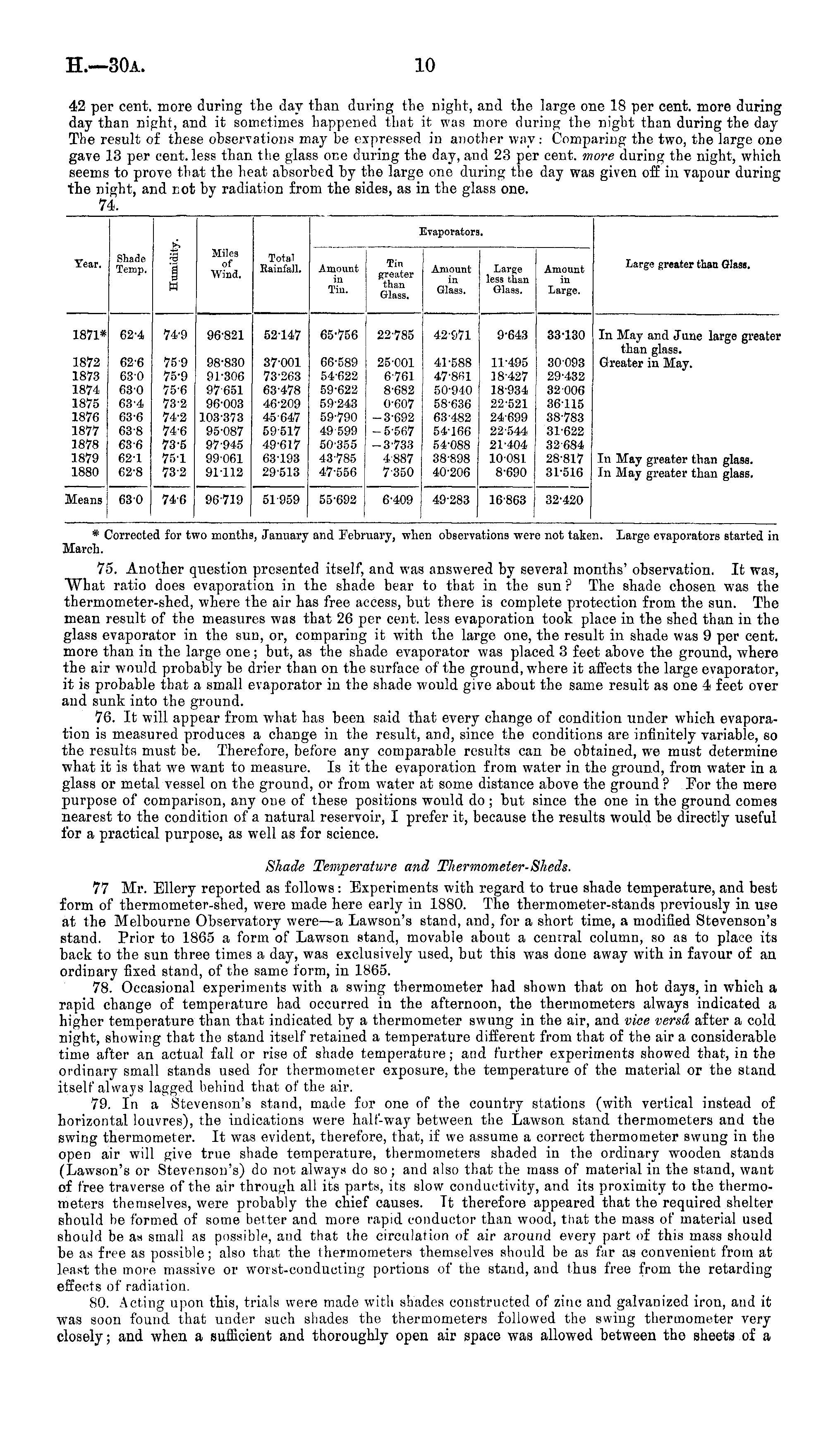 Evaporators. Tear. Shade Temp. Miles of Wind. Total Rainfall. Tin greater than Glass. Large greater than Glass. Amount in Tin. Amount in Glass. Large less than Glass. Amount in Large. 1871* 1872 1873 1874 1875 1876 1877 1878 1879 1880 62-4 62-6 63-0 630 63-4 63-6 63-8 63-6 62-1 62-8 74-9 75-9 75-9 75-6 73-2 74-2 74-6 73-5 75-1 73-2 96-821 98-830 91-306 97651 96-003 103-373 95-087 97-945 99061 91-112 52-147 37-001 73-263 63-478 46-209 45 647 59-517 49-617 63-193 29-513 65-756 66-589 54-622 59-622 59-243 59-790 49 599 50-355 43-785 47-556 22-785 25-001 6-761 8-682 0-607 -3-692 - 5-567 -3733 4887 7-350 42-971 41-588 47-861 50-940 58-636 63-482 54-166 54-088 38-898 40-206 9-643 11-495 18-427 18-934 22-521 24-699 22-544 21-404 10-081 8-690 33-130 30-093 29-432 32 006 36-115 38-783 31-622 32684 28-817 31-516 In May and June large greater than glass. Greater in May. In May greater than glass. In May greater than glass. .eans 630 746 96719 51959 55-692 6-409 49-283 16-863 32-420 * Corrected for two months, January and February, when observ: itions were not taki m. Large evaporators started in !arch.