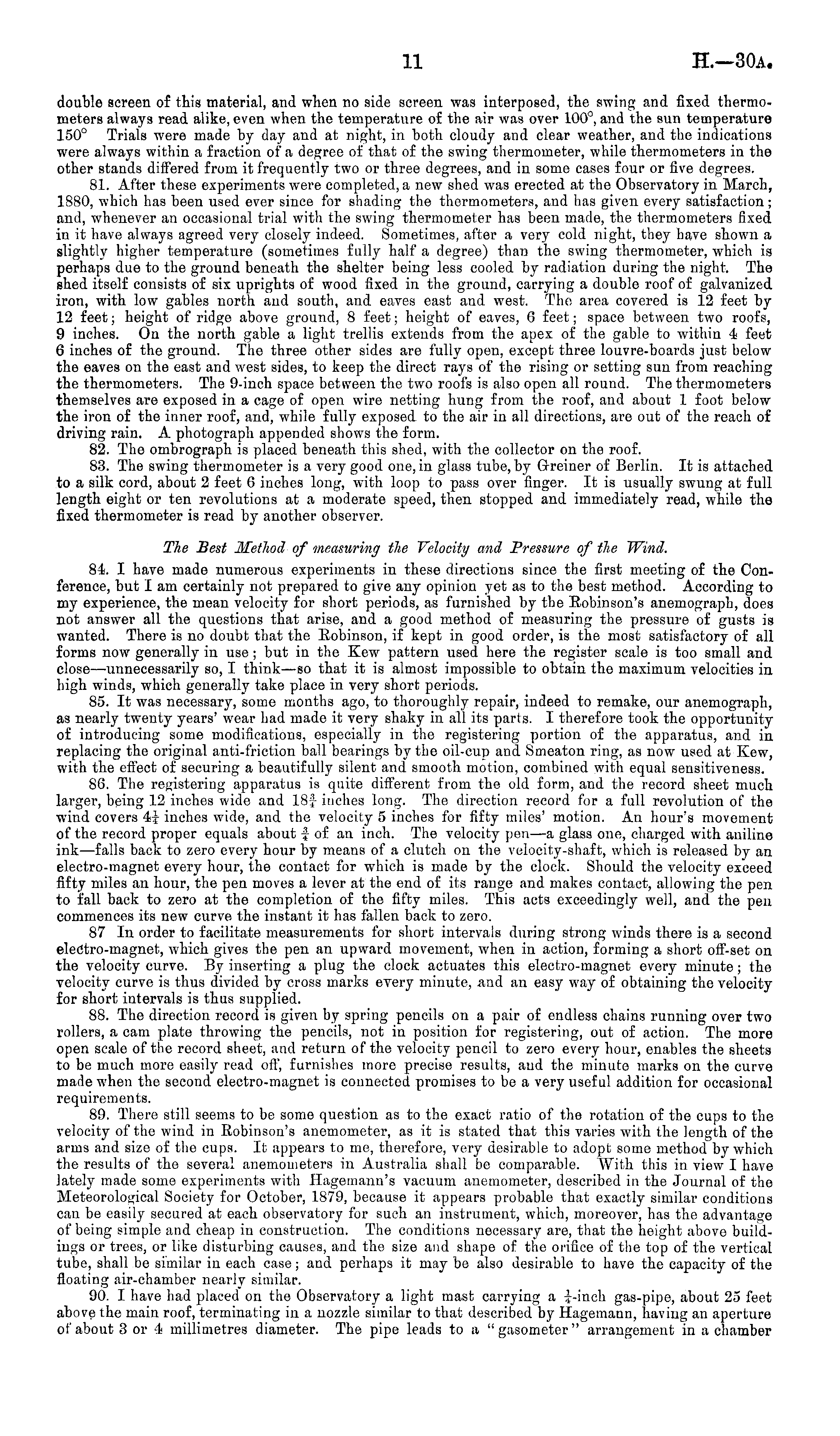 double screen of this material, and when no side screen was interposed, the swing and fixed thermometers always read alike, even when the temperature of the air was over 100°, and the sun temperature 150° Trials were made by day and at night, in both cloudy and clear weather, and the indications were always within a fraction of a degree of that of the swing thermometer, while thermometers in the other stands differed from it frequently two or three degrees, and in some cases four or five degrees. 81. After these experiments were completed, a new shed was erected at the Observatory in March, 1880, which has been used ever since for shading the thermometers, and has given every satisfaction; and, whenever an occasional trial with the swing thermometer has been made, the thermometers fixed in it have always agreed very closely indeed. Sometimes, after a very cold night, they have shown a slightly higher temperature (sometimes fully half a degree) than the swing thermometer, which is perhaps due to the ground beneath the shelter being less cooled by radiation during the night. The shed itself consists of six uprights of wood fixed in the ground, carrying a double roof of galvanized iron, with low gables north and south, and eaves east and west. The area covered is 12 feet by 12 feet; height of ridge above ground, 8 feet; height of eaves, 6 feet; space between two roofs, 9 inches. On the north gable a light trellis extends from the apex of the gable to within 4 feet 6 inches of the ground. The three other sides are fully open, except three louvre-boards just below the eaves on the east and west sides, to keep the direct rays of the rising or setting sun from reaching the thermometers. The 9-inch space between the two roofs is also open all round. The thermometers themselves are exposed in a cage of open wire netting hung from the roof, and about 1 foot below the iron of the inner roof, and, while fully exposed to the air in all directions, are out of the reach of driving rain. A photograph appended shows the form. 82. The ombrograph is placed beneath this shed, with the collector on the roof. 83. The swing thermometer is a very good one, in glass tube, by Greiner of Berlin. It is attached to a silk cord, about 2 feet 6 inches long, with loop to pass over finger. It is usually swung at full length eight or ten revolutions at a moderate speed, then stopped and immediately read, while the fixed thermometer is read by another observer. The Best Method of measuring the Velocity and Pressure of the Wind. 84. I have made numerous experiments in these directions since the first meeting of the Conference, but lam certainly not prepared to give any opinion yet as to the best method. According to my experience, the mean velocity for short periods, as furnished by the Eobinson's anemograph, does not answer all the questions that arise, and a good method of measuring the pressure of gusts is wanted. There is no doubt that the Eobinson, if kept in good order, is the most satisfactory of all forms now generally in use ; but in the Kew pattern used here the register scale is too small and close—unnecessarily so, I think —so that it is almost impossible to obtain the maximum velocities in high winds, which generally take place in very short periods. 85. It was necessary, some months ago, to thoroughly repair, indeed to remake, our anemograph, as nearly twenty years' wear had made it very shaky in all its parts. I therefore took the opportunity of introducing some modifications, especially in the registering portion of the apparatus, and in replacing the original anti-friction ball bearings by the oil-cup and Smeaton ring, as now used at Kew, with the effect of securing a beautifully silent and smooth motion, combined with equal sensitiveness. 86. The registering apparatus is quite different from the old form, and the record sheet much larger, being 12 inches wide and 18f inches long. The direction record for a full revolution of the wind covers 4| inches wide, and the velocity 5 inches for fifty miles' motion. An hour's movement of the record proper equals about £of an inch. The velocity pen —a glass one, charged with aniline ink —falls back to zero every hour by means of a clutch on the velocity-shaft, which is released by an electro-magnet every hour, the contact for which is made by the clock. Should the velocity exceed fifty miles an hour, the pen moves a lever at the end of its range and makes contact, allowing the pen to fall back to zero at the completion of the fifty miles. This acts exceedingly well, and the pen commences its new curve the instant it has fallen back to zero. 87 In order to facilitate measurements for short intervals during strong winds there is a second electro-magnet, which gives the pen an upward movement, when in action, forming a short off-set on the velocity curve. By inserting a plug the clock actuates this electro-magnet every minute; the velocity curve is thus divided by cross marks every minute, and an easy way of obtaining the velocity for short intervals is thus supplied. 88. The direction record is given by spring pencils on a pair of endless chains running over two rollers, a cam plate throwing the pencils, not in position for registering, out of action. The more open scale of the record sheet, and return of the velocity pencil to zero every hour, enables the sheets to be much more easily read oft', furnishes more precise results, and the minute marks on the curve made when the second electro-magnet is connected promises to be a very useful addition for occasional requirements. 89. There still seems to be some question as to the exact ratio of the rotation of the cups to the velocity of the wind in Eobinson's anemometer, as it is stated that this varies with the length of the arms and size of the cups. It appears to me, therefore, very desirable to adopt some method by which the results of the several anemometers in Australia shall bo comparable. With this in 