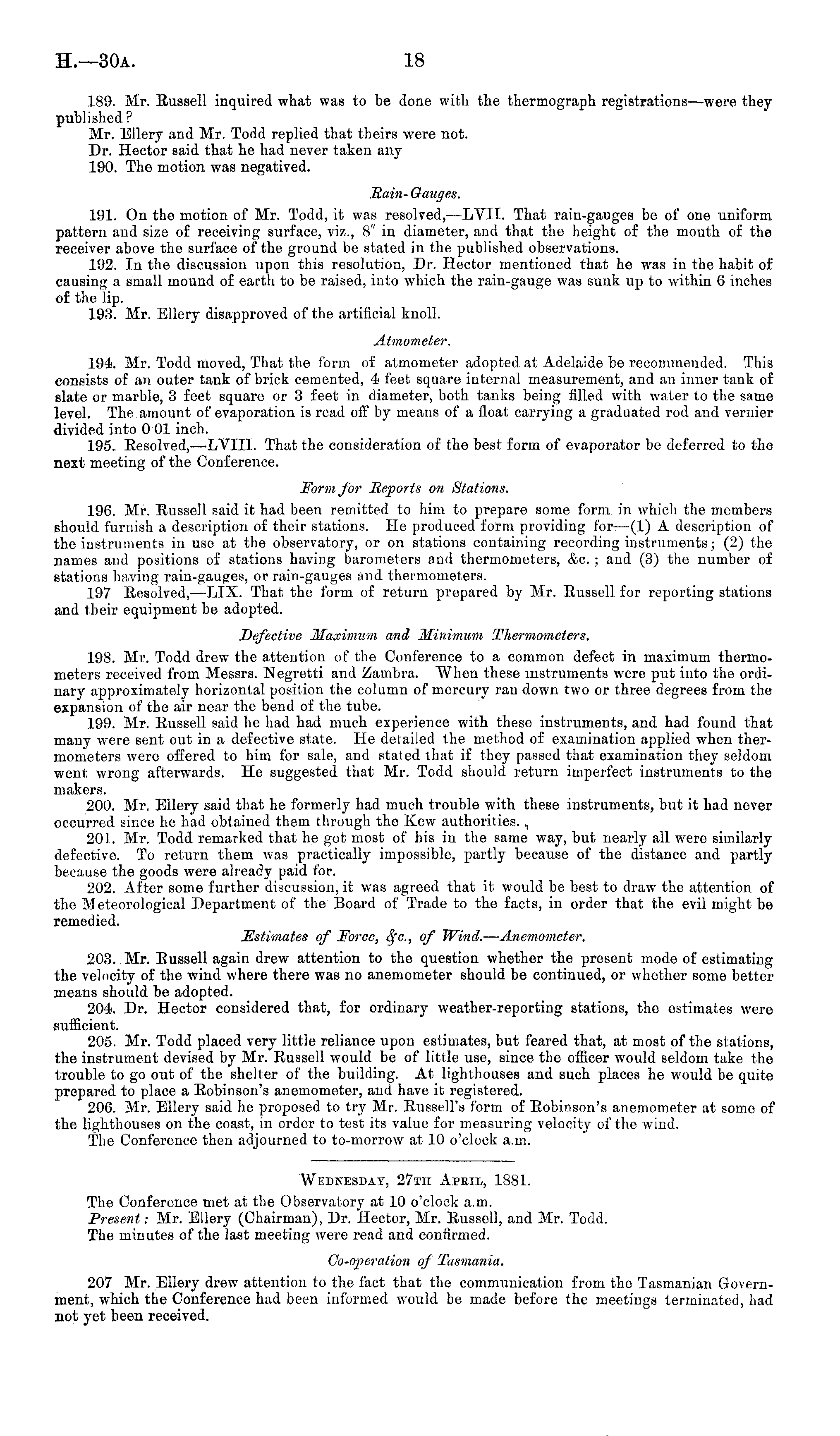 189. Mr. Eussell inquired what was to be done with the thermograph registrations—were they published? Mr. Ellery and Mr. Todd replied that theirs were not. Dr. Hector said that he had never taken any 190. The motion was negatived. Rain- Gauges. 191. On the motion of Mr. Todd, it was resolved, —LVII. That rain-gauges be of one uniform pattern and size of receiving surface, viz., 8" in diameter, and that the height of the mouth of the receiver above the surface of the ground be stated in the published observations. 192. In the discussion upon this resolution, Dr. Hector mentioned that he was in the habit of causing a small mound of earth to be raised, into which the rain-gauge was sunk up to within 6 inches of the lip. 193. Mr. Ellery disapproved of the artificial knoll. Atmometer. 194. Mr. Todd moved, That the form of atmometer adopted at Adelaide be recommended. This consists of an outer tank of brick cemented, 4 feet square internal measurement, and an inner tank of slate or marble, 3 feet square or 3 feet in diameter, both tanks being filled with water to the same level. The amount of evaporation is read off by means of a float carrying a graduated rod and vernier divided into 0 01 inch. 195. Eesolved, —LVIII. That the consideration of the best form of evaporator be deferred to the next meeting of the Conference. Form for Reports on Stations. 196. Mr. Eussell said it had been remitted to him to prepare some form in which the members should furnish a description of their stations. He produced form providing for —{1) A description of the instruments in use at the observatory, or on stations containing recording instruments; (2) the names and positions of stations having barometers and thermometers, &c. ; and (3) the number of stations having rain-gauges, or rain-gauges and thermometers. 197 Eesolved, —LIX. That the form of return prepared by Mr. Eussell. for reporting stations and their equipment be adopted. Defective Maximum and Minimum Thermometers. 198. Mr. Todd drew the attention of the Conference to a common defect in maximum thermometers received from Messrs. Negretti and Zambra. When these instruments were put into the ordinary approximately horizontal position the column of mercury ran down two or three degrees from the expansion of the air near the bend of the tube. 199. Mr. Eussell said he had had much experience with these instruments, and had found that many were sent out in a defective state. He detailed the method of examination applied when thermometers were offered to him for sale, and stated that if they passed that examination they seldom went wrong afterwards. He suggested that Mr. Todd should return imperfect instruments to the makers. 200. Mr. Ellery said that he formerly had much trouble with these instruments, but it had never occurred since he had obtained them through the Kew authorities., 201. Mr. Todd remarked that he got most of his in the same way, but nearly all were similarly defective. To return them was practically impossible, partly because of the distance and partly because the goods were already paid for. 202. After some further discussion, it was agreed that it would be best to draw the attention of the Meteorological Department of the Board of Trade to the facts, in order that the evil might be remedied. Estimates of Force, Sfc, of Wind. — Anemometer. 203. Mr. Russell again drew attention to the question whether the present mode of estimating the velocity of the wind where there was no anemometer should be continued, or whether some better means should be adopted. 204. Dr. Hector considered that, for ordinary weather-reporting stations, the estimates were sufficient. 205. Mr. Todd placed very little reliance upon estimates, but feared that, at most of the stations, the instrument devised by Mr. Russell would be of little use, since the officer would seldom take the trouble to go out of the shelter of the building. At lighthouses and such places he would be quite prepared to place a Robinson's anemometer, and have it registered. 206. Mr. Ellery said he proposed to try Mr. Russell's form of Robinson's anemometer at some of the lighthouses on the coast, in order to test its value for measuring velocity of the wind. The Conference then adjourned to to-morrow at 10 o'clock a.m.