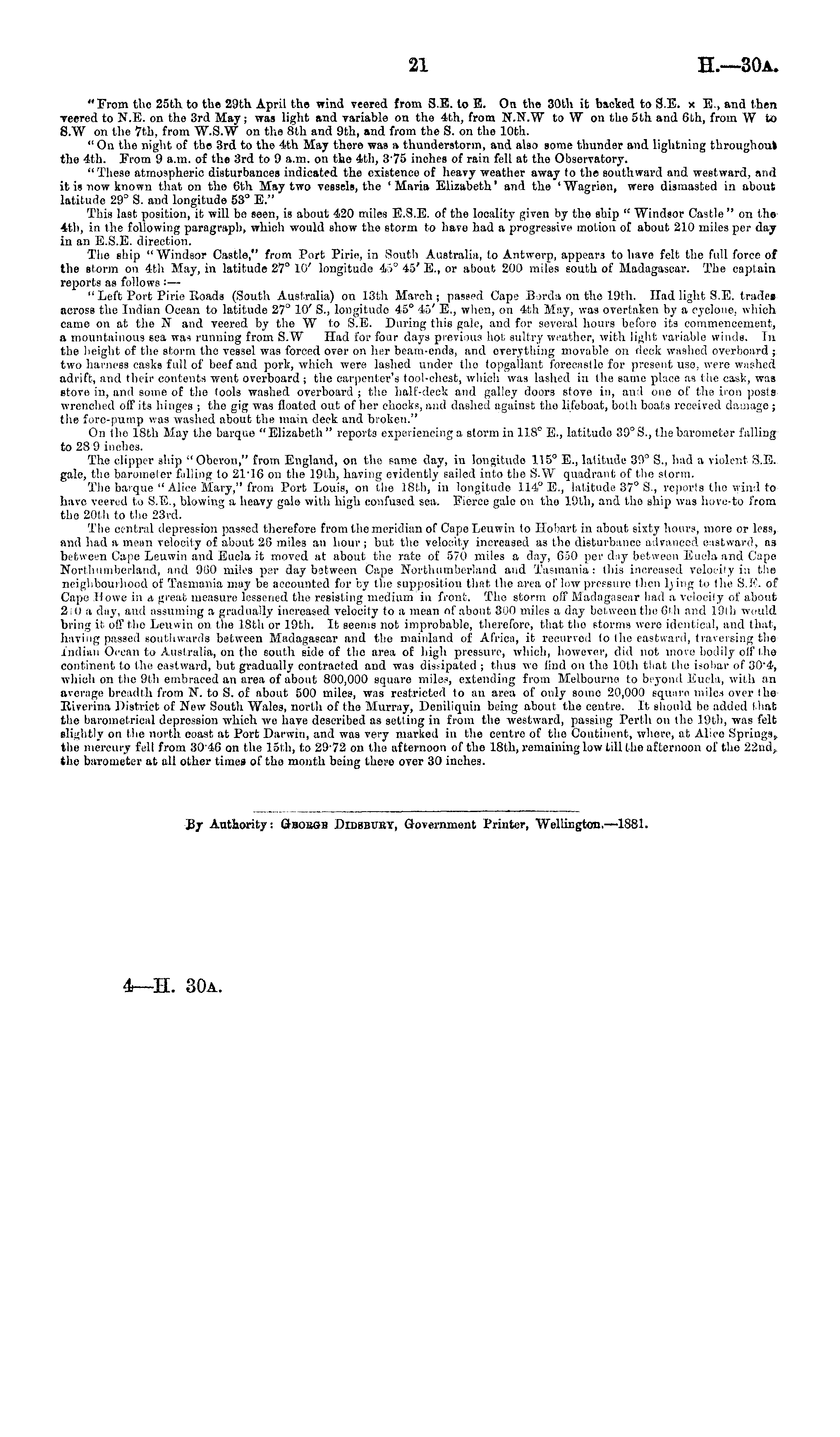 "From the 25th to the 29th April the wind veered from S.E. to E. On the 30th it backed to S.E. x E., and then veered to N.E. on the 3rd May; was light and variable on tho 4th, from N.N.W to W on the sth and 6th, from W to B.W on the 7th, from W.S.W on the Bth and 9th, and from the S. on the 10th. "On the night of tho 3rd to the 4th May there was a thunderstorm, and also some thunder and lightning throughout the 4th. From 9 a.m. of the 3rd to 9 a.m. on the 4th, 375 inches of rain fell at the Observatory. "These atmospheric disturbances indicated the existence of heavy weather away to the southward and westward, and it is now known that on the 6th May two vessels, the ' Maria Elizabeth' and the 'Wagrien, were dismasted in about latitude 29° S. and longitude 53° E." This last position, it will be seen, is about 420 miles E.S.E. of the locality given by the ship " Windsor Castle " on tho 4th, in the following paragraph, which would show the storm to have had a progressive motion of about 210 miles per day in an E.S.E. direction. The ship "Windsor Castle," from Port Piric, in South Australia, to Antwerp, appears to have felt the full force of the storm on 4th May, in latitude 27° 10' longitude 45° 45' E., or about 200 miles south of Madagascar. The captain reports as follows : — " Left Port Pirie Roads (South Australia) on 13th March ; passed Cape Borda on the 19th. Had light S.E. trades across the Indian Ocean to latitude 27° 10' S., longitude 45° 45' E., when, on 4th May, was overtaken by a cyclone, which came on at the N and veered by the W to S.E. During this gale, and for several hours before its commencement, a mountainous sea was running from S.W Had for four days previous hot sultry weather, with light variable winds. In tbe height of the storm the vessel was forced over on her beam-ends, and everything movable on deck washed overboard ; two harness casks full of beef and pork, which were lashed under the topgallant forecastle for present use, were washed adrift, and their contents went overboard ; the carpenter's tool-chest, which was lashed in the same place as the cask, was stove in, and some of the tools washed overboard ; the half-deck and galley doors stove in, and one of the iron posts wrenched off its hinges ; the gig was floated out of her chocks, and dashed against the lifeboat, both boats received damage; the fore-pump was washed about the main deck and broken." On (he 18th May the barque "Elizabeth" reports experiencing a storm in 118° E., latitude 39° S., the barometer falling to 28 9 inches. The clipper ship "Oberon," from England, on the same day, in longitude 115° E., latitude 39° S., had a violent S.E. gale, the barometer falling to 21-16 on the 19th, having evidently Bailed into the S.W quadrant of the storm. The barque " Alice Mary," from Port Louis, on the 18th, in longitude 114° E., latitude 37° S., reports the wind to have veered to S.E., blowing a heavy gale with high confused sea. Fierce gale on the 19th, and tho ship was hove-to from the 20lh to the 23rd. The central depression passed therefore from the meridian of Cape Leuwin to Hobart in about sixty hours, more or less, and had a mean velocity of about 26 miles an hour ; but the velocity increased as the disturbance advanced eastward, as between Cape Leuwin and Eucla it moved at about the rate of 570 miles a day, 650 per day between Eucla and Cape Northumberland, and 960 miles per day between Cape Northumberland and Tasmania: this increased velocity in the neighbourhood of Tasmania may be accounted for by the supposition that the area of low pressure then lying to the S JO. of Cape Howe in a great measure lessened the resisting medium in front. The stoi-in off Madagascar had a velocity of about 2u) a day, and assuming a gradually increased velocity to a mean of about 300 miles a day between tho 6lh and 19th would bring it. off the Leuwin on the 18th or 19th. It seems not improbable, therefore, that tho storms were identical, and that, having passed southwards between Madagascar and the mainland of Africa, it recurved Io Iho eastward, traversing the Indian Ocean to Australia, on the south Bide of the area of high pressure, which, however, did not move bodily off the continent to the eastward, but gradually contracted and was dissipated ; thus we find on the 10th that the isobar of 30'4, which on the 9th embraced an area of about 800,000 square miles, extending from Melbourne to beyond Eucla, with an average breadth from N. to S. of about 500 miles, was restricted to an area of only some 20,000 square miles over the Riverina District of New South Wales, north of the Murray, Deniliquin being about the centre. It should be added that the barometrical depression which wo have described as sotting in from the westward, passing Perth on Iho 19th, was felt slightly on the north coast at Port Darwin, and was very marked in the centre of the Continent, where, at Alice Springs, the mercury fell from 3046 on the 15th, to 2972 on the afternoon of the 18th, remaining low till the afternoon of the 22nd, the barometer at all other times of tho month being there over 30 inches.