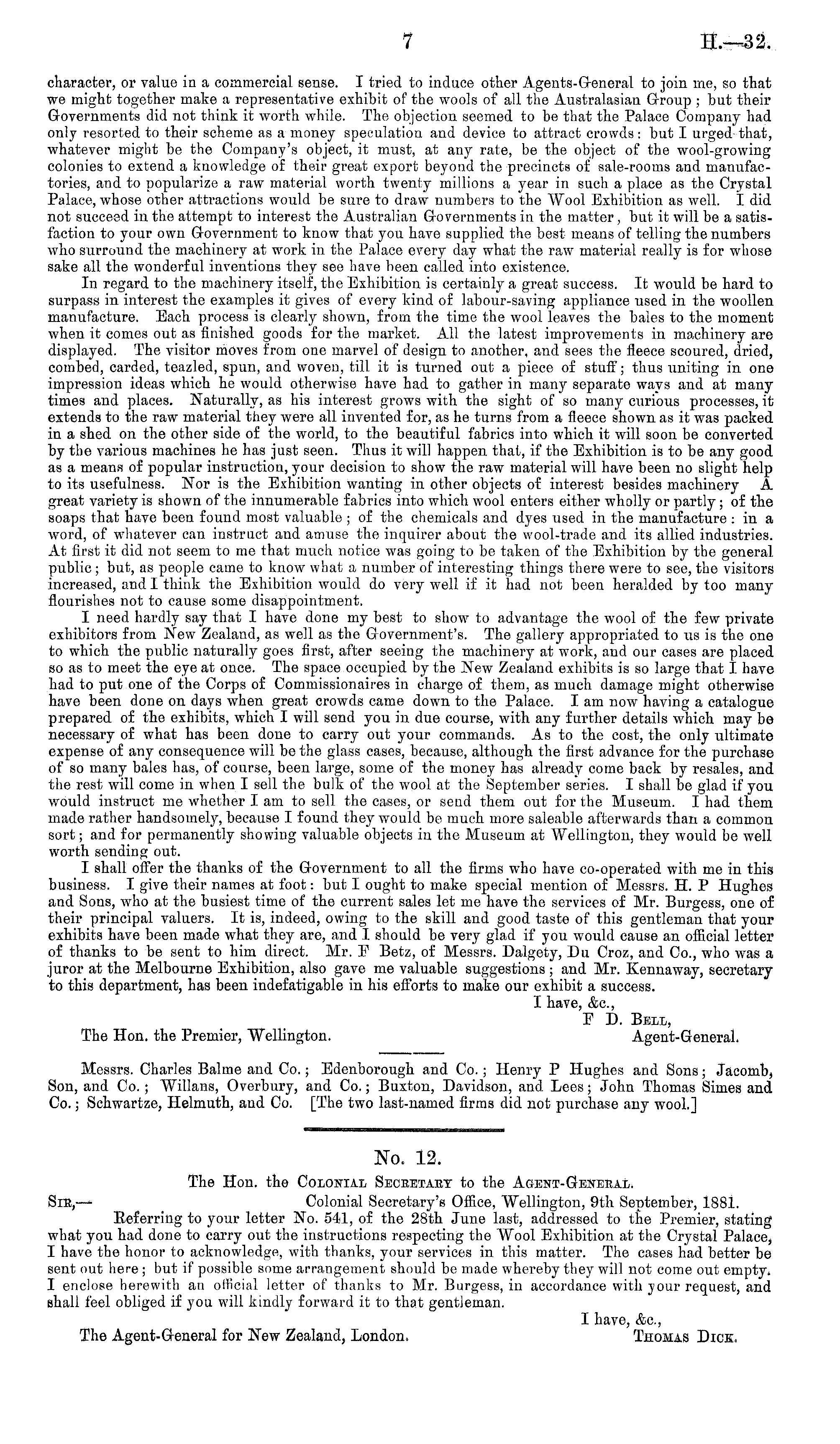 character, or value in a commercial sense. I tried to induce other Agents-General to join me, so that we might together make a representative exhibit of the wools of all the Australasian Group ; but their Governments did not think it worth while. The objection seemed to be that the Palace Company had only resorted to their scheme as a money speculation and device to attract crowds : but I urged that, whatever might be the Company's object, it must, at any rate, be the object of the wool-growing colonies to extend a knowledge of their great export beyond the precincts of sale-rooms and manufactories, and to popularize a raw material, worth twenty millions a year in such a place as the Crystal Palace, whose other attractions would be sure to draw numbers to the Wool Exhibition as well. I did not succeed in the attempt to interest the Australian Governments in the matter, but it will be a satisfaction to your own Government to know that you have supplied the best means of telling the numbers who surround the machinery at work in the Palace every day what the raw material really is for whose sake all the wonderful inventions they see have been called into existence. In regard to the machinery itself, the Exhibition is certainly a great success. It would be hard to surpass in interest the examples it gives of every kind of labour-saving appliance used in the woollen manufacture. Each process is clearly shown, from the time the wool leaves the bales to the moment when it comes out as finished goods for the market. All the latest improvements in machinery are displayed. The visitor moves from one marvel of design to another, and sees the fleece scoured, dried, combed, carded, teazled, spun, and woven, till it is turned out a piece of stuff; thus uniting in one impression ideas which he would otherwise have had to gather in many separate ways and at many times and places. Naturally, as his interest grows with the sight of so many curious processes, it extends to the raw material they were all invented for, as he turns from a fleece shown as it was packed in a shed on the other side of the world, to the beautiful fabrics into which it will soon be converted by the various machines he has just seen. Thus it will happen that, if the Exhibition is to be any good as a means of popular instruction, your decision to show the raw material will have been no slight help to its usefulness. Nor is the Exhibition wanting in other objects of interest besides machinery A great variety is shown of the innumerable fabrics into which wool enters either wholly or partly ; of the soaps that have been found most valuable ; of the chemicals and dyes used in the manufacture : in a word, of whatever can instruct and amuse the inquirer about the wool-trade and its allied industries. At first it did not seem to me that much notice was going to be taken of the Exhibition by the general public ; but, as people came to know what a number of interesting things there were to see, the visitors increased, and I think the Exhibition would do very well if it had not been heralded by too many nourishes not to cause some disappointment. I need hardly say that I have done my best to show to advantage the wool of the few private exhibitors from New Zealand, as well as the Government's. The gallery appropriated to us is the one to which the public naturally goes first, after seeing the machinery at work, and our cases are placed so as to meet the eye at once. The space occupied by the New Zealand exhibits is so large that I have had to put one of the Corps of Commissionaires in charge of them, as much damage might otherwise have been done on days when great crowds came down to the Palace. lam now having a catalogue prepared of the exhibits, which I will send you in due course, with any further details which may be necessary of what has been done to carry out your commands. As to the cost, the only ultimate expense of any consequence will be the glass cases, because, although the first advance for the purchase of so many bales has, of course, been large, some of the money has already come back by resales, and the rest will come in when I sell the bulk of the wool at the September series. I shall be glad if you would instruct me whether lam to sell the cases, or send them out for the Museum. I had them made rather handsomely, because I found they would be much more saleable afterwards than a common sort; and for permanently showing valuable objects in the Museum at Wellington, they would be well worth sending out. I shall offer the thanks of the Government to all the firms who have co-operated with me in this business. I give their names at foot: but I ought to make special mention of Messrs. H. P Hughes and Sons, who at the busiest time of the current sales let me have the services of Mr. Burgess, one of their principal valuers. It is, indeed, owing to the skill and good taste of this gentleman that your exhibits have been made what they are, and I should be very glad if you would cause an official letter of thanks to be sent to him direct. Mr. F Betz, of Messrs. Dalgety, Dv Croz, and Co., who was a juror at the Melbourne Exhibition, also gave me valuable suggestions ; and Mr. Kennaway, secretary to this department, has been indefatigable in his efforts to make our exhibit a success. I have, &c, F D. Bell, The Hon. the Premier, Wellington. Agent-General.