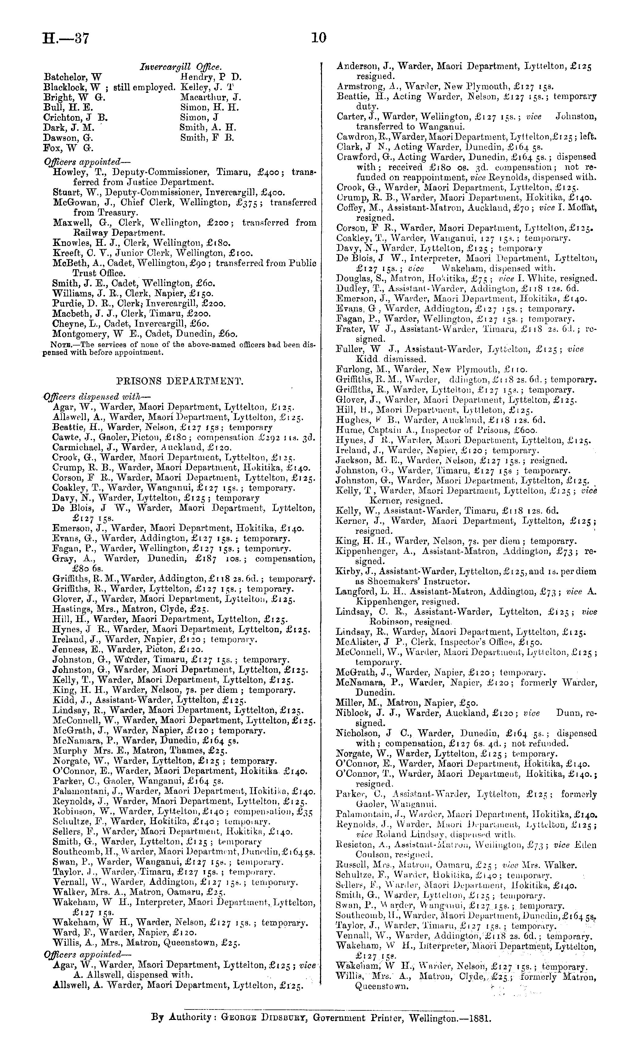 Anderson, J., Warder, Maori Department, Lyttelton, £125 resigned. Armstrong, A., Warder, New Plymouth, £127 15s. Beattie, 11., Acting Warder, Nelson, £127 155.; temporary duty. Carter, J., Warder, Wellington, £127 159.; vice Johnston, transferred to Wanganui. Cawdron, E.,Warder, Maori Department, Lyttelton,£l2s ; left. Clark, J N., Acting Warder, -Dunedin, £164 ss. Crawford, G., Acting Warder, Dunedin, £164 55.; dispensed with; received £180 os. 3d. compensation; not refunded on reappointment, vice Reynolds, dispensed with. Crook, G., Warder, Maori Department, Lyttelton, £12;. Crump, R. 8., Warder, Maori Department, Hokitika, £140. Coffey, M., Assistant-Matron, Auckland, £70; vice I. Moffat, resigned. Corson, F R., Warder, Maori Department, Lyttelton, £12;. Coakley, T., Warder, Wanganui, 127 15*.; temporary. Davy, N., Warder, Lyttelton, £125 ; temporary De Blois, J W., Interpreter, Maori Department, Lyttelton, £127 155.; nice Wakeham, dispensed with. Douglas, S., Matron, Hokitika, £75 ; vice I. White, resigned. Dudley, I\, Assistant-Warder, Addington, £m 8 12s. 6d. Emerson, J., Warder, Maori Department, Hokitikn, £[40. Evans, G, Warder, Addington, £127 155.; temporary. Fagan, P., Warder, Wellington, £127 15s. ; temporary. Prater, W J., Assistant-Warder, Timaru, £118 23. 6.1.; resigned. Fuller, W J., Assistant-Warder, Lyttelton, £125; vice Kidd. dismissed. Furlong, M., Warder, New Plymouth, £1 10. Griffiths, R. M., Warder, ddington, £118 2s. 6d.; temporary. Griffiths, R., Warder, Lyttelton, £127 155.; temporary. Glover, J.. Warder, Maori Department, Lyttelton, £125. Hill, H., Maori Department, Littleton, £125. Hughes, X 8., Warder, Auckland, £118 r2s. 6d. Hume, Captain A., Inspector of Prisons, £600. Hynes, J JJ., Warder, Maori Department, Lyttelton, £125. Ireland, J., Warder, Napier, £[20; temporary. Jackson, M. R., Warder, Nelson, £127 153.; resigned. Johnston, 0-., Warder, Timaru, £127 153 ; temporary. Johnston, G., Warder, Maori Department, Lyttelton, £[2;. Kelly, T , Warder, Maori Department, Lyttelton, £125 ; vice Kerner, resigned. Kelly, W., Assistant-Warder, Timaru, £118 12s. 6d, Kerner, J., Warder, Maori Department, Lyttelton, £125; resigned. King, H. 11., Warder, Nelson, 7s. per diem ; temporary. Kippenhenger, A., Assistant-Matron, Addington, £73 ; resigned. Kirby, J., Assistant-Warder, Lyttelton, £125, and la. per diem as Shoemakers' Instructor. Langford, L. H., Assistant-Matron, Addington, £73 ; vice A. Kippenhenger, resigned. Lindsay, 0. R, Assistant-Warder, Lyttelton, £125; vice Robinson, resigned. Lindsay, R., Warder, Maori Department, Lyttelton, £125. McAlister, J P., Clerk, Inspector's Office, £150. McOonneli, W., Warder, Maori Department, Lyticlton, £125 ; temporary. MoGrath, J., Warder, Napier, £120; temporary. McNamara, P., Warder, Napier, £120; formerly Warder, Dunedin. Miller, M., Matron, Napier, £50. Niblock, J. J., Warder, Auckland, £120; vice Dunn, resigned. Nicholson, J C, Warder, Dunodin, £164 55.; dispensed with; compensation, £127 6s. 4d.; not refunded. Norgate, W., Warder, Lyttelton, £125 ; temporary. O'Connor, E., Warder, Maori Department, Hokitika, £140. O'Connor, T., Warder, Maori Department, Hokitika, £140.; resigned. Parker, C, Assistant-Warder, Lytlelton, £125; formerly Gaoler, Wanganui. Palamontftin, J., Warder, Maori Department, Hokitika, £140. Reynolds, J., Warder, Maori Drpur;n;eut., LytUlton, £125 ; vice Roland Lindsay, dispensed with. ltcsieton, A., Assistant-Matron, Wellington, £73 ; vice Eilen Coulson, resigned. Russoll, Mrs., Matron, Oamaru, £25 ; vice Mrs. Walker. Schultze, F., Warder, Hokitika, £1 40 ; temporary. Sellers, F., Warder, --Maori Department, Hokitika, £140. Smith, Gr., Warder, Lyttelton, £125 ; temporary. Swan, P., V, nrdi-r, Vl uiigiuui, £127 153. ; temporary. Southcomb, U., Warder, iVI aori Department, Dunedin, £[64 ss* Taylor, J., Warder, Tim&ru,£ 127 1 ?;s. ; temporary. Vennall, W., Warder, Addington, £[ 18 2s. 6d.; temporary. Wakeham, W H., In'terpi'eter/Maori Department, Lyttelton, £127 15s. Wakeham, W 11., Warder, Nelson, £127 155.; temporary. Willis, Mrs. A., Matron, Clyde,, £25; formerly Matron, Queenstown. <■ ■