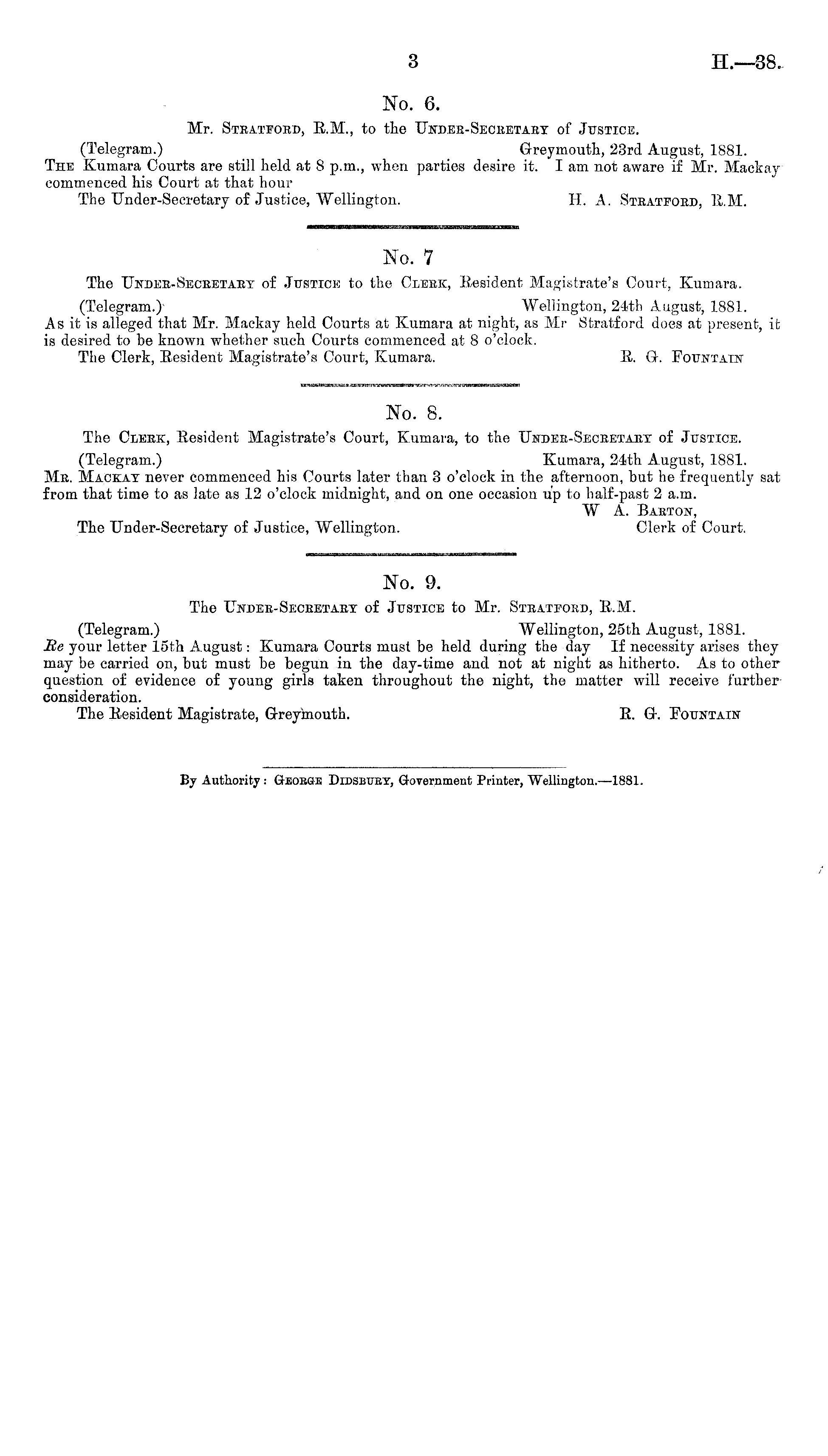 No. 8. The Cleee, Resident Magistrate's Court, Kumara, to the Under-Seceetaey of Justice. (Telegram.) Kumara, 24th August, 1881. Me. Mackay never commenced his Courts later than 3 o'clock in the afternoon, but he frequently sat from that time to as late as 12 o'clock midnight, and on one occasion up to half-past 2 a.m. W A. Baeton, The Under-Secretary of Justice, Wellington. Clerk of Court.