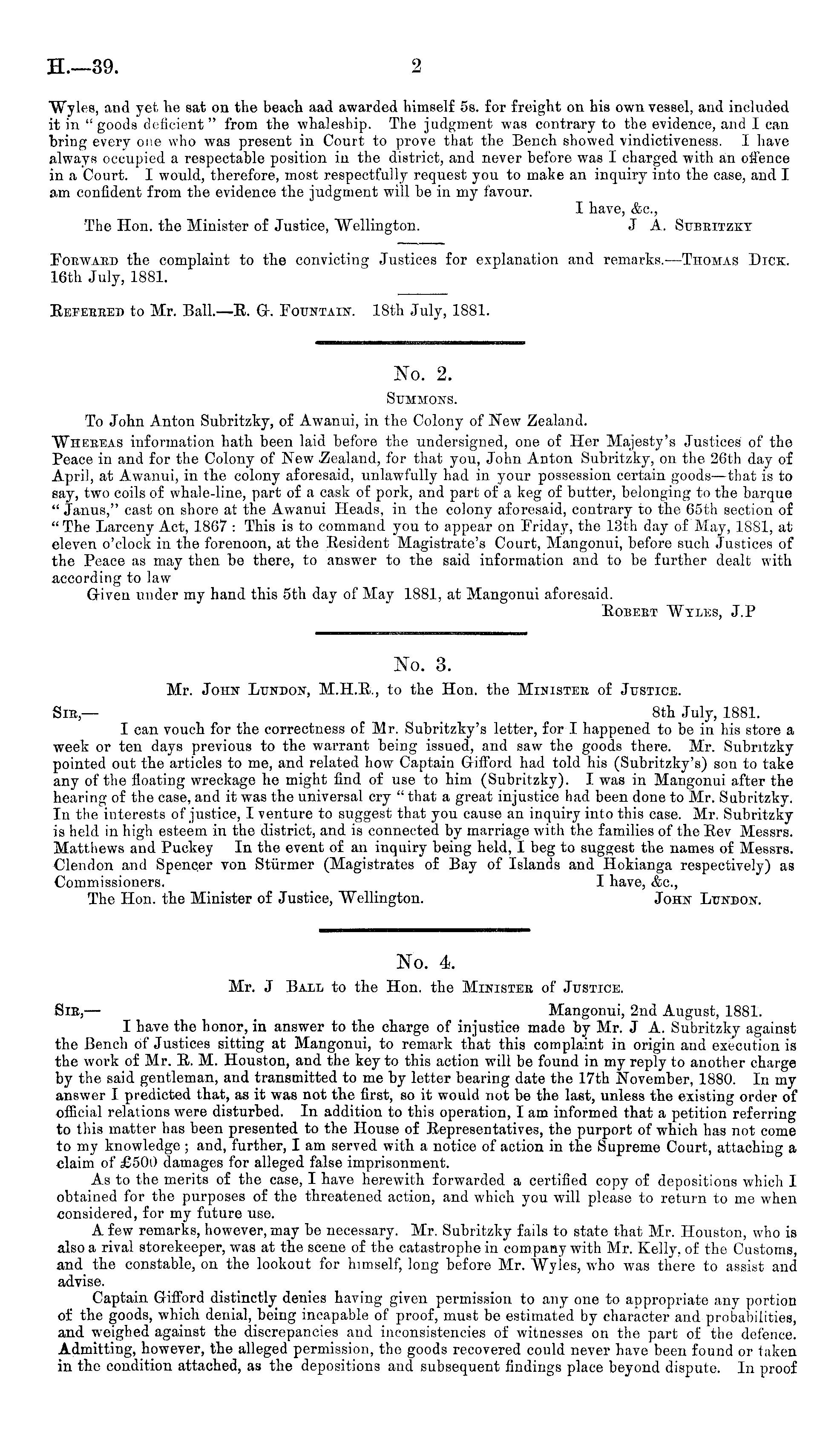 No. 3. Mr. John Lundon, M.H.R., to the Hon. the Ministee of Justice. Sib,— Bth July, 1881. I can vouch for the correctness of Mr. Subritzky's letter, for I happened to be in his store a week or ten days previous to the warrant being issued, and saw the goods there. Mr. Subritzky pointed out the articles to me, and related how Captain Gifford had told his (Subritzky's) son to take any of the floating wreckage he might find of use to him (Subritzky). I was in Mangonui after the hearing of the case, and it was the universal cry " that a great injustice had been done to Mr. Subritzky. In the interests of justice, I venture to suggest that you cause an inquiry into this case. Mr. Subritzky is held in high esteem in the district, and is connected by marriage with the families of the Rev Messrs. Matthews and Puckey In the event of an inquiry being held, I beg to suggest the names of Messrs. Clendon and Spencer von Sturmer (Magistrates of Bay of Islands and Hokianga respectively) as Commissioners. I have, &c, The Hon. the Minister of Justice, Wellington. John Lundon.