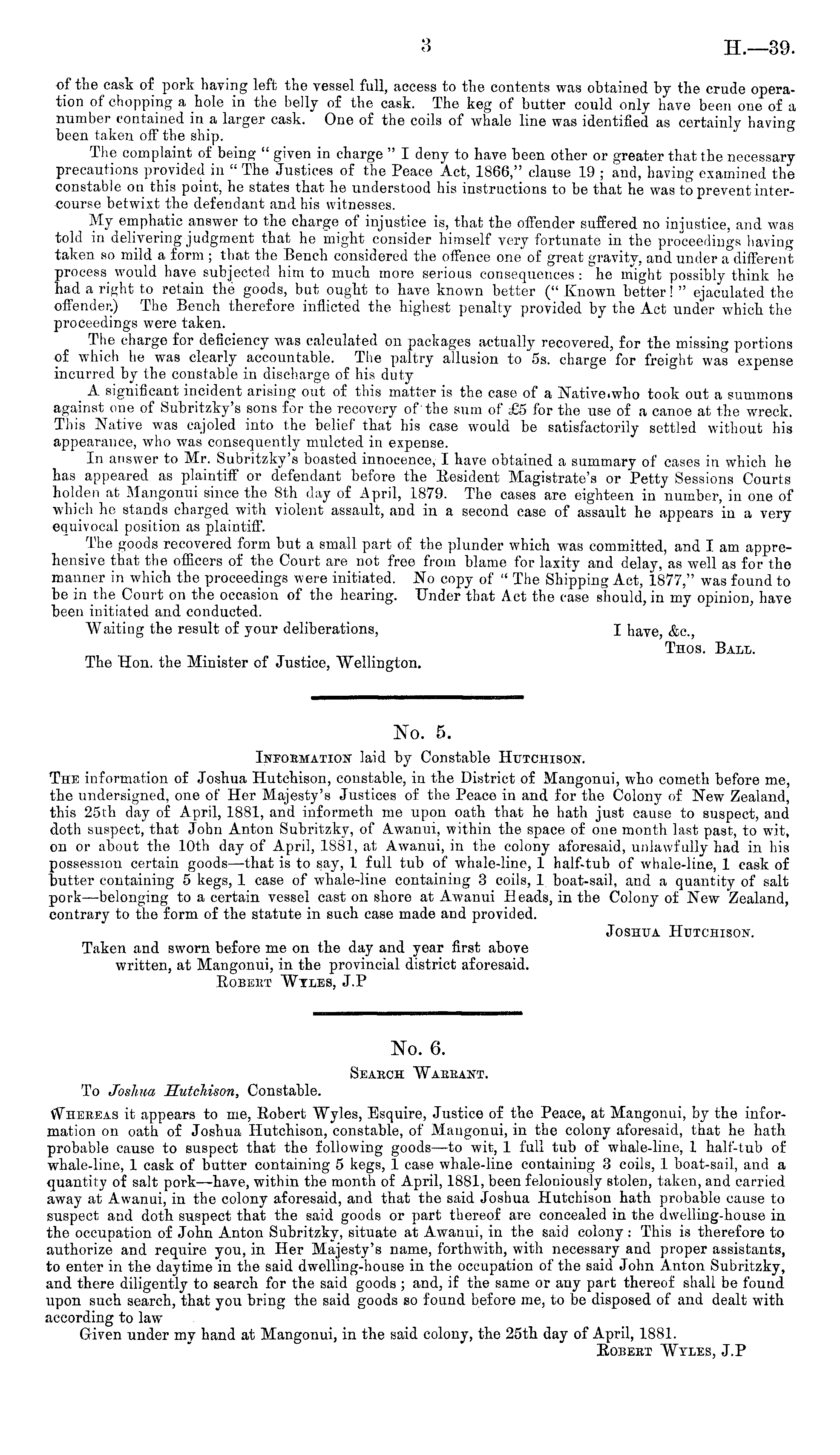 No. 5. Inpoemation laid by Constable Hutchison. The information of Joshua Hutchison, constable, in the District of Mangonui, who cometh before me, the undersigned, one of Her Majesty's Justices of the Peace in and for the Colony of New Zealand, this 25th day of April, 1881, and informeth me upon oath that he hath just cause to suspect, and doth suspect, that John Anton Subritzky, of Awanui, within the space of one month last past, to wit, on or about the 10th day of April, 1881, at Awanui, in the colony aforesaid, unlawfully had in his possession certain goods—that is to say, 1 full tub of whale-line, 1 half-tub of whale-line, 1 cask of butter containing 5 kegs, 1 case of whale-line containing 3 coils, 1 boat-sail, and a quantity of salt pork —belonging to a certain vessel cast on shore at Awanui Beads, in the Colony of New Zealand, contrary to the form of the statute in such case made and provided. Joshua Hutchison. Taken and sworn before me on the day and year first above written, at Mangonui, in the provincial district aforesaid. Robeet Wyles, J.P