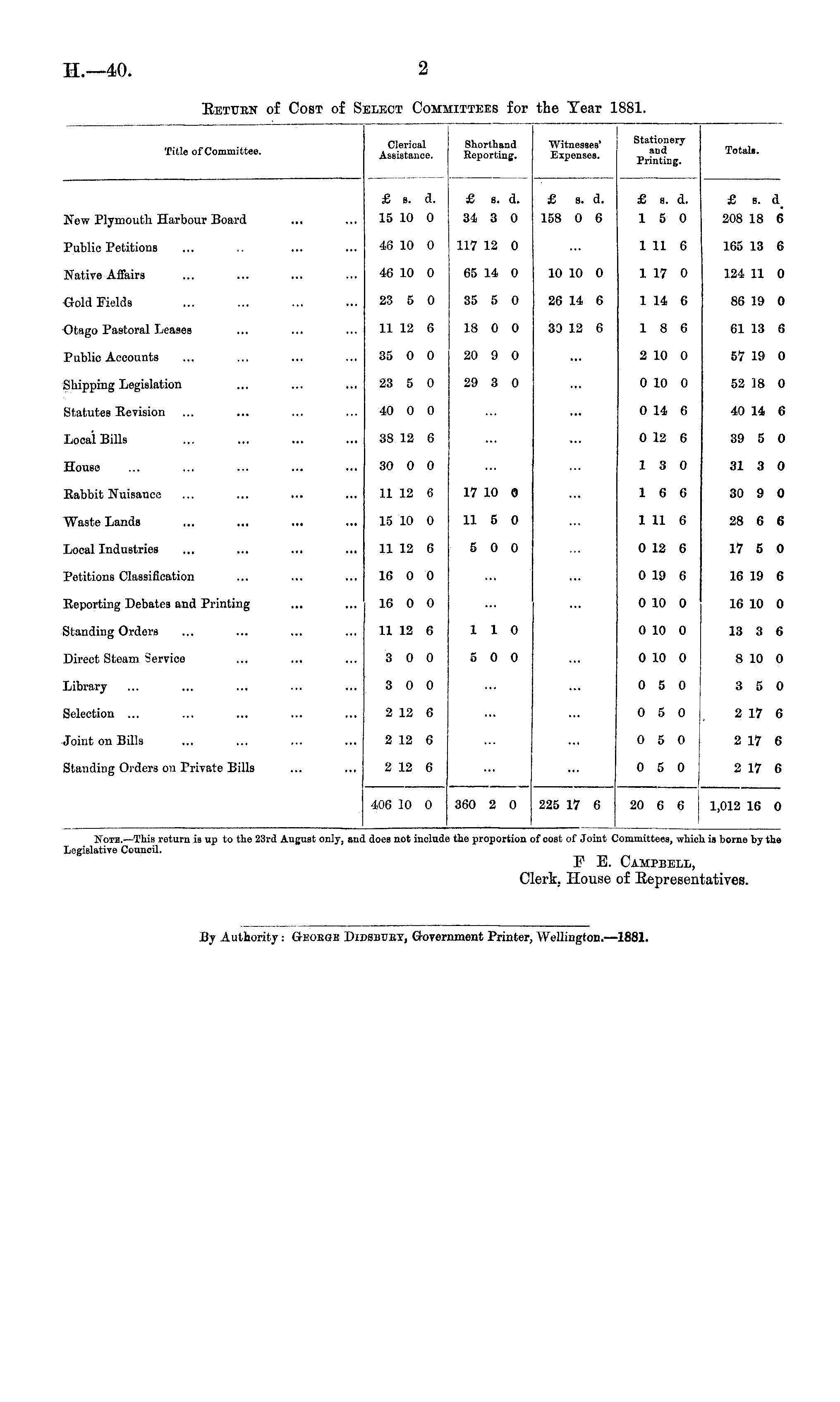 Title of Committee. Clerical Assistance. Shorthand Heporting. Witnesses' Expenses. Stationery and Printing. Totals. £ s. d. 15 10 0 £ s. d. 34 3 0 £ a. d. 158 0 6 £ s. d. 15 0 £ s. d 208 18 6 New Plymouth Harbour Board Public Petitions 48 10 0 117 12 0 1 11 6 165 13 6 Native Affairs 46 10 0 65 14 0 10 10 0 1 17 0 124 11 0 Gold Fields 23 5 0 35 5 0 26 14 6 1 14 6 86 19 0 Otago Pastoral Leases 11 12 6 18 0 0 33 12 6 18 6 61 13 6 Public Accounts 35 0 0 20 9 0 2 10 0 57 19 0 Shipping Legislation 23 5 0 29 3 0 0 10 0 52 18 0 Statutes Eevision 40 0 0 0 14 6 40 14 6 Local Bills 38 12 6 ... 0 12 6 39 5 0 House 30 0 0 13 0 31 3 0 Rabbit Nuisance 11 12 6 17 10 0 16 6 30 9 0 Waste Lands 15 10 0 11 5 0 1 11 6 28 6 6 Local Industries 11 12 6 5 0 0 0 12 6 17 5 0 Petitions Classification 16 0 0 0 19 6 16 19 6 Reporting Debates and Printing 16 0 0 0 10 0 16 10 0 Standing Orders 11 12 6 110 0 10 0 13 3 6 Direct Steam Service 3 0 0 5 0 0 0 10 0 8 10 0 Library 3 0 0 0 5 0 3 5 0 Selection ... 2 12 6 0 5 0 2 17 6 Joint on Bills 2 12 6 0 5 0 2 17 6 Standing Orders on Private Bills 2 12 6 0 5 0 2 17 6 406 10 0 360 2 0 225 17 6 20 6 6 1,012 16 0 Note.—This return is np to the 23rd August only, and doea not include the proportion of cost of Joint Committees, which is borne by the [ielatiye Council. Le,