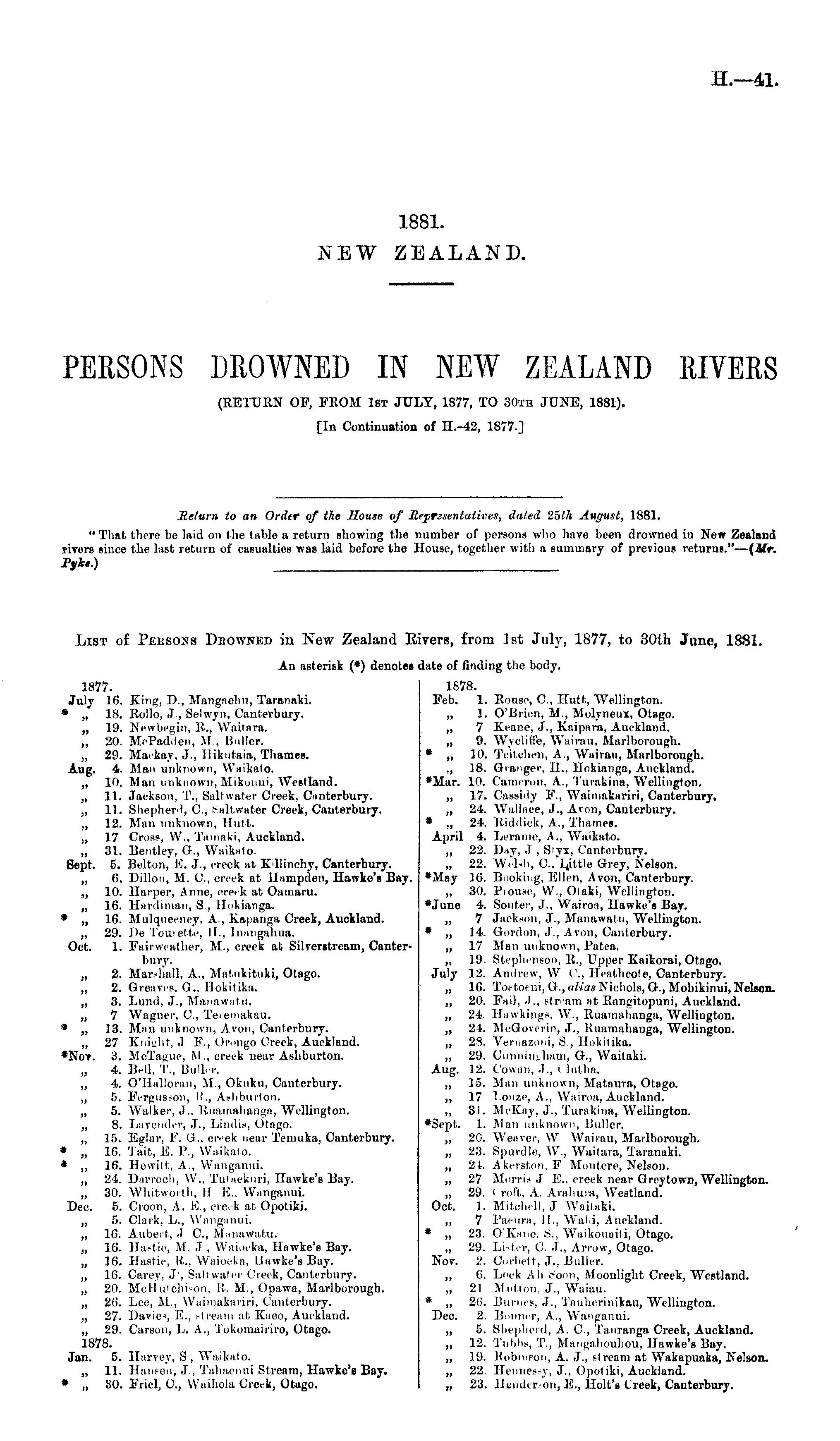 PERSONS DROWNED IN NEW ZEALAND RIVERS (RETURN OF, FROM 1st JULY, 1877, TO 30th JUNE, 1881). [In Continuation of H.-42, 1877.]