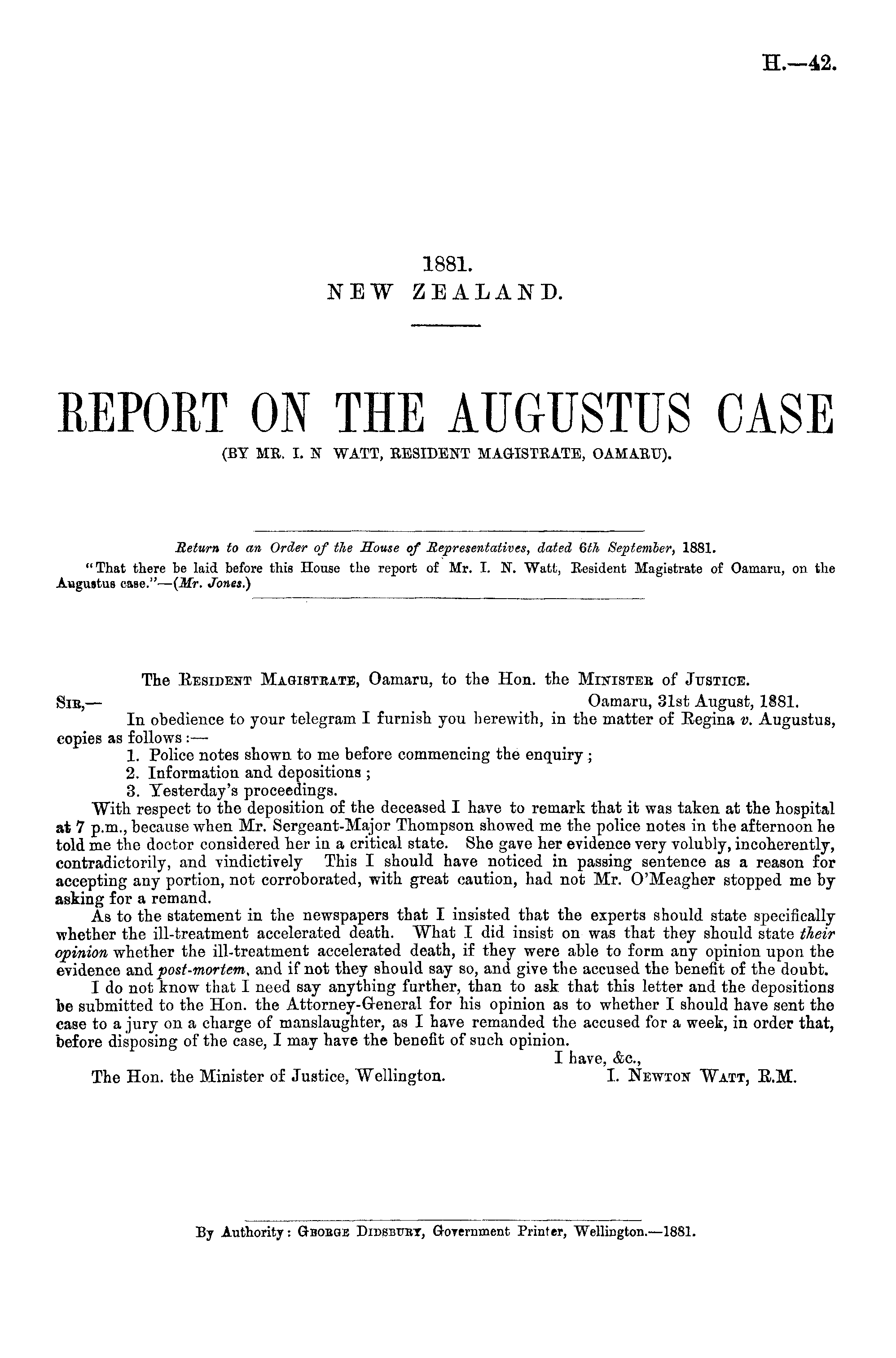 REPORT ON THE AUGUSTUS CASE (BY MR. I. N WATT, RESIDENT MAGISTRATE, OAMARU).
