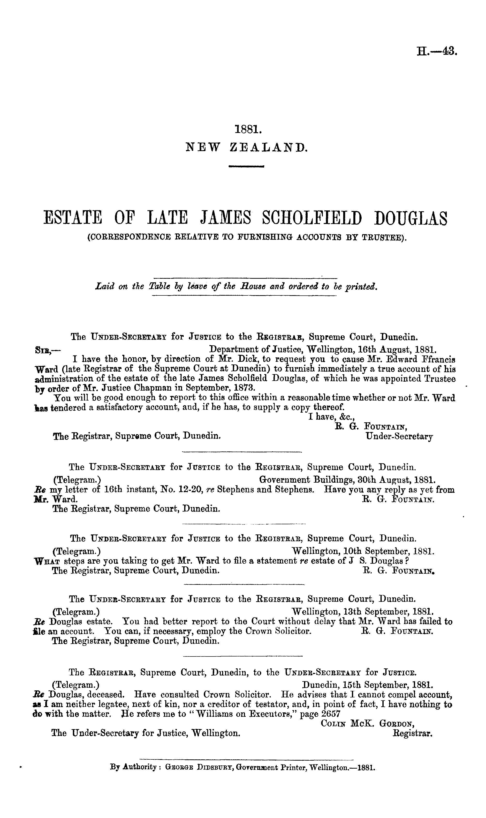 The TJnbeb-Secbetaby for Justice to the Rkgistbae, Supreme Court, Dunedin. Sib, — Department of Justice, "Wellington, 16th August, 1881. I have the honor, by direction of Mr. Dick, to request you to cause Mr. Edward Ffrancia Ward (late Registrar of the Supreme Court at Dunedin) to furnish immediately a true account of his administration of the estate of the late James Scholfield Douglas, of which he was appointed Trustee by order of Mr. Justice Chapman in September, 1873. You will be good enough to report to this office within a reasonable time whether or not Mr. "Ward las tendered a satisfactory account, and, if he has, to supply a copy thereof. I have, &c, R. G. Fountain, The Registrar, Supreme Court, Dunedin. Under-Secretary