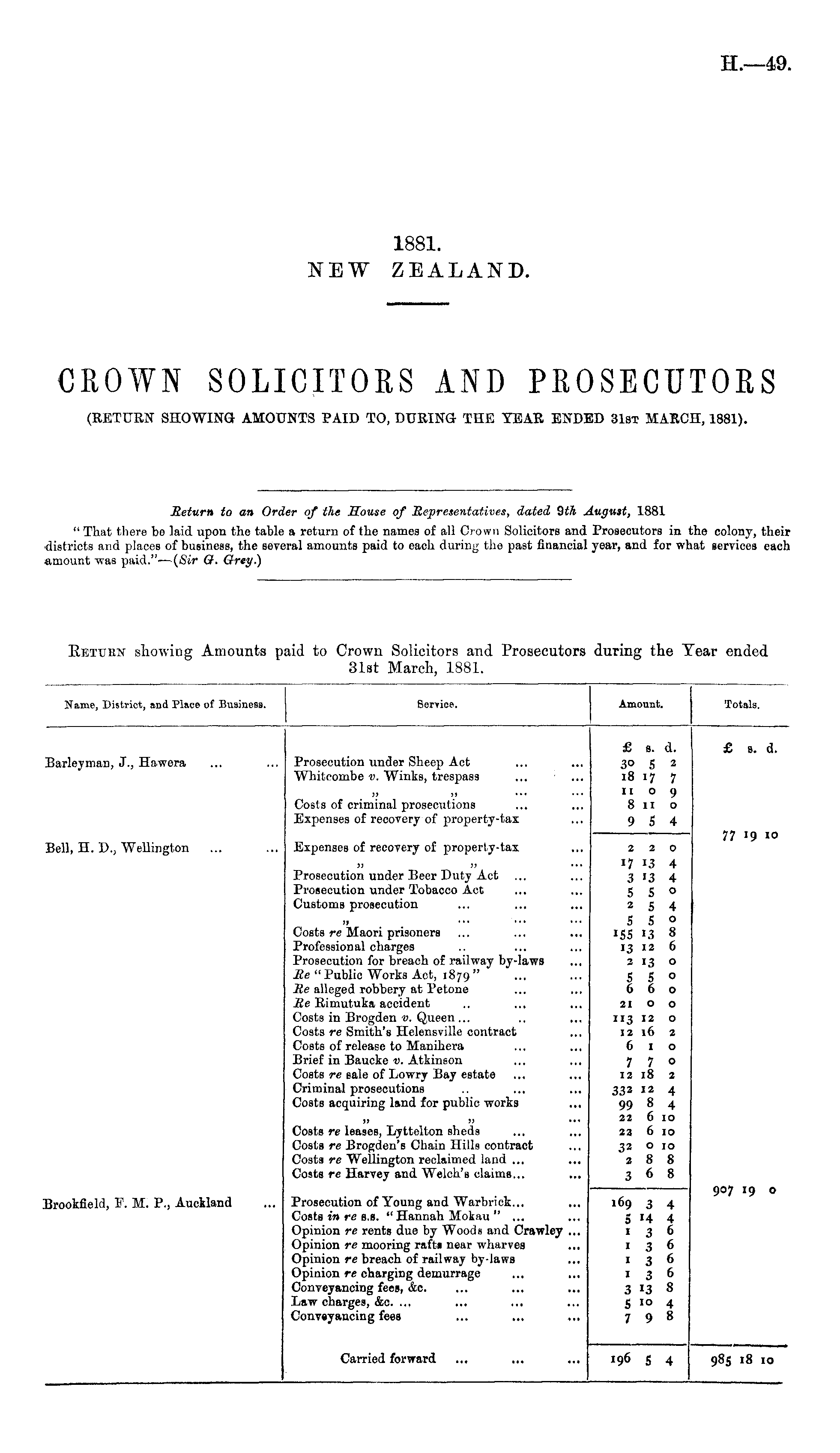 Name, District, and Place of BuaineBS. Service. Amount. Totals. Barleyman, J., Hawera Prosecution under Sheep Act Whiteombe v. Winks, trespass £ s. d. 3° S 2 18 17 7 11 09 8 11 o 9 S 4 £ s. d. Bell, H. D., Wellington Costs of criminal prosecutions Expenses of recovery of property-tax 77 19 10 Expenses of recovery of property-tax 220 I? 13 4 3 '3 4 S S ° 2 S 4 5 5° 155 >3 8 13 12 6 2 13 o S S ° 660 2100 Prosecution under Beer Duty Act Prosecution under Tobacco Act Customs prosecution ... ... ... Costs re Maori prisoners Professional charges Prosecution for breach of railway by-laws lie "Public Works Act, 1879" He alleged robbery at Petone Se Rimutuka accident Costs in Brogden v. Queen ... Costs re Smith's Helensville contract Costs of release to Manihera Brief in Baucke f. Atkinson ... ... Costs re sale of Lowry Buy estate Criminal prosecutions Costs acquiring land for public works ... 113 12 o 12 16 2 610 7 7 ° 12 18 2 3& 12 4 99 8 4 22 6 10 22 6 10 32 o 10 288 368 Costs re leases, Lyttelton Bheda Costs re Brogden's Chain Hills contract Costs re Wellington reclaimed land ... Costs re Harvey and Welch's claims... Prosecution of Young and Warbrick... Costs in re s.s. " Hannah Mokau " ... Opinion re rents due by Woods and Crawley ... Opinion re mooring raft» near wharves Opinion re breach of railway by-laws Opinion re charging demurrage Conveyancing fees, &c. Law charges, &c. ... Conveyancing fees ... ... ... 907 19 o Irookfield, F. M. P., Auckland 169 3 4 j>4 4 1 3 6 1 3 6 1 3 6 1 3 6 3 '3 8 S IO 4 7 9 8 Carried forward *96 5 4 985 18 10