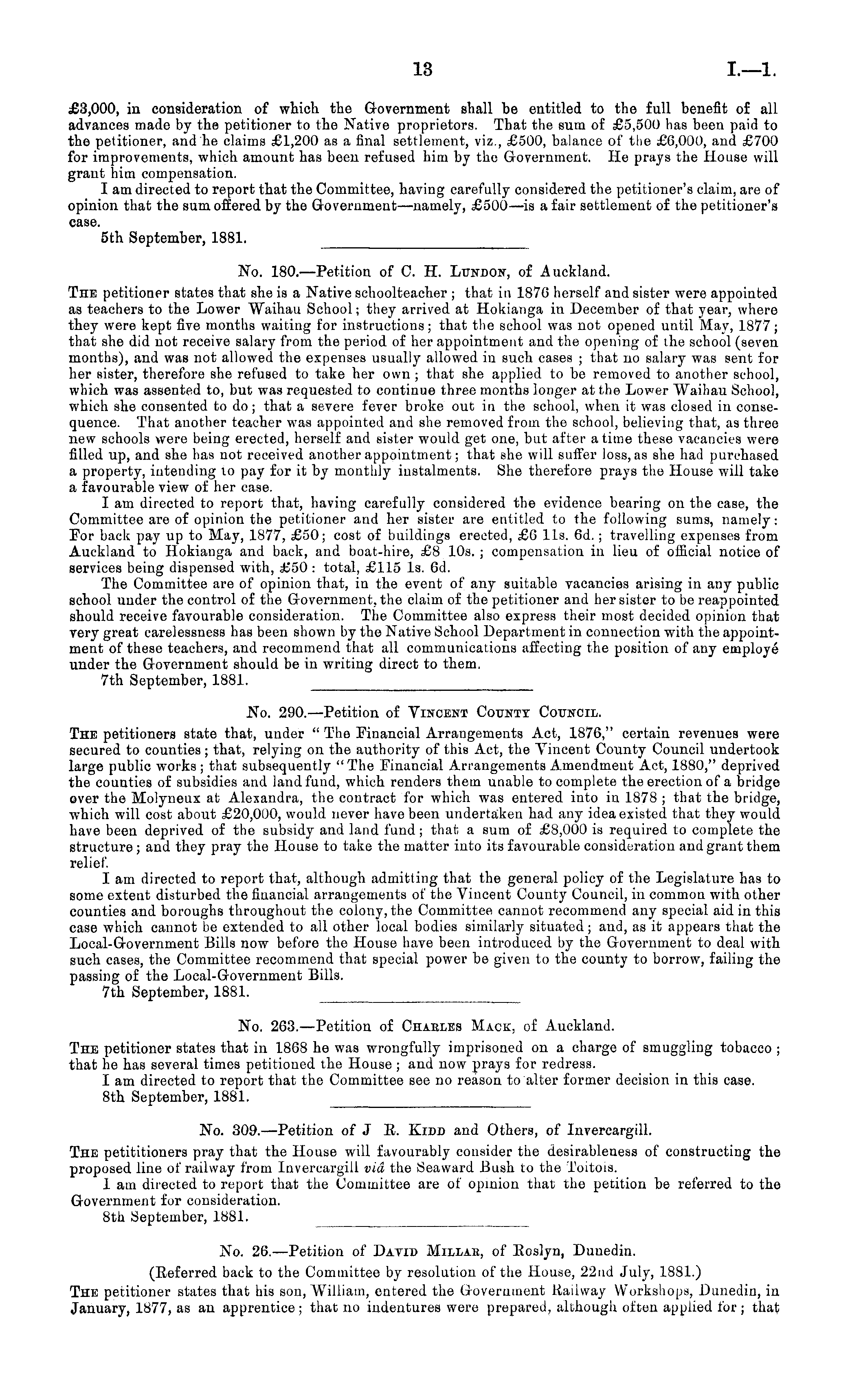 No. 26.—Petition of David Millar, of Koslyn, Dunedin. (Referred back to the Committee by resolution of the House, 22ud July, 1881.) The petitioner states that his son, William, entered the Government Railway Workshops, Dunedin, in January, 1877, as an apprentice; that no indentures were prepared, although often applied for; that