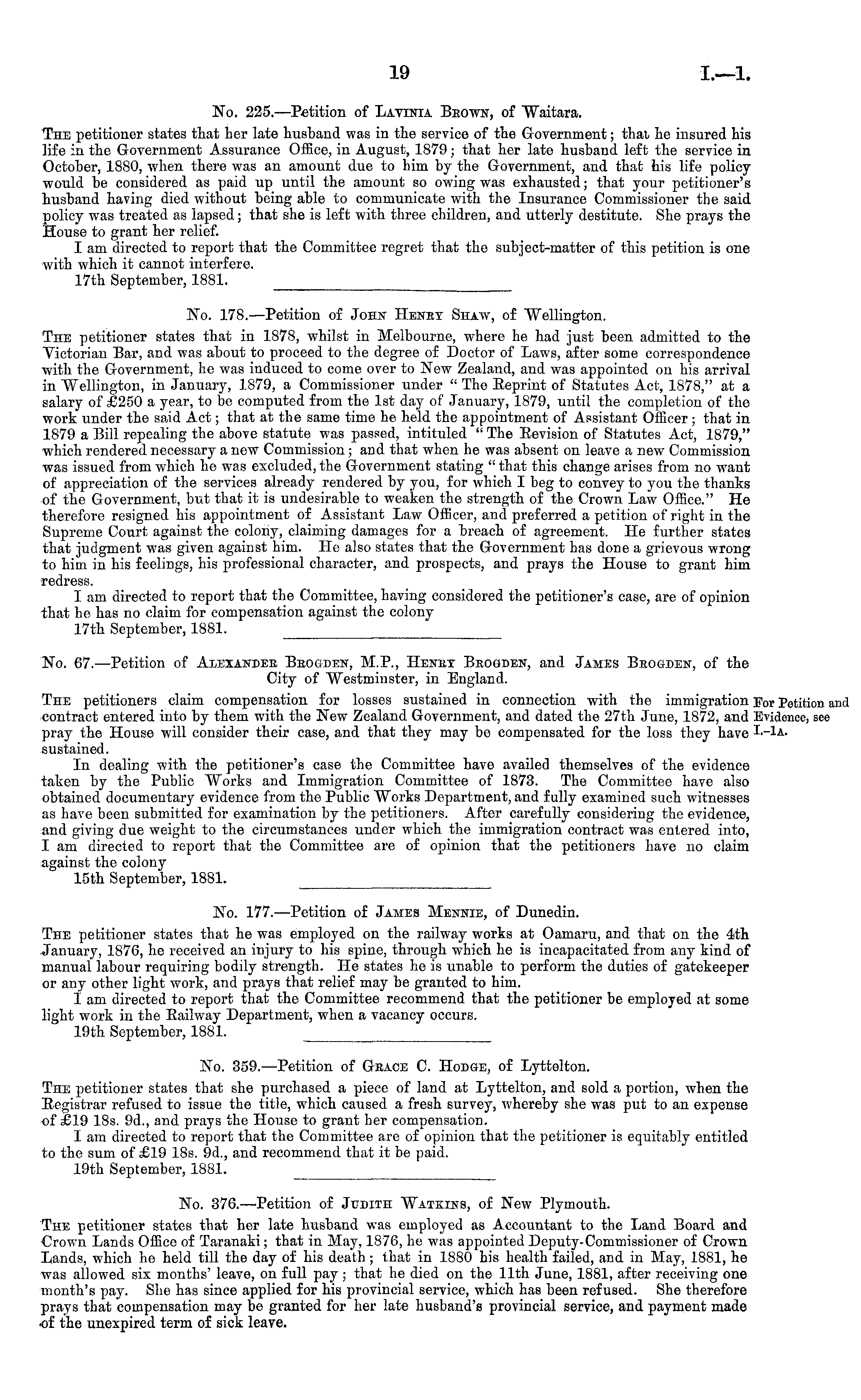 No. 178. —Petition of John Heney Shaw, of Wellington. The petitioner states that in 1878, whilst in Melbourne, where he had just been admitted to the Victorian Bar, and was about to proceed to the degree of Doctor of Laws, after some correspondence with the Government, he was induced to come over to New Zealand, and was appointed on his arrival in Wellington, in January, 1879, a Commissioner under " The Eeprint of Statutes Act, 1878," at a salary of £250 a year, to be computed from the Ist day of January, 1879, until the completion of the work under the said Act; that at the same time he held the appointment of Assistant Officer; that in 1879 a Bill repealing the above statute was passed, intituled " The Eevision of Statutes Act, 1879," which rendered necessary a new Commission; and that when he was absent on leave a new Commission was issued from which he was excluded, the Government stating " that this change arises from no want of appreciation of the services already rendered by you, for which I beg to convey to you the thanks of the Government, but that it is undesirable to weaken the strength of the Crown Law Office." He therefore resigned his appointment of Assistant Law Officer, and preferred a petition of right in the Supreme Court against the colony, claiming damages for a breach of agreement. He further states that judgment was given against him. He also states that the Government has done a grievous wrong to him in his feelings, his professional character, and prospects, and prays the House to grant him redress. I am directed to report that the Committee, having considered the petitioner's case, are of opinion that he has no claim for compensation against the colony 17th September, 1881.