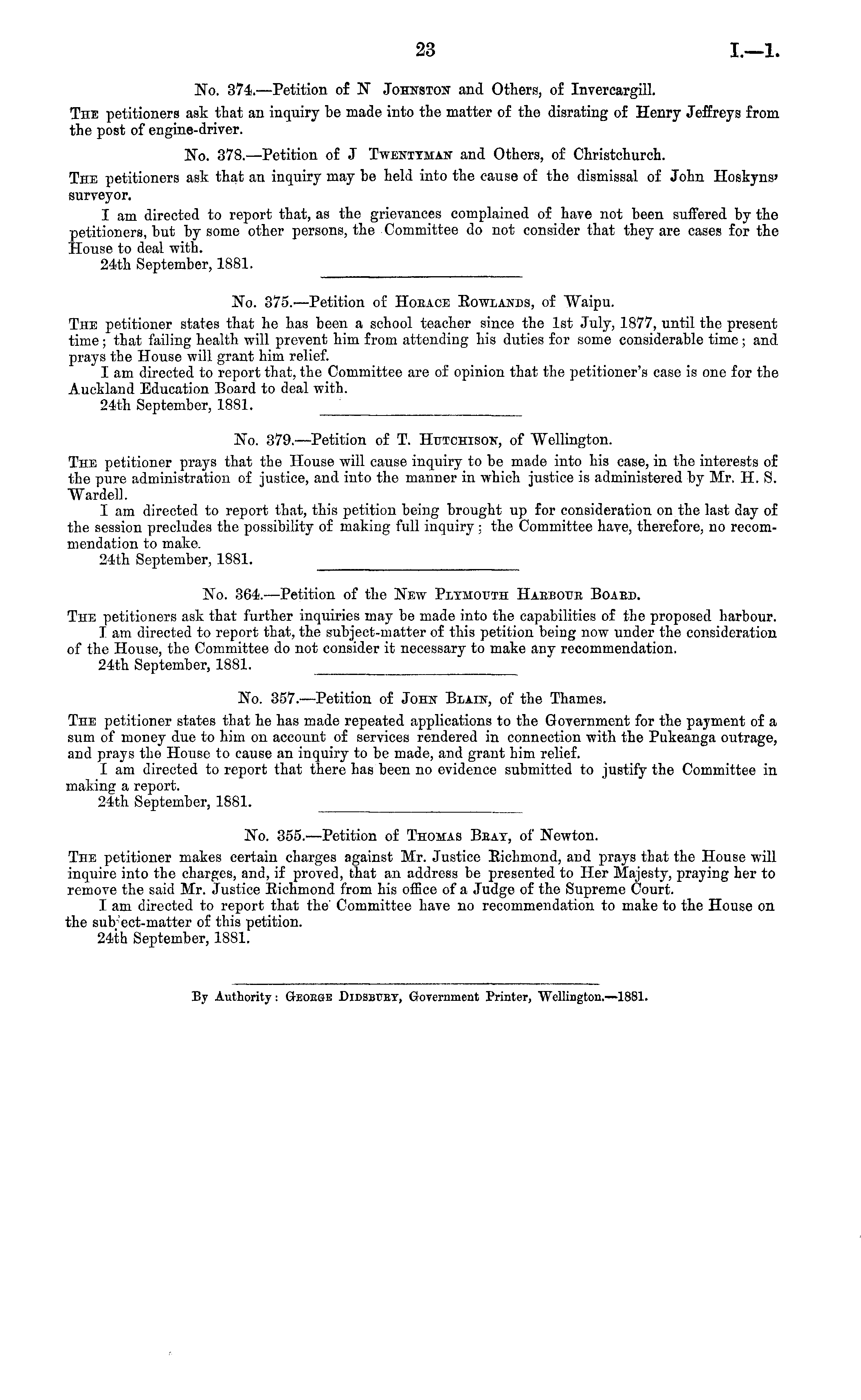 No. 374. —Petition of N Johnston and Others, of Invercargill. The petitioners ask that an inquiry be made into the matter of the disrating of Henry Jeffreys from the post of engine-driver. No. 378.—Petition of J Twentyman and Others, of Christchurch. The petitioners ask that an inquiry may be held into the cause of the dismissal of John Hoskyns' surveyor. I am directed to report that, as the grievances complained of have not been suffered by the petitioners, but by some other persons, the Committee do not consider that they are cases for the House to deal with. 24th September, 1881.