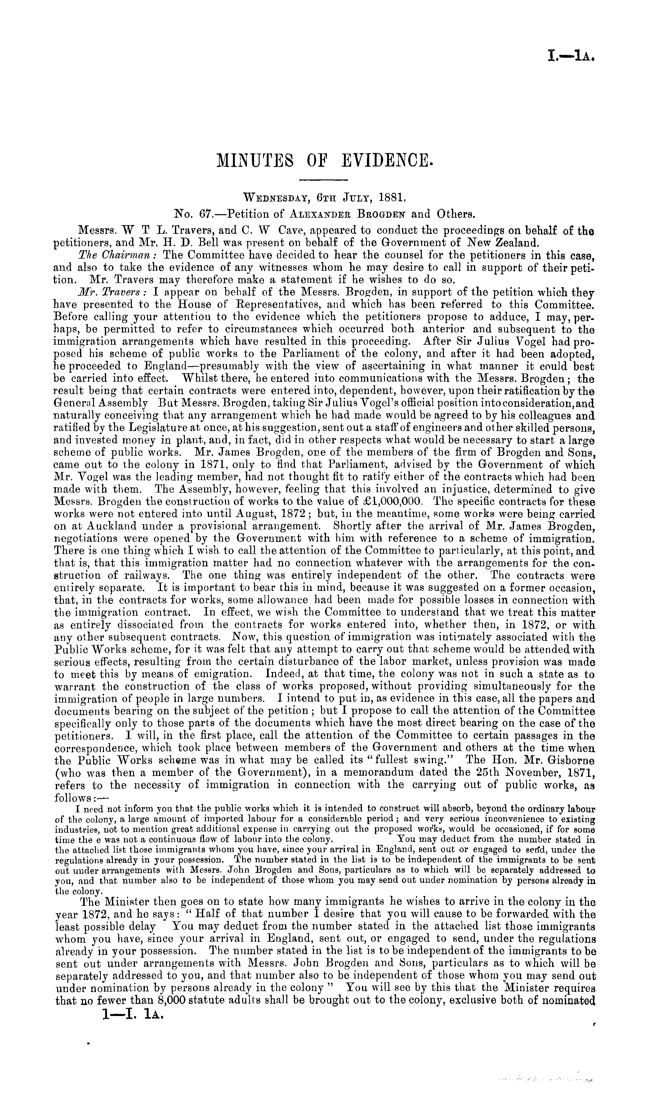 Wednesday, 6th July, 1881, No. 67. —Petition of Alexander Brogden and Others. Messrs. W T L. Travers, and 0. W Cave, appeared to conduct the proceedings on behalf of the petitioners, and Mr. H. D. Bell was present on behalf of the Government of New Zealand. The Chairman: The Committee have decided to hear the counsel for the petitioners in this case, and also to take the evidence of any witnesses whom he may desire to call in support of their petition. Mr. Travers may therefore make a statement if he wishes to do so. Mr. Travers : I appear on behalf of the Messrs. Brogden, in support of the petition which they have presented to the House of Representatives, and which has been referred to this Committee. Before calling your attention to the evidence which the petitioners propose to adduce, I may, perhaps, be permitted to refer to circumstances which occurred both anterior and subsequent to the immigration arrangements which have resulted in this proceeding. After Sir Julius Vogel had proposed his scheme of public works to the Parliament of the colony, and after it had been adopted, he proceeded to England—presumably with the view of ascertaining in what manner it could best be carried into effect. Whilst there, he entered into communications with the Messrs. Brogden ; the result being that certain contracts were entered into, dependent, however, upon their ratification by the General Assembly But Messrs. Brogden, taking Sir Julius Vogel's official position intoconsideration,and naturally conceiving that any arrangement which he had made would be agreed to by his colleagues and ratified by the Legislature at once, at his suggestion, sent out a staff of engineers and other skilled persons, and invested money in plant, and, in fact, did in other respects what would be uecessary to start a large scheme of public works. Mr. James Brogden, one of the members of the firm of Brogden and Sons, came out to the colony in 1871, only to find that Parliament, advised by the Government of which Mr. Vogel was the leading member, had not thought fit to ratify either of the contracts which had been made with them. The Assembly, however, feeling that this involved an injustice, determined to give Messrs. Brogden the construction of works to the value of £1,000,000. The specific contracts for these works were not entered into until August, 1872 ; but, in the meantime, some works were being carried on at Auckland under a provisional arrangement. Shortly after the arrival of Mr. James Brogden, negotiations were opened by the Government with him with reference to a scheme of immigration. There is one thing which I wish to call the attention of the Committee to particularly, at this point, and that is, that this immigration matter had no connection whatever with the arrangements for the construction of railways. The one thing was entirely independent of the other. The contracts were entirely separate. It is important to bear this in mind, because it was suggested on a former occasion, that, in the contracts for works, some allowance had been made for possible losses in connection with the immigration contract. In effect, we wish the Committee to understand that we treat this matter as entirely dissociated from the contracts for works entered into, whether then, in 1872, or with any other subsequent contracts. Now, this question of immigration was intimately associated with the Public Works scheme, for it was felt that any attempt to carry out that scheme would be attended with serious effects, resulting from the certain disturbance of the labor market, unless provision was made to meet this by means of emigration. Indeed, at that time, the colony was not in such a state as to warrant the construction of the class of works proposed, without providing simultaneously for the immigration of people in large numbers. I intend to put in, as evidence in this case, all the papers and documents bearing on the subject of the petition ; but I propose to call the attention of the Committee specifically only to those parts of the documents which have the most direct bearing on the case of the petitioners. I will, in the first place, call the attention of the Committee to certain passages in the correspondence, which took place between members of the Government and others at the time when the Public Works scheme was in what may be called its "fullest swing." The Hon. Mr. Gisborne (who was then a member of the Government), in a memorandum dated the 25th November, 1871, refers to the necessity of immigration in connection with the carrying out of public works, as follows: — I need not inform you that the public works which it is intended to construct will absorb, beyond the ordinary labour of the colony, a large amount of imported labour for a considerable period ; and very serious inconvenience to existing industries, not to mention great additional expense in carrying out the proposed works, would be occasioned, if for some time the c was not a continuous flow of labour into the colony. You may deduct from the number stated in the attached list those immigrants whom you have, since your arrival in England, sent out or engaged to serfd, under the regulations already in your possession. The number stated in the list is to be independent of the immigrants to be sent out under arrangements with Messrs. John Brogden and Sons, particulars as to which will be separately addressed to you, and that number also to be independent of those whom you may send out under nomination by persons already in the colony. The Minister then goes on to state how many immigrants he wishes to arrive in the colony in the year 1872, and he says: " Half of that number I desire that you will cause to be forwarded with the least possible delay You may deduct from the number stated in the attached list those immigrants whom you have, since your arrival in England, sent out, or engaged to send, under the regulations already in your possession. The numbe