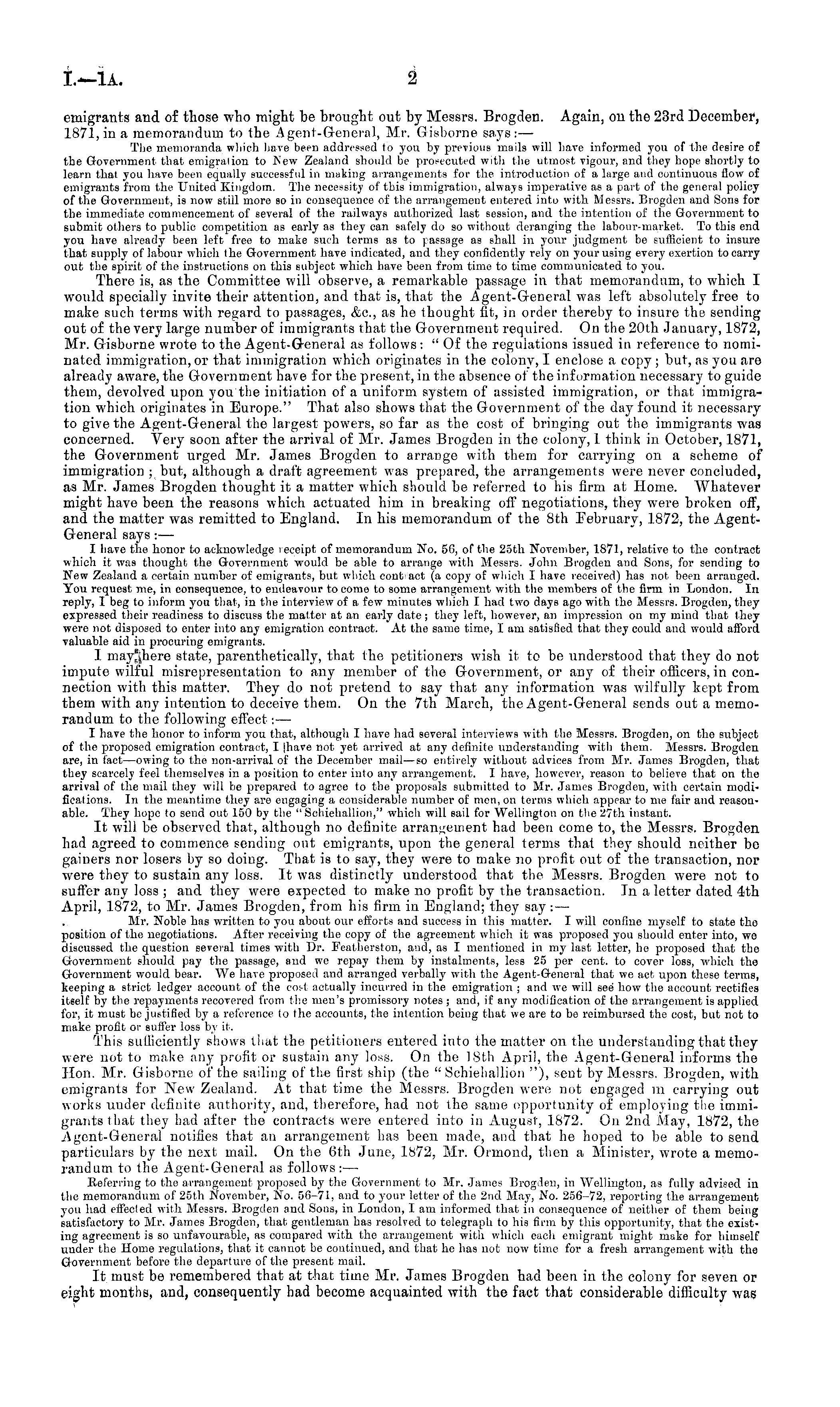 emigrants and of those who might be brought out by Messrs. Brogden. Again, on the 23rd December, 1871, in a memorandum to the Agent-General, Mr. Gisborne Says: —• The memoranda which have been addressed to you by previous mails will have informed you of the desire of the Government that emigration to New Zealand should be prosecuted witli the utmost vigour, and they hope shortly to learn that you have been equally successful in making arrangements for the introduction of a large and continuous flow of emigrants from the United Kingdom. The necessity of this immigration, always imperative as a part of the general policy of the Government, is now still more so in consequence of the arrangement entered into with Messrs. Brogden and Sons for the immediate commencement of several of the railways authorized last session, and the intention of the Government to submit others to public competition as early as they can safely do so without deranging tho labour-market. To this end you have already been left free to make such terms as to passage as shall in your judgment be sufficient to insure that supply of labour which the Government have indicated, and they confidently rely on your using every exertion to carry out the spirit of the instructions on this subject which have been from time to time communicated to you. There is, as the Committee will observe, a remarkable passage in that memorandum, to which I would specially invite their attention, and that is, that the Agent-General was left absolutely free to make such terms with regard to passages, &c, as he thought fit, in order thereby to insure the sending out of the very large number of immigrants that the Government required. On the 20th January, 1872, Mr. Gisborne wrote to the Agent-General as follows: "Of the regulations issued in reference to nominated immigration, or that immigration which originates in the colony, I enclose a copy; but, as you are already aware, the Government have for the present, in the absence of the information necessary to guide them, devolved upon you the initiation of a uniform system of assisted immigration, or that immigration which originates in Europe." That also shows that the Government of the day found it necessary to give the Agent-General the largest powers, so far as the cost of bringing out the immigrants was concerned. Very soon after the arrival of Mr. James Brogden in the colony, 1 think in October, 1871, the Government urged Mr. James Brogden to arrange with them for carrying on a scheme of immigration ; but, although a draft agreement was prepared, the arrangements were never concluded, as Mr. James Brogden thought it a matter which should be referred to his firm at Home. Whatever might have been the reasons which actuated him in breaking off negotiations, they were broken off, and the matter was remitted to England. In his memorandum of the Bth February, 1872, the AgentGeneral says : — I have the honor to acknowledge receipt of memorandum No. 56, of the 25th November, 1871, relative to tho contract which it was thought the Government would be able to arrange with Messrs. John Brogden and Sons, for sending to New Zealand a certain number of emigrants, but which cont act (a copy of which I have received) has not been arranged. You request me, in consequence, to endeavour to come to 6ome arrangement with the members of the firm in London. In reply, I beg to inform you that, in the interview of a few minutes which I had two days ago with the Messrs. Brogden, they expressed their readiness to discuss the matter at an early date; they left, however, an impression on my mind that they were not disposed to enter into any emigration contract. At the same time, lam satisfied that they could and would afford valuable aid in procuring emigrants. I may^here state, parenthetically, that the petitioners wish it to be understood that they do not impute wilful misrepresentation to any member of the Government, or any of their officers, in connection with this matter. They do not pretend to say that any information was wilfully kept from them with any intention to deceive them. On the 7th March, the Agent-General sends out a memorandum to the following effect: —■ I have the honor to inform you that, although I have had several interviews with the Messrs. Brogden, on the subject of the proposed emigration contract, I 'have not yet arrived at any definite understanding with them. Messrs. Brogden are, in fact —owing to the non-arrival of the December mail—so entirely without advices from Mr. James Brogden, that they scarcely feel themselves in a position to enter into any arrangement. I have, however, reason to believe that on the arrival of the mail they will be prepared to agree to the proposals submitted to Mr. James Brogden, with certain modifications. In the meantime they are engaging a considerable number of men, on terms which appear to me fair and reasonable. They hope to send out 150 by the " Sohiehallion," which will sail for Wellington on the 27th instant. It will be observed that, although no definite arrangement had been come to, the Messrs. Brogden had agreed to commence sending out emigrants, upon the general terms that they should neither be gainers nor losers by so doing. That is to say, they were to make no profit out of the transaction, nor were they to sustain any loss. It was distinctly understood that the Messrs. Brogden were not to suffer any loss ; and they wore expected to make no profit by the transaction. In a letter dated 4th April, 1872, to Mr. James Brogden, from his firm in England; they say : — Mr. Noble has written to you about our efforts and success in this matter. I will confine myself to state tho position of the negotiations. After receiving the copy of the agreement which it was proposed you should enter into, we discussed the question several times with Dr. I^eatherston, and, as I mentioned in my last letter, he proposed that tho Government should pay the passa
