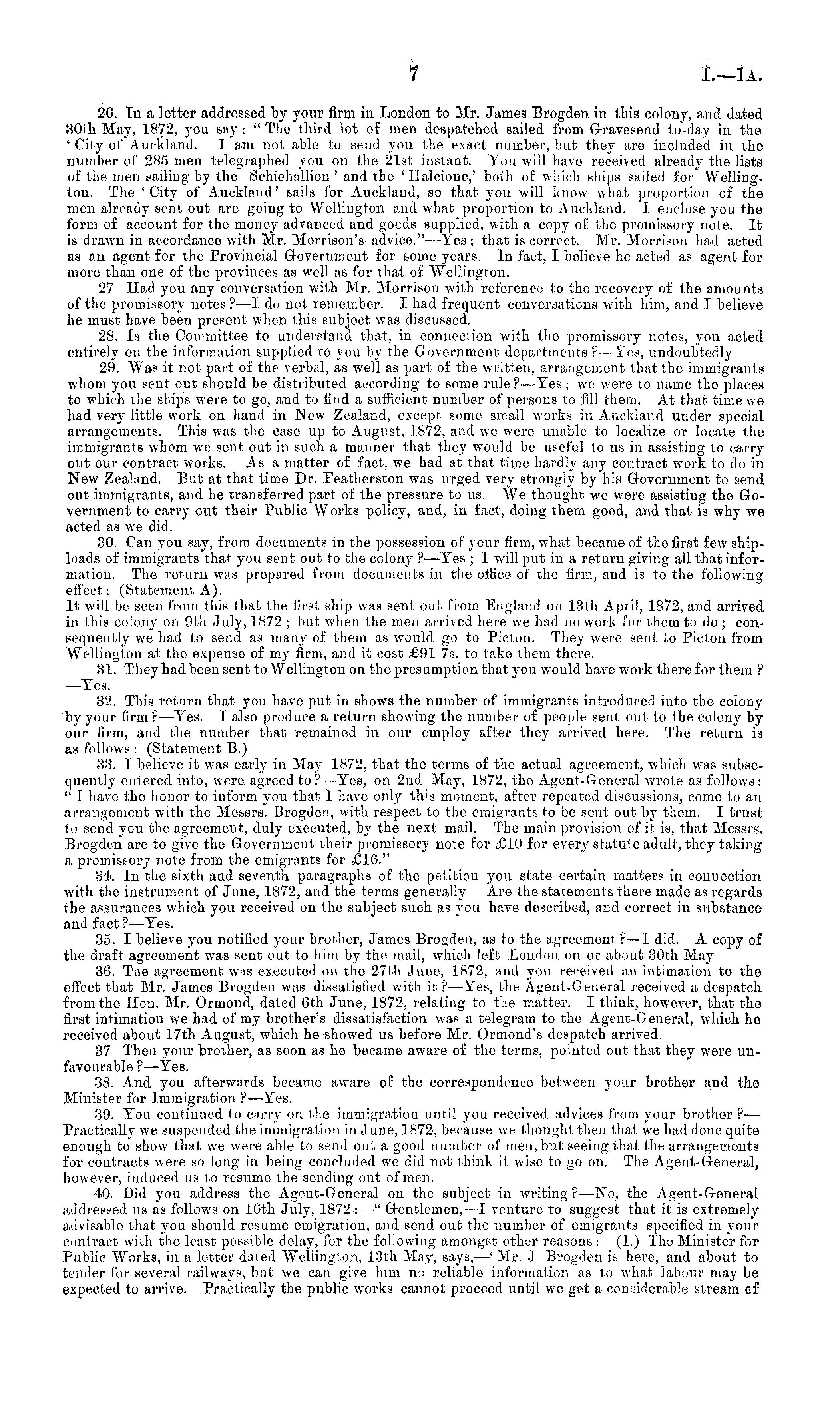 26. In a letter addressed by your firm in London to Mr. James Brogden in this colony, and dated 30th May, 1872, you say : " The ihird lot of men despatched sailed from G-ravesend to-day in the ' City of Auckland. lam not able to send you the exact number, but they are included in the number of 285 men telegraphed you on the 21st instant. You will have received already the lists of the men sailing by the Scbiehallion ' and the ' Halcione,' both of which ships sailed for Wellington. The 'City of Auckland' sails for Auckland, so that you will know what proportion of the men already sent out are going to Wellington and what proportion to Auckland. I enclose you the form of account for the money advanced and gocds supplied, with a copy of the promissory note. It is drawn in accordance with Mr. Morrison's advice." —Yes; that is correct. Mr. Morrison had acted as an agent for the Provincial Government for some years. In fact, I believe he acted as agent for more than one of the provinces as well as for that of Wellington. 27 Had you any conversation with Mr. Morrison with reference to the recovery of the amounts of the promissory notes ? —1 do not remember. I had frequent conversations with him, and I believe he must have been present when this subject was discussed. 28. Is the Committee to understand that, in connection with the promissory notes, you acted entirely on the information supplied to you by the Government departments ? —Yes, undoubtedly 29. Was it not part of the verbal, as well as part of the written, arrangement that the immigrants whom you sent out should be distributed according to some rule?— Yes; we were to name the places to which the ships were to go, and to find a sufficient number of persons to fill them. At that time we had very little work on hand in New Zealand, except some small works iv Auckland under special arrangements. This was the case up to August, 1872, and we were unable to localize or locate the immigrants whom we sent out in such a manner that they would be useful to us in assisting to carry out our contract works. As a matter of fact, we had at that time hardly any contract work to do in New Zealand. But at that time Dr. Featherston was urged very strongly by his Government to send out immigrants, and he transferred part of the pressure to us. We thought wo were assisting the Government to carry out their Public Works policy, and, in fact, doing them good, and that is why we acted as we did. 30. Can you say, from documents in the possession of your firm, what became of the first few shiploads of immigrants that you sent out to the colony ?—Yes ; I will put in a return giving all that information. The return was prepared from documents in the office of the firm, and is to the following effect: (Statement A). It will be seen from this that the first ship was sent out from England on 13th April, 1872, and arrived in this colony on 9th July, 1872 ; but when the men arrived here we had no work for them to do ; consequently we had to send as many of them as would go to Picton. They were sent to Picton from Wellington at the expense of my firm, and it cost £91 7s. to take them there. 31. They had been sent to Wellington on the presumption that you would have work there for them ? —Yes. 32. This return that you have put in shows the number of immigrants introduced into the colony by your firm ? —Yes. I also produce a return showing the number of people sent out to the colony by our firm, and the number that remained in our employ after they arrived here. The return is as follows : (Statement B.) 33. I believe it was early in May 1872, that the terms of the actual agreement, which was subsequently entered into, were agreed to? —Yes, on 2nd May, 1872, the Agent-General wrote as follows: " I have the honor to inform you that I have only this moment, after repeated discussions, come to an arrangement with the Messrs. Brogden, with respect to the emigrants to be sent out by them. I trust to send you the agreement, duly executed, by the next mail. The main provision of it is, that Messrs. Brogden are to give the Government their promissory note for £10 for every statute adult, they taking a promissory note from the emigrants for £16." 34. In the sixth and seventh paragraphs of the petition you state certain matters in connection with the instrument of June, 1872, and the terms generally Are the statements there made as regards the assurances which you received on the subject such as you have described, and correct in substance and fact ?—Yes. 35. I believe you notified your brother, James Brogden, as to the agreement?—l did. A copy of the draft agreement was sent out to him. by the mail, which left London on or about 30th Ma} r 36. The agreement was executed on the 27th June, 1872, and you received an intimation to the effect that Mr. James Brogden was dissatisfied with it? —Yes, the Agent-General received a despatch from the Hon. Mr. Ormond., dated 6th June, 1872, relating to the matter. I think, however, that the first intimation we had of my brother's dissatisfaction was a telegram to the Agent-General, which lie received about 17th August, which he showed us before Mr. Ormond's despatch arrived. 37 Then your brother, as soon as he became aware of the terms, pointed out that they were unfavourable ? —Yes. 38. And you afterwards became aware of the correspondence between your brother and the Minister for Immigration ? —Yes. 39. You continued to carry on the immigratioa until you received advices from your brother ?— Practically we suspended the immigration in June, 1872, because we thought then that we had done quite enough to show that we were able to send out a good number of men, but seeing that the arrangements for contracts were so long in being concluded we did not think it wise to go on. The Agent-General, however, induced us to resume the sending out of men. 40. Did you address the Agent-General on the subject in writing ?—No, 