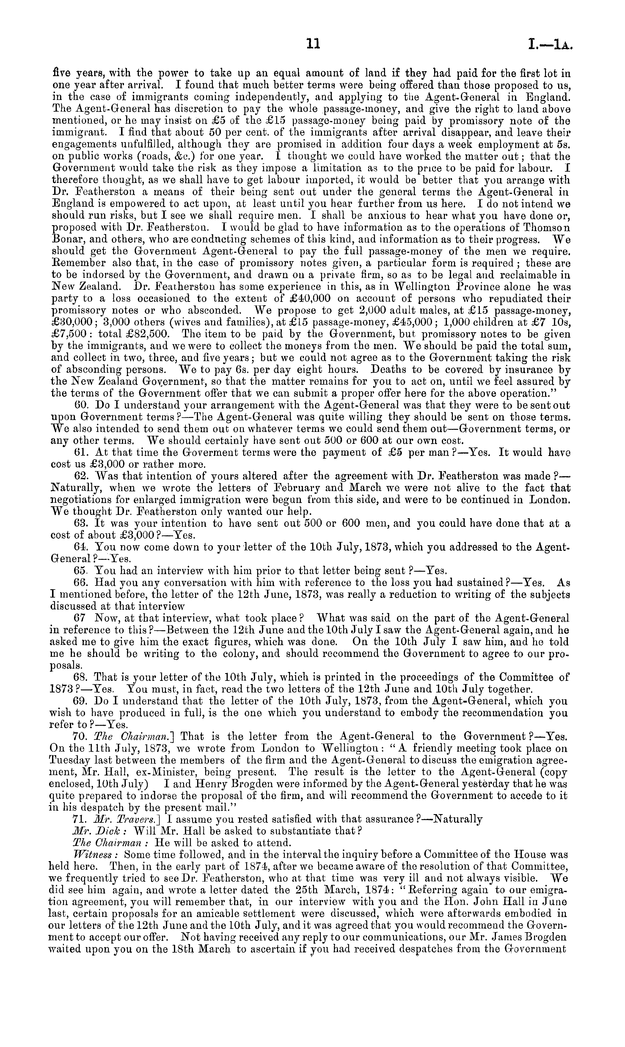 five years, with the power to take up an equal amount of land if they had paid for the first lot in one year after arrival. I found that much better terms were being offered than those proposed to us, in the case of immigrants coining independently, and applying to the Agent-General in England. The Agent-General has discretion to pay the whole passage-money, and give the right to land above mentioned, or he may insist on £5 of the £15 passage-money being paid by promissory note of the immigrant. I find that about 50 per cent, of the immigrants after arrival disappear, and leave their engagements unfulfilled, although they are promised in addition four days a week employment at ss. on public works (roads, &c.) for one year. I thought we could have worked the matter out; that the Government would take the risk as they impose a limitation as to the price to be paid for labour. I therefore thought, as we shall have to get labour imported, it would be better that you arrange with Dr. Featherston a means of their being sent out under the general terms the Agent-General in England is empowered to act upon, at least until you hear further from us here. Ido not intend we should run risks, but I see we shall require men. I shall be anxious to hear what you have done or, proposed with Dr. Featberstou. I would be glad to have information as to the operations of Thomson Bonar, and others, who are condncting schemes of this kind, and information as to their progress. We should get the Government Agent-General to pay the full passage-money of the men we require. Remember also that, in the case of promissory notes given, a particular form is required ; these are to be indorsed by the Government, and drawn on a private firm, so as to be legal and reclaimable in New Zealand. Dr. Featherstou has some experience in this, as in Wellington Province alone he was party to a loss occasioned to the extent of £40,000 on account of persons who repudiated their promissory notes or who absconded. We propose to get 2,000 adult males, at £15 passage-money, £30,000; 3,000 others (wives and families), at £L 5 passage-money, £45,000; 1,000 children at £7 10s, £7,500 : total £82,500. The item to be paid by the Government, but promissory notes to be given by the immigrants, and we were to collect the moneys from the men. We should be paid the total sum, and collect in two, three, and five years; but we could not agree as to the Government taking the risk of absconding persons. We to pay 6s. per day eight hours. Deaths to be covered by insurance by the New Zealand Government, so that the matter remains for you to act on, until we feel assured by the terms of the Government offer that we can submit a proper offer here for the above operation." 60. Do I understand your arrangement with the Agent-General was that they were to be sent out upon Government terms ? —The Agent-General was quite willing they should be sent on those terms. We also intended to send them out on whatever terms we could send them out —Government terms, or any other terms. We should certainly have sent out 500 or 600 at our own cost. 61. At that time the Goverment terms were the payment of £5 per man ?—Yes. It would have cost us £3,000 or rather more. 62. Was that intention of yours altered after the agreement with Dr. Featherston was made ? — Naturally, when we wrote the letters of February and March we were not alive to the fact that negotiations for enlarged immigration were begun from this side, and were to be continued in London. We thought Dr. Featherston only wanted our help. 63. It was your intention to have sent out 500 or 600 men, and you could have done that at a cost of about £3,000 ?—Tes. 64. You now come down to your letter of the 10th July, 1873, which you addressed to the AgentGeneral ?—Yes. 65. You had an interview with him prior to that letter being sent ? —Yes. 66. Had you any conversation with him with reference to the loss you had sustained ? —Yes. As I mentioned before, the letter of the 12th June, 1873, was really a reduction to writing of the subjects discussed at that interview 67 Now, at that interview, what took place ? What was said on the part of the Agent-General in reference to this? —Between the 12th June and the 10th July I saw the Agent-General again, and he asked me to give him the exact figures, which was done. On the 10th July I saw him, and ho told me he should be writing to the colony, and should recommend the Government to agree to our proposals. 68. That is your letter of the 10th July, which is printed in the proceedings of the Committee of 1873 ?—Yes. You must, in fact, read the two letters of the 12th June and 10th July together. 69. Do I understand that the letter of the 10th July, 1873, from the Agent-General, which you wish to have produced in full, is the one which you understand to embody the recommendation you refer to ?—Yes. 70. The Chairman.'] That is the letter from the Agent-General to the Government ? —Yes. On the 11th July, 1873, we wrote from London to Welliugtou: "A friendly meeting took place on Tuesday last between the members of the firm and the Agent-General to discuss the emigration agreement, Mr. Hall, ex-Minister, being present. The result is the letter to the Agent-General (copy enclosed, 10th July) I and Henry Brogden were informed by the Agent-General yesterday that he was quite prepared to indorse the proposal of the firm, and will recommend the Government to accede to it in his despatch by the present mail." 71. Mr. Travers.] I assume you rested satisfied with that assurance ?—Naturally Mr. Dick : Will Mr. Hall be asked to substantiate that ? The Chairman : He will be asked to attend. Witness : Some time followed, and in the interval the inquiry before a Committee of the House was held here. Then, in the early part of 1874, after we became aware of the resolution of that Committee, we frequently tried to see Dr. Featherston, who at that time was ver