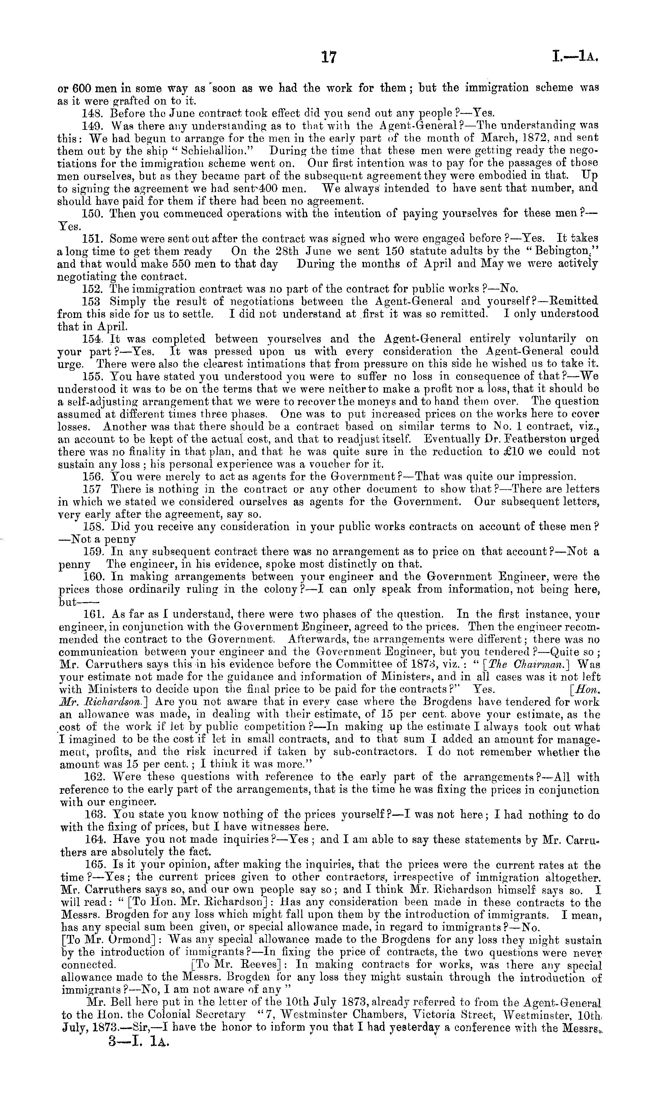 or 600 men in some way as "soon as we had the work for them; but the immigration scheme was as it were grafted on to it. 148. Before the June contract took effect did you send out any people ? —Yes. 149. Was there any understanding as to that with the Agent-General? —The understanding was this: We had begun to arrange for the men in the early part of the month of March, 1872, and sent them out by the ship " Schiehallion." During the time that these men were getting ready the negotiations for the immigration scheme went on. Our first intention was to pay for the passages of those men ourselves, but as they became part of the subsequent agreement they were embodied in that. TTp to signing the agreement we had sent 400 men. We always intended to have sent that number, and should have paid for them if there had been no agreement. 150. Then you commenced operations with the intention of paying yourselves for these men? — Yes. 151. Some were sent out after the contract was signed who were engaged before ? —Yes. It takes along time to get them ready On the 28th June we sent 150 statute adults by the " Bebington," and that would make 550 men to that day During the months of April and May we were actively negotiating the contract. 152. The immigration contract was no part of the contract for public works ? —No. 153 Simply the result of negotiations between the Agent-General and yourself?— Remitted from this side for us to settle. I did not understand at first it was so remitted. I only understood that in April. 154. It was completed between yourselves and the Agent-General entirely voluntarily on your part ? —Yes. It was pressed upon us with every consideration the Agent-General could urge. There were also the clearest intimations that from pressure on this side he wished us to take it. 155. You have stated you understood you were to suffer no loss in consequence of that ?—We understood it was to be on the terms that we were neither to make a profit nor a loss, that it should be a self-adjusting arrangement that we were to recover the moneys and to hand them over. The question assumed at different times three phases. One was to put increased prices on the works here to cover losses. Another was that there should be a contract based on similar terms to JNo. 1 contract, viz., an account to be kept of the actual cost, and that to readjust itself. Eventually Dr. Featherston urged there was no finality in that plan, and that he was quite sure in the reduction to £10 we could not sustain any loss ; his personal experience was a voucher for it. 156. You were merely to act as agents for the Government ? —That was quite our impression. 157 There is nothing in the contract or any other document to show that? —There are letters in which we stated we considered ourselves as agents for the Government. Our subsequent letters, very early after the agreement, say so. 158. Did you receive any consideration in your public works contracts on account of these men ? —Not a penny 159. In any subsequent contract there was no arrangement as to price on that account ?—Not a penny The engineer, in his evidence, spoke most distinctly on that. 160. In making arrangements between your engineer and the Government Engineer, were the prices those ordinarily ruling in the colony? —I can only speak from information, not being here, 161. As far as I understand, there were two phases of the question. In the first instance, your engineer, in conjunction with the Government Engineer, agreed to the prices. Then the engineer recommended the contract to the Government. Afterwards, tne arrangements were different; there was no communication between your engineer and the Government Engineer, but you tendered ? —Quite so ; Mr. Carruthei's says this in his evidence before the Committee of 1878, viz. : " [The Chairman.] Was your estimate not made for the guidance and information of Ministers, and in all cases was it not left with Ministers to decide upon the final price to be paid for the contracts?'' Yes. [lion. Mr. Richardson] Are you not aware that in every case where the Brogdens have tendered for work an allowance was made, in dealing with their estimate, of 15 per cent, above your estimate, as the cost of the work if let by public competition?—ln making up the estimate I always took out what I imagined to be the cost if let in small contracts, and to that sum I added an amount for management, profits, and the risk incurred if taken by sub-contractors. I do not remember whether the amount was 15 per cent.; I think it was more." 162. Were these questions with reference to the early part of the arrangements ? —All with reference to the early part of the arrangements, that is the time he was fixing the prices in conjunction with our engineer. 163. You state you know nothing of the prices yourself?—l was not here; I had nothing to do with the fixing of prices, but I have witnesses here. 164. Have you not made inquiries ?■—Yes ; and I am able to say these statements by Mr. Carruthers are absolutely the fact. 165. Is it your opinion, after making the inquiries, that the prices were the current rates at the time ? —Yes ; the current prices given to other contractors, irrespective of immigration altogether. Mr. Carruthers says so, and our own people say so ; and I think Mr. Richardson himself says so. I will read: " [To Hon. Mr. Richardson] : Has any consideration been made in these contracts to the Messrs. Brogden for any loss which might fall upon them by the introduction of immigrants. I mean, has any special sum been given, or special allowance made, in regard to immigrants?— No. [To Mr. Ormond] : Was any special allowance made to the Brogdens for any loss they might sustain by the introduction of immigrants? —In fixing the price of contracts, the two questions were never connected. [To Mr. Reeves] : In making contracts for works, was there any special allowance made to the Messrs. Brogden for an