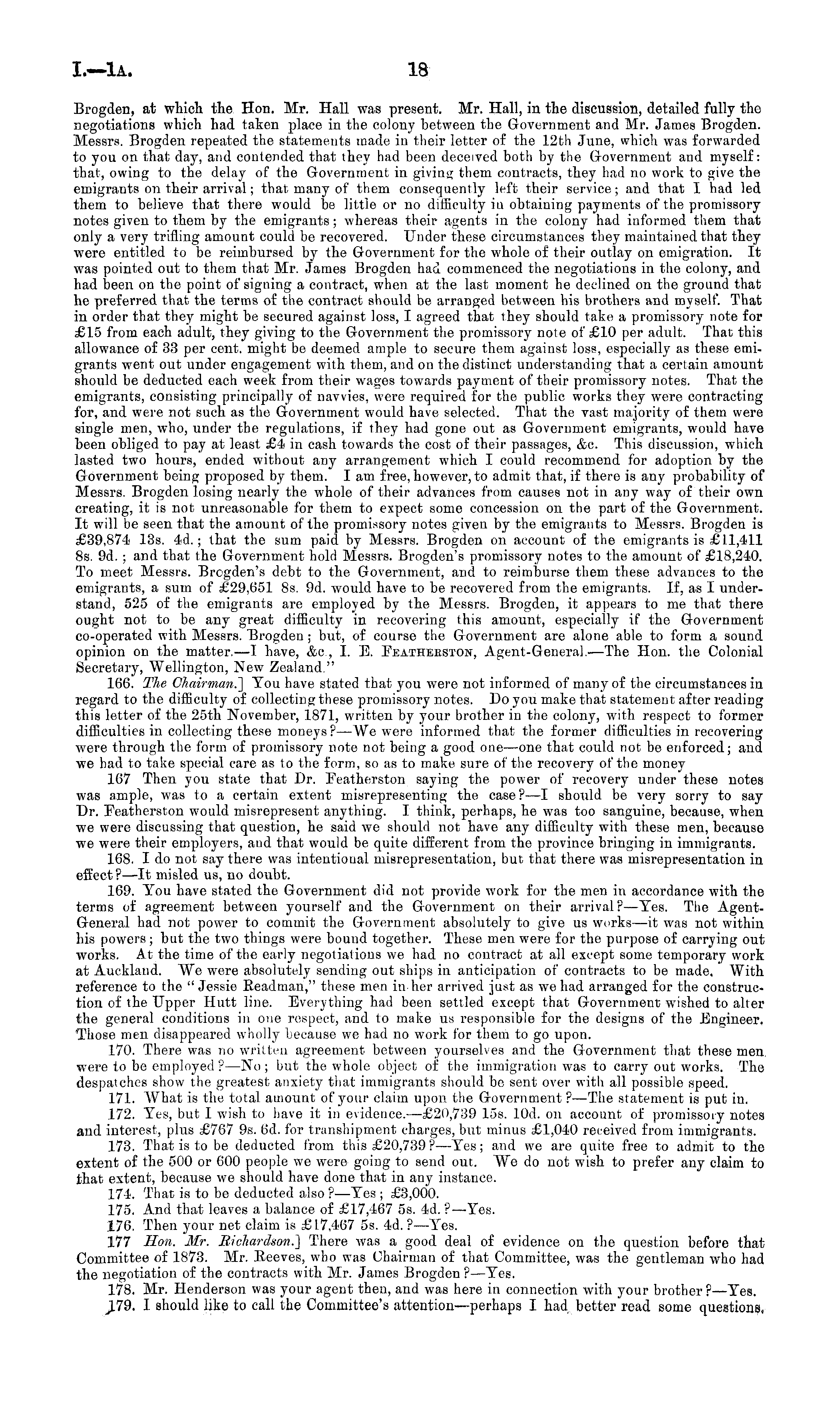 Brogden, at which the Hon. Mr. Hall was present. Mr. Hall, in the discussion, detailed fully the negotiations which had taken place in the colony between the Government and Mr. James Brogden. Messrs. Brogden repeated the statements made in their letter of the 12th June, which was forwarded to you on that day, and contended that they had been deceived both by the Government and myself: that, owing to the delay of the Government in giving them contracts, they had no work to give the emigrants on their arrival; that many of them consequently left their service; and that I had led them to believe that there would be little or no difficulty iv obtaining payments of the promissory notes given to them by the emigrants; whereas their agents in the colony had informed them that only a very trifling amount could be recovered. Under these circumstances they maintained that they were entitled to be reimbursed by the Government for the whole of their outlay on emigration. It was pointed out to them that Mr. James Brogden had commenced the negotiations in the colony, and had been on the point of signing a contract, when at the last moment he declined on the ground that he preferred that the terms of the contract should be arranged between his brothers and myself. That in order that they might be secured against loss, I agreed that they should take a promissory note for £15 from each adult, they giving to the Government the promissory note of £10 per adult. That this allowance of 33 per cent, might be deemed ample to secure them against loss, especially as these emigrants went out under engagement with them, and on the distinct understanding that a certain amount should be deducted each week from their wages towards payment of their promissory notes. That the emigrants, consisting principally of navvies, were required for the public works they were contracting for, and were not such as the Government would have selected. That the vast majority of them were single men, who, under the regulations, if ihey had gone out as Government emigrants, would have been obliged to pay at least £4 in cash towards the cost of their passages, &c. This discussion, which lasted two hours, ended without any arrangement which I could recommend for adoption by the Government being proposed by them. lam free, however, to admit that, if there is any probability of Messrs. Brogden losing nearly the whole of their advances from causes not in any way of their own creating, it is not unreasonable for them to expect some concession on the part of the Government. It will be seen that the amount of the promissory notes given by the emigrants to Messrs. Brogden is £39,874 13s. 4d.; that the sum paid by Messrs. Brogden on account of the emigrants is £11,411 Bs. 9d. ; and that the Government hold Messrs. Brogden's promissory notes to the amount of £18,240. To meet Messrs. Brogden's debt to the Government, and to reimburse them these advances to the emigrants, a sum of £29,651 Bs. 9d. would have to be recovered from the emigrants. If, as I understand, 525 of the emigrants are employed by the Messrs. Brogden, it appears to me that there ought not to be any great difficulty in recovering this amount, especially if the Government co-operated with Messrs. 'Brogden; but, of course the Government are alone able to form a sound opinion on the matter.—l have, &c, I. E. Featheestok, Agent-General.—The Hon. the Colonial Secretary, Wellington, New Zealand." 166. The Chairman.^ You have stated that you were not informed of many of the circumstances in regard to the difficulty of collecting these promissory notes. Do you make that statement after reading this letter of the 25th November, 1871, written by your brother in the colony, with respect to former difficulties in collecting these moneys ?—We were informed that the former difficulties in recovering were through the form of promissory note not being a good one—one that could not be enforced; and we had to take special care as to the form, so as to make sure of the recovery of the money 167 Then you state that Dr. Featherston saying the power of recovery under these notes was ample, was to a certain extent misrepresenting the case ? —I should be very sorry to say Dr. Featherston would misrepresent anything. I think, perhaps, he was too sanguine, because, when we were discussing that question, he said we should not have any difficulty with these men, because we were their employers, and that would be quite different from the province bringing in immigrants. 168. I do not say there was intentioual misrepresentation, but that there was misrepresentation in effect? —It misled us, no doubt. 169. You have stated the Government did not provide work for the men in accordance with the terms of agreement between yourself and the Government on their arrival? —Yes. The AgentGeneral had not power to commit the Government absolutely to give us works—it was not within his powers; but the two things were bound together. These men were for the purpose of carrying out works. At the time of the early negotiations we had no contract at all except some temporary work at Auckland. We were absolutely sending out ships in anticipation of contracts to be made. With reference to the "Jessie Eeadman," these men in her arrived just as we had arranged for the construction of the Upper Hutt line. Everything had been settled except that Government wished to alter the general conditions in one respect, and to make us responsible for the designs of the Engineer, Those men disappeared wholly because we had no work for them to go upon. 170. There was no written agreement between yourselves and the Government that these men. were to bo employed ? —No ; but the whole object of the immigration was to carry out works. The despatches show the greatest anxiety that immigrants should be sent over with all possible speed. 171. What is the total amount of your claim upon the Government ? —The statement is put in