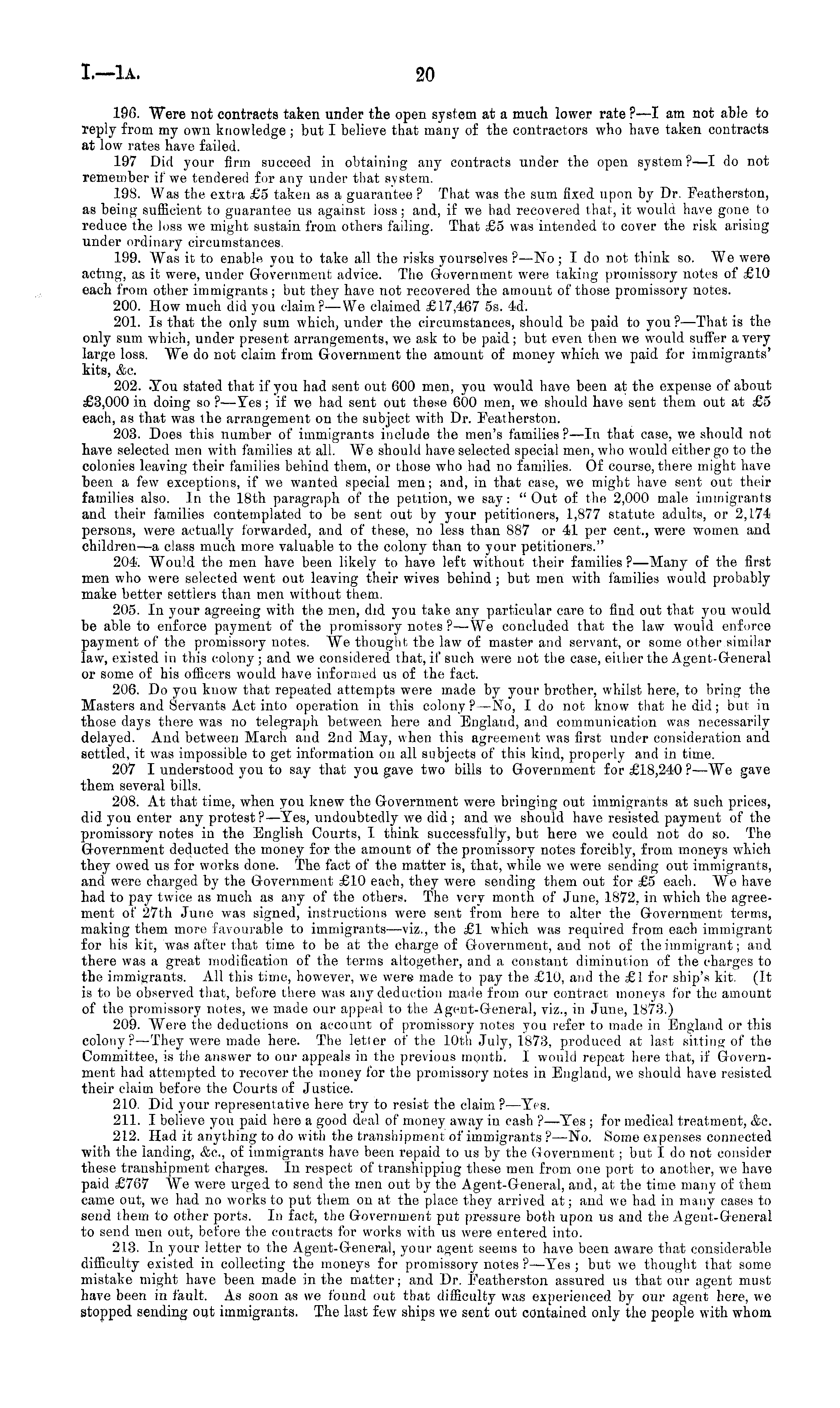 196. "Were not contracts taken under the open system at a much lower rate ? —I am not able to reply from my own knowledge ; but I believe that many of the contractors who have taken contracts at low rates have failed. 197 Did your firm succeed in obtaining any contracts under the open system?—l do not remember if we tendered for any under that system. 198. Was the extra £5 taken as a guarantee ? That was the sum fixed upon by Dr. Featherston, as being sufficient to guarantee us against ioss; and, if we had recovered that, it would have gone to reduce the loss we might sustain from others failing. That £5 was intended to cover the risk arising under ordinary circumstances. 199. Was it to enable you to take all the risks yourselves ?—No ; Ido not think so. We were acting, as it were, under Government advice. The Government were taking promissory notes of £10 each from other immigrants ; hut they have not recovered the amount of those promissory notes. 200. How much did you claim ?—We claimed £L 7,467 ss. 4d. 201. Is that the only sum which, under the circumstances, should be paid to you?— That is the only sum which, under present arrangements, we ask to be paid; but even then we would suffer a very large loss. We do not claim from Government the amount of money which we paid for immigrants' kits, &c. 202. -You stated that if you had sent out 600 men, you would have been at the expense of about £3,000 in doing so ?—Yes; if we had sent out these 600 men, we should have sent them out at £5 each, as that was the arrangement on the subject with Dr. Featherston. 203. Does this number of immigrants include the men's families? —In that case, we should not have selected men with families at all. We should have selected special men, who would either go to the colonies leaving their families behind them, or those who had no families. Of course, there might have been a few exceptions, if we wanted special men; and, in that case, we might have sent out their families also. In the 18th paragraph of the petition, we say: "Out of the 2,000 male immigrants and their families contemplated to be sent out by your petitioners, 1,877 statute adults, or 2,174 persons, were actually forwarded, and of these, no less than 887 or 41 per cent., were women and children—a class much more valuable to the colony than to your petitioners." 204. Would the men have been likely to have left without their families ?—Many of the first men who were selected went out leaving their wives behind ; but men with families would probably make better settlers than men without them. 205. In your agreeing with the men, did you take any particular care to find out that you would be able to enforce payment of the promissory notes ? —We concluded that the law would enforce payment of the promissory notes. We thought the law of master and servant, or some other similar law, existed in this colony; and we considered that, if such were not the case, either the Agent-General or some of his officers would have informed us of the fact. 206. Do you know that repeated attempts were made by your brother, whilst here, to bring the Masters and Servants Act into operation in this colony?—No, I do not know that he did; but in those days there was no telegraph between here and England, and communication was necessarily delayed. And between March and 2nd May, when this agreement was first under consideration and settled, it was impossible to get information on all subjects of this kind, properly and in time. 207 I understood you to say that you gave two bills to Government for £18,240 ? —We gave them several bills. 208. At that time, when you knew the Government were bringing out immigrants at such prices, did you enter any protest?— Yes, undoubtedly we did; and we should have resisted payment of the promissory notes in the English Courts, I think successfully, but here we could not do so. The Government deducted the money for the amount of the promissory notes forcibly, from moneys which they owed us for works done. The fact of the matter is, that, while we were sending out immigrants, and were charged by the Government £10 each, they were sending them out for £5 each. We have had to pay twice as much as any of the others. The very month of June, 1872, in which the agreement of 27th June was signed, instructions were sent from here to alter the Government terms, making them morn favourable to immigrants—viz., the £1 which was required from each immigrant for his kit, was after that time to be at the charge of Government, and not of the immigrant; and there was a great modification of the terms altogether, and a constant diminution of the charges to the immigrants. All this time, however, we were made to pay the £10, and the £1. for ship's kit. (It is to be observed that, before there was any deduction made from our contract moneys for the amount of the promissory notes, we made our appeal to the Agent-General, viz., in June, 1873.) 209. Were the deductions on account of promissory notes you refer to made in England or this colony? —They were made here. The letter of the 10th July, 1873, produced at last sitting of the Committee, is the answer to our appeals in the previous month. 1 would repeat here that, if Government had attempted to recover the money for the promissory notes in England, we should have resisted their claim before the Courts of Justice. 210. Did your representative here try to resist the claim ? —Yes. 211. I believe you paid here a good deal of money away in cash ?—Yes ; for medical treatment, &c. 212. Had it anything to do with the transhipment of immigrants ? —No. Some expenses connected with the landing, &c, of immigrants have been repaid to us by the Government ; but I do not consider these transhipment charges. In respect of transhipping these men from one port to another, we have paid £767 We were urged, to send the men out by the Agent-General, and, at the time many of them came ou