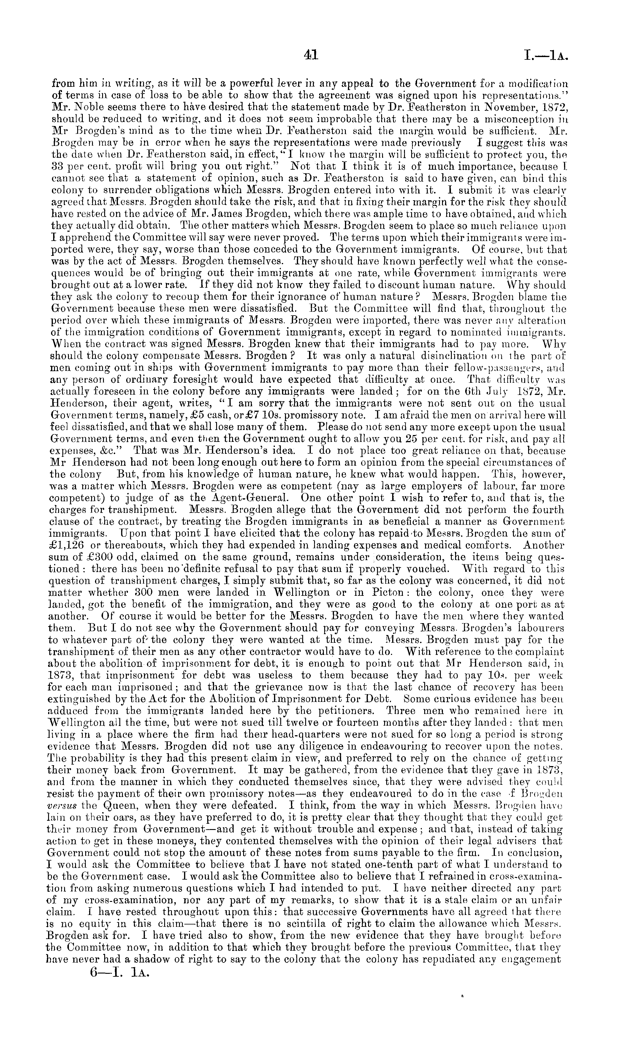 from him in writing, as it will be a powerful lever in any appeal to the Government for a modification of terms in case of loss to be able to show that the agreement was signed upon his representations." Mr. Noble seems there to have desired that the statement made by Dr. Featherston in November, 1872, should be reduced to writing, and it does not seem improbable tiiat there may be a misconception in Mr Brogden's mind as to the time when Dr. Featherston said the margin would be sufficient. Mr. Brogden may be in error when he says the representations were made previously I suggest this was the date when Dr. Featherston said, in effect," I know the margin will be sufficient to protect you, the 33 per cent, profit will bring you out right." Not that I think it is of much importance, because I cannot see that a statement of opinion, such as Dr. Eeatherston is said to have given, can bind this colony to surrender obligations which Messrs. Brogden entered into with it. I submit it was clearly agreed that Messrs. Brogden should take the risk, and that in fixing their margin for the risk they should have rested on the advice of Mr. James Brogden, which there was ample time to have obtained, and which they actually did obtain. The other matters which Messrs. Brogden seem to place so much reliance upon I apprehend the Committee will say were never proved. The terras upon which their immigrants were imported were, they say, worse than those conceded to the Government immigrants. Of course, but that was by the act of Messrs. Brogden themselves. They should have known perfectly well what the consequences would be of bringing out their immigrants at one rate, while Government immigrants were brought out at a lower rate. If they did not know they failed to discount human nature. Why should they ask the colony to recoup them for their ignorance of human nature? Messrs. Brogden blame the Government because these men were dissatisfied. But the Committee will find that, throughout the period over which these immigrants of Messrs. Brogden were imported, there was never any alteration of the immigration conditions of Government immigrants, except in regard to nominated immigrants. When the contract was signed Messrs. Brogden knew that their immigrants had to pay more. Why should the colony compensate Messrs. Brogden? It was only a natural disinclination on the part of men coming out in ships with Government immigrants to pay more than their fellow-passengers, and any person of ordinary foresight would have expected that difficulty at once. That difficulty was actually foreseen in the colony before any immigrants were landed ; for on the Oth July 1872, Mr. Henderson, their agent, writes, " I am sorry that the immigrants were not sent out on the usual Government terms, namely, £5 cash, or£7 10s. promissory note. lam afraid the men on arrival here will feei dissatisfied, and that we shall lose many of them. Please do not send any more except upon the usual Government terms, and even then the Government ought to allow you 25 per cent, for risk, and pay all expenses, &c." That was Mr. Henderson's idea. I do not place too great reliance on that, because Mr Henderson had not been long enough out here to form an opinion from the special circumstances of the colony But, from his knowledge of human nature, he knew what would happen. This, however, was a matter which Messrs. Brogden were as competent (nay as large employers of labour, far more competent) to judge of as the Agent-General. One other point I wish to refer to, and that is, the charges for transhipment. Messrs. Brogden allege that the Government did not perform the fourth clause of the contract, by treating the Brogden immigrants in as beneficial a manner as Government immigrants. Upon that point I have elicited that the colony has repaid to Messrs. Brogden the sum of £1,126 or thereabouts, which they had expended in landing expenses and medical comforts. Another sum of £300 odd, claimed on the same ground, remains under consideration, the items being questioned : there has been no'definite refusal to pay that sum if properly vouched. With regard to this question of transhipment charges, I simply submit that, so far as the colony was concerned, it did not matter whether 300 men were landed in Wellington or in Picton : the colony, once they were landed, got the benefit of the immigration, and they were as good to the colony at one port as at another. Of course it would be better for the Messrs. Brogden to have the men where they wanted them. But Ido not see why the Government should pay for conveying Messrs. Brogden's labourers to whatever part of the colony they were wanted at the time. Messrs. Brogden must pay for the transhipment of their men as any other contractor would have to do. With reference to the, complaint about the abolition of imprisonment for debt, it is enough to point out that Mr Henderson said, in 1873, that imprisonment for debt was useless to them because they had to pay 10s. per week for each man imprisoned ; and that the grievance now is that the last chance of recovery has been extinguished by the Act for the Abolition of Imprisonment for Debt. Some curious evidence has been adduced from the immigrants landed here by the petitioners. Three men who remained here in Wellington all the time, but were not sued till twelve or fourteen months after they landed : that men living in a place where the firm had their head-quarters were not sued for so long a period is strong evidence that Messrs. Brogden did not use any diligence in endeavouring to recover upon the notes. The probability is they had this present claim in view, and preferred to rely on the chance of getting their money back from Government. It may be gathered, from the evidence that they gave in 1.873, and from the manner in which they conducted themselves since, that they were advised they could resist the payment of their own promissory notes —as they endeavoured to do i