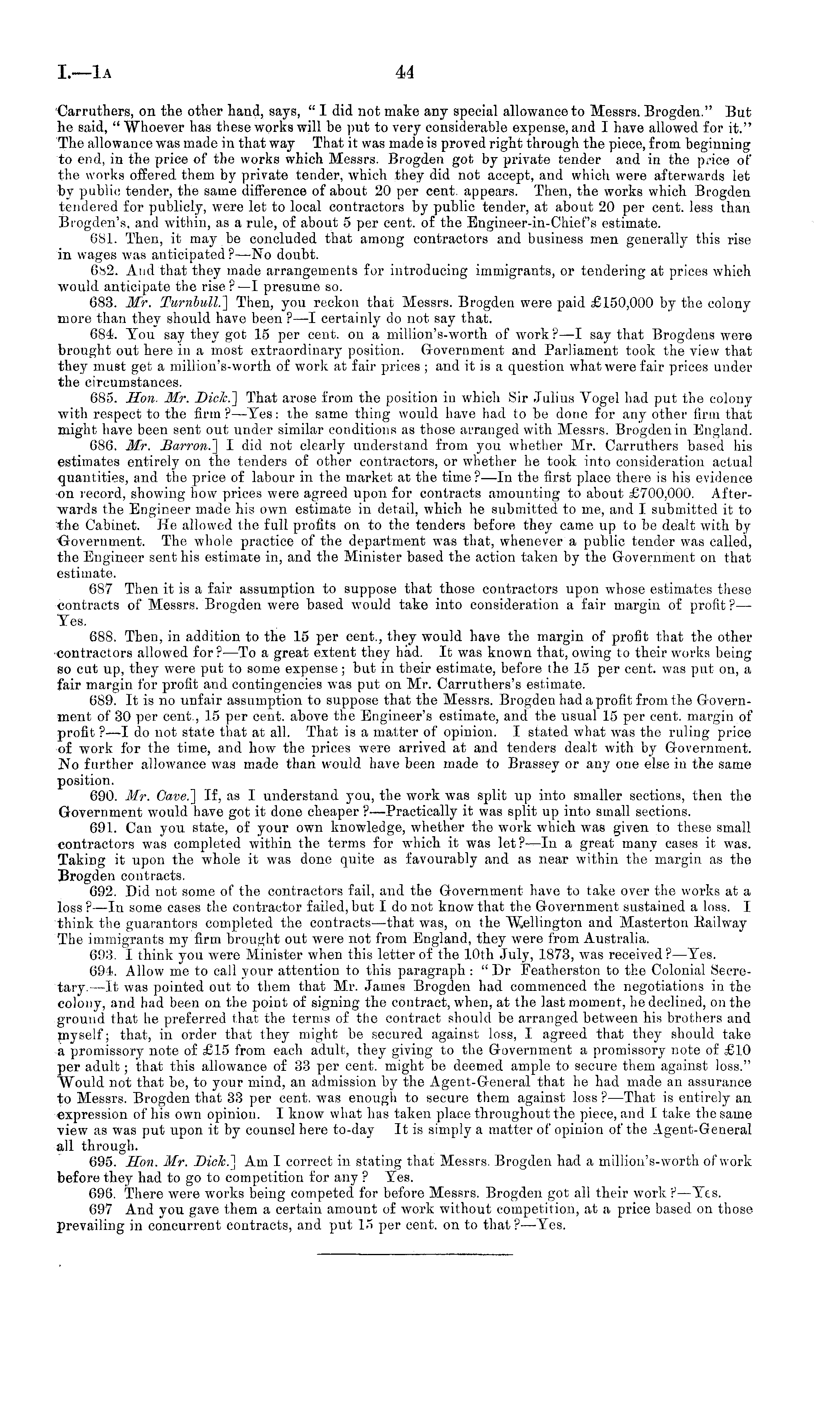 'Carruthers, on the other hand, says, " I did not make any special allowance to Messrs. Brogden." But he said, " Whoever has these works will be put to very considerable expense, and I have allowed for it." The allowance was made in that way That it was made is proved right through the piece, from beginning to end, in the price of the works which Messrs. Brogden got by private tender and in the price of the works offered them by private tender, which they did not accept, and which were afterwards let by public tender, the same difference of about 20 per cent, appears. Then, the works which Brogden tendered for publicly, were let to local contractors by public tender, at about 20 per cent, less than Brogden's, and within, as a rule, of about 5 per cent, of the Engineer-in-Chief s estimate. 681. Then, it may be concluded that among contractors and business men general!}' this rise in wages was anticipated ? —No doubt. 6b2. And that they made arrangements for introducing immigrants, or tendering at prices which would anticipate the rise? —I presume so. 683. Mr. Turnbull.~\ Then, you reckon that Messrs. Brogden were paid £150,000 by the colony more than they should have been ? —I certainly do not say that. 084. You say they got 15 per cent, on a millions-worth of work?—l say that Brogdens were brought out here in a most extraordinary position. Government and Parliament took the view that they must get a millions-worth of work at fair prices ; and it is a question what were fair prices under the circumstances. 685. Hon. Mr. Dic7c] That arose from the position in which Sir Julius Vogel had put the colony with respect to the firm ? —Tes: the same thing would have had to be done for any other firm that might have been sent out under similar conditions as those arranged with Messrs. Brogdeuin England. 686. Mr. JBarron.~\ 1 did not clearly understand from you whether Mr. Carruthers based his estimates entirely on the tenders of other contractors, or whether he took into consideration actual quantities, and the price of labour in the market at the time?—ln the first place there is his evidence ■on record, showing how prices were agreed upon for contracts amounting to about £700,000. Afterwards the Engineer made his own estimate in detail, which he submitted to me, and I submitted it to -the Cabinet. He allowed the full profits on to the tenders before they came up to be dealt with by Government. The whole practice of the department was that, whenever a public tender was called, the Engineer sent his estimate in, and the Minister based the action taken by the Government on that estimate. 687 Then it is a fair assumption to suppose that those contractors upon whose estimates these contracts of Messrs. Brogden were based would take into consideration a fair margin of profit?— Yes. 688. Then, in addition to the 15 per cent., they would have the margin of profit that the other contractors allowed for?—To a great extent they had. It was known that, owing to their works being so cut up, they were put to some expense; but in their estimate, before the 15 per cent, was put on, a fair margin for profit and contingencies was put on Mr. Carruthers's estimate. 689. It is no unfair assumption to suppose that the Messrs. Brogden had a profit from the Government of 30 per cent., 15 per cent, above the Engineer's estimate, and the usual 15 per cent, margin of profit ?—I do not state that at all. That is a matter of opinion. I stated what was the ruling price of work for the time, and how the prices were arrived at and tenders dealt with by Government. No further allowance was made than would have been made to Brassey or any one else in the same position. 690. Mr. Cave."] If, as I understand you, the work was split up into smaller sections, then the Government would have got it done cheaper?— Practically it was split up into small sections. 691. Can you state, of your own knowledge, whether the work which was given to these small contractors was completed within the terms for which it was let? —In a great many cases it was. Taking it upon the whole it was done quite as favourably and as near within the margin as the Brogden contracts. 692. Did not some of the contractors fail, and the Government have to take over the works at a loss ? —ln some cases the contractor failed, but Ido not know that the Government sustained a loss. I think the guarantors completed the contracts —that was, on the Wellington and Masterton Kailway The immigrants my firm brought out were not from England, they were from Australia. 603. I think you were Minister when this letter of the 10th July, 1873, was received?— Yes. 691. Allow me to call your attention to this paragraph : " Dr Featherston to the Colonial Secretary. —It was pointed out to them that Mr. James Brogden had commenced the negotiations in the colony, and had been on the point of signing the contract, when, at the last moment, he declined, on the ground that he preferred that the terms of the contract should be arranged between his brothers and myself; that, in order that they might be secured against loss, I agreed that they should take a promissory note of £15 from each adult, they giving to the Government a promissory note of £10 per adult; "that this allowance of 33 per cent, might be deemed ample to secure them against loss." Would not that be, to your mind, an admission by the Agent-General that lie had made an assurance to Messrs. Brogden that 33 per cent, was enough to secure them against loss ? —That is entirely an expression of his own opinion. I know what has taken place throughout the piece, and I take the same view as was put upon it by counsel here to-day It is simply a matter of opinion of the Agent-General all through. 695. Son. Mr. Dick.'] Am I correct in stating that Messrs. Brogden had a millions-worth of work before they had to go to competition for any ? Yes. 696. There were works being competed for before Messrs. Brogde