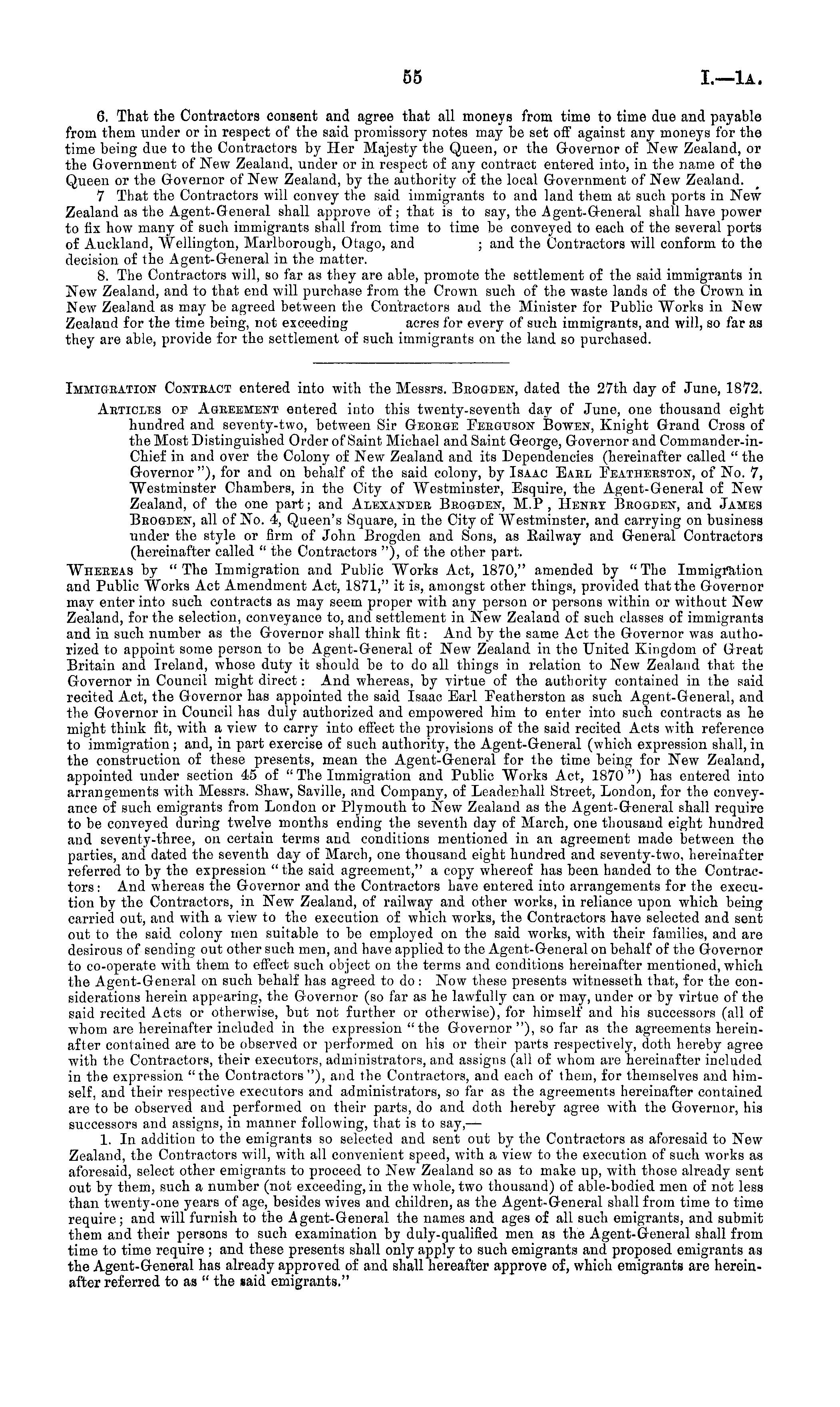 Immigration Contract entered into with the Messrs. Beogden, dated the 27th day of June, 1872. Articles of Agreement entered into this twenty-seventh day of June, one thousand eight hundred and seventy-two, between Sir Geoege Febgtson Bowen, Knight Grand Cross of the Most Distinguished Order of Saint Michael and Saint George, Governor and Commander-in-Chief in and over the Colony of New Zealand and its Dependencies (hereinafter called " the Governor"), for and on behalf of the said colony, by Isaac Earl Featherston, of No. 7, "Westminster Chambers, in the City of Westminster, Esquire, the Agent-General of NewZealand, of the one part; and Alexander Brogden, M.P , Henry Brogden, and James Brogden, all of No. 4, Queen's Square, in the City of Westminster, and carrying on business under the style or firm of John Brogden and Sons, as Railway and General Contractors (hereinafter called " the Contractors "), of the other part. Whereas by "The Immigration and Public Works Act, 1870," amended by "The Immigration and Public Works Act Amendment Act, 1871," it is, amongst other things, provided that the Governor may enter into such contracts as may seem proper with any person or persons within or without New Zealand, for the selection, conveyance to, and settlement in New Zealand of such classes of immigrants and in such number as the Governor shall think fit: And by the same Act the Governor was authorized to appoint some person to be Agent-General of New Zealand in the United Kingdom of Great Britain and Ireland, whose duty it should be to do all things in relation to New Zealand that the Governor in Council might direct: And whereas, by virtue of the authority contained in the said recited Act, the Governor has appointed the said Isaac Earl Featherston as such Agent-General, and the Governor in Council has duly authorized and empowered him to enter into such contracts as he might think fit, with a view to carry into effect the provisions of the said recited Acts with reference to immigration ; and, in part exercise of such authority, the Agent-General (which expression shall, in the construction of these presents, mean the Agent-General for the time being for New Zealand, appointed under section 45 of " The Immigration and Public Works Act, 1870") has entered into arrangements with Messrs. Shaw, Saville, and Company, of Leadenhall Street, London, for the conveyance of such emigrants from London or Plymouth to New Zealand as the Agent-General shall require to be conveyed during twelve months ending the seventh day of March, one thousand eight hundred and seventy-three, on certain terms and conditions mentioned in an agreement made between the parties, and dated the seventh day of March, one thousand eight hundred and seventy-two, hereinafter referred to by the expression "the said agreement," a copy whereof has been handed to the Contractors : And whereas the Governor and the Contractors have entered into arrangements for the execution by the Contractors, in New Zealand, of railway and other works, in reliance upon which being carried out, and with, a view to the execution of which works, the Contractors have selected and sent out to the said colony men suitable to be employed on the said works, with their families, and are desirous of sending out other such men, and have applied to the Agent-General on behalf of the Governor to co-operate with them to effect such object on the terms and conditions hereinafter mentioned, which the Agent-General on such behalf has agreed to do: Now these presents witnesseth that, for the considerations herein appearing, the Governor (so far as he lawfully can or may, under or by virtue of the said recited Acts or otherwise, but not further or otherwise), for himself and his successors (all of whom are hereinafter included in the expression " the Governor "), so far as the agreements hereinafter contained are to be observed or performed on his or their parts respectively, doth hereby agree with the Contractors, their executors, administrators, and assigns (all of whom are hereinafter included in the expression "the Contractors"), and the Contractors, and each of them, for themselves and himself, and their respective executors and administrators, so far as the agreements hereinafter contained are to be observed and performed on their parts, do and doth hereby agree with the Governor, his successors and assigns, in manner following, that is to say, — 1. In addition to the emigrants so selected and sent out by the Contractors as aforesaid to New Zealand, the Contractors will, with all convenient speed, with a view to the execution of such works as aforesaid, select other emigrants to proceed to New Zealand so as to make up, with those already sent out by them, such a number (not exceeding, in the whole, two thousand) of able-bodied men of not less than twenty-one years of age, besides wives and children, as the Agent-General shall from time to time require; and will furnish to the Agent-General the names and ages of all such emigrants, and submit them and their persons to such examination by duly-qualified men as the Agent-General shall from time to time require ; and these presents shall only apply to such emigrants and proposed emigrants as the Agent-General has already approved of and shall hereafter approve of, which emigrants are hereinafter referred to as " the said emigrants."