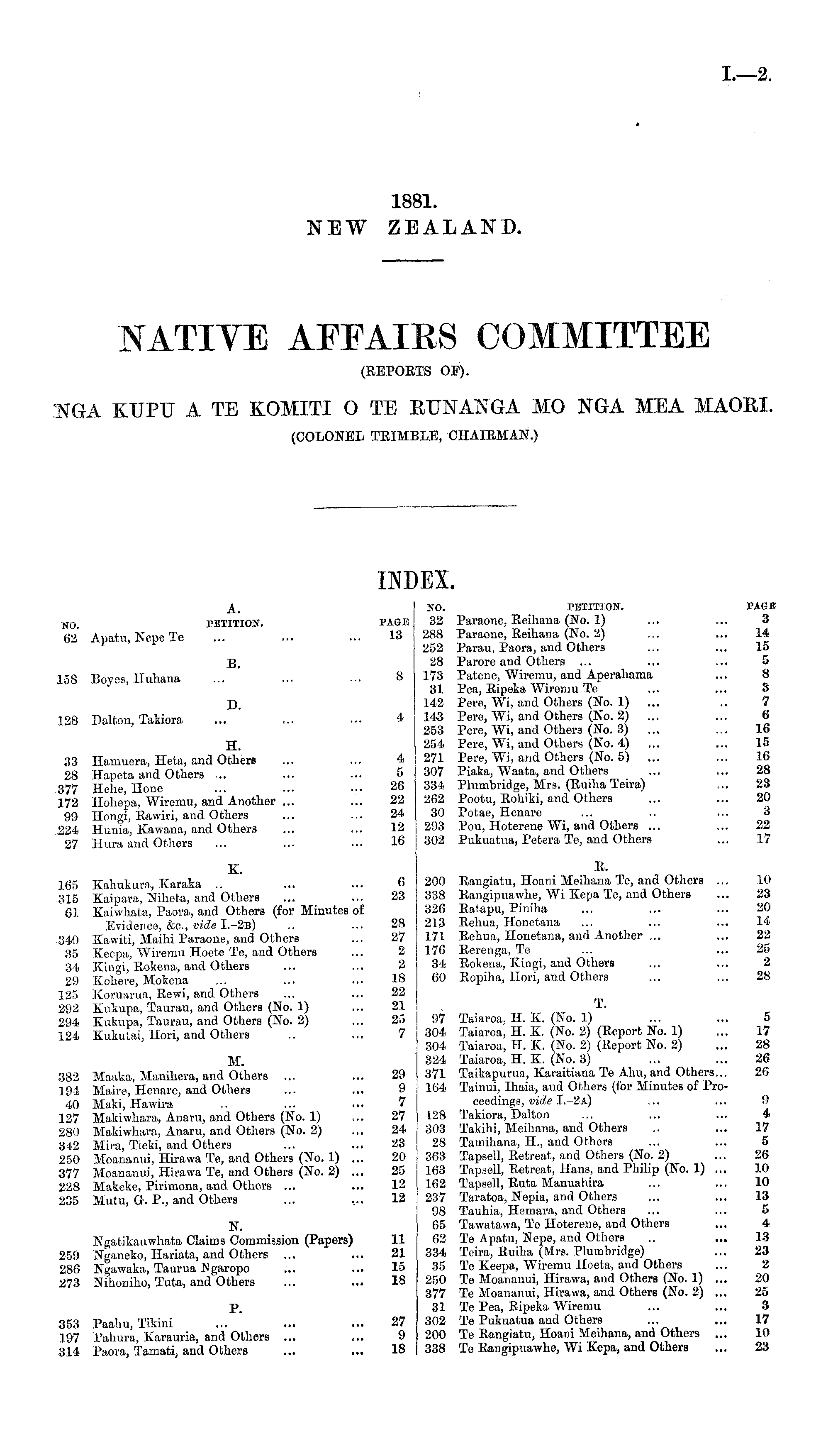 NATIVE AFFAIRS COMMITTEE (REPORTS OF). NGA KUPU A TE KOMITI O TE RUNANGA MO NGA MEA MAORI. (COLONEL TRIMBLE, CHAIRMAN.)