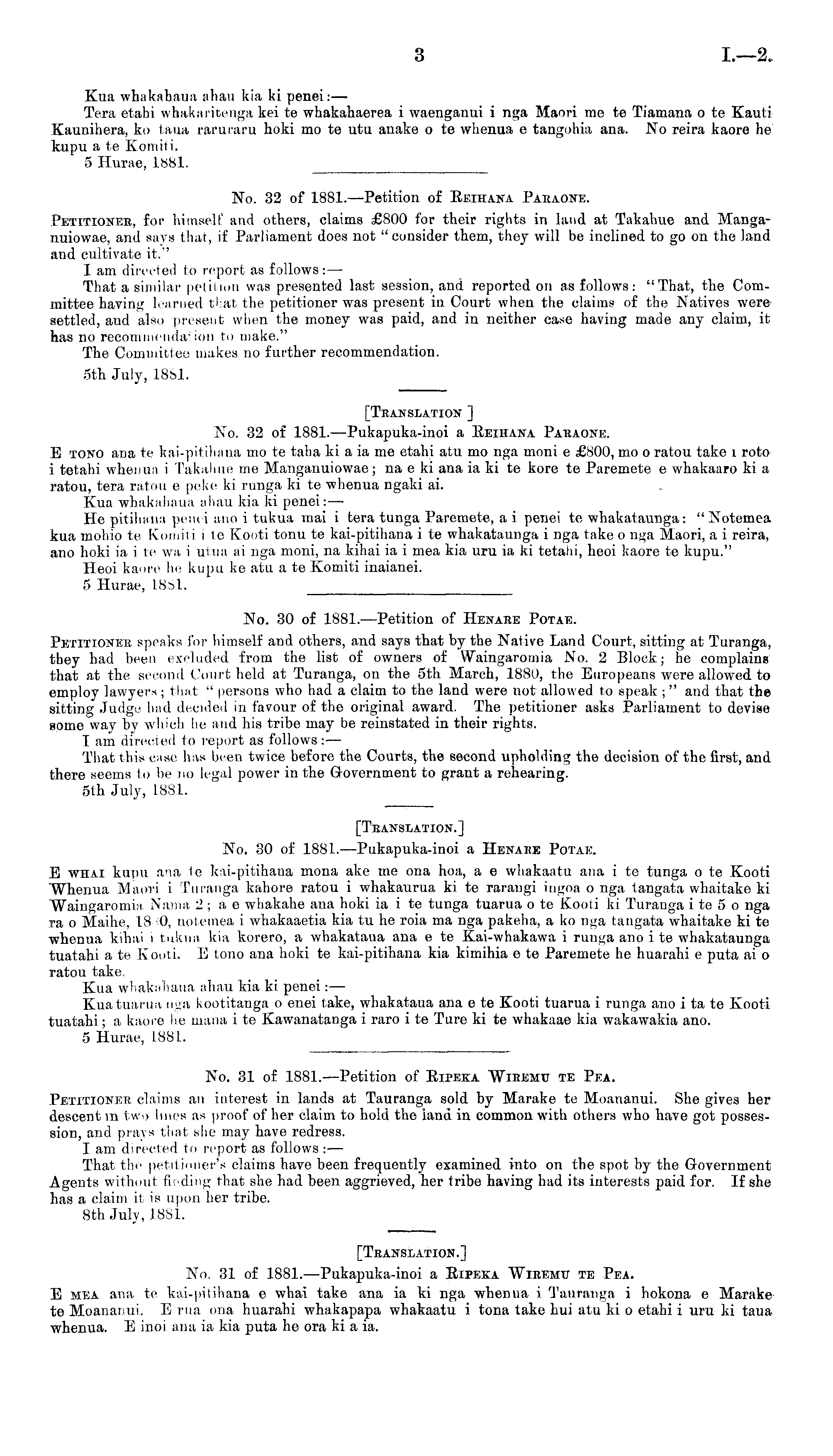 [Translation ] No. 32 of 1881.—Pukapuka-inoi a Beihana Paeaone. E tono ana te kai-pitihana mo te taha ki a ia me etahi atu mo nga moni c £800, mo o ratou take l roto i tetahi whenua i Takahue me Manganuiowae; na eki ana ia kite kore te Paremete c whakaaro ki a ratou, tera ratou c peke ki runga kite whenua ngaki ai. Kua whakahaua ahau kia ki penei:—■ He pitihiHi.i penei ano i tukua mai i tera tunga Paremete, a i penei te whakataunga: "Notemea kua mohio te Komiti i 1o Kooti tonu te kai-pitihana i te whakataunga i nga take o nga Maori, a i reira, ano hoki ia i te wa i viva ai nga moni, na kihai ia i mea kia uru ia ki tetahi, heoi kaore te kupu." Heoi kaore he kupu ke atu a te Komiti inaianei. 5 Hurae, LBBl.