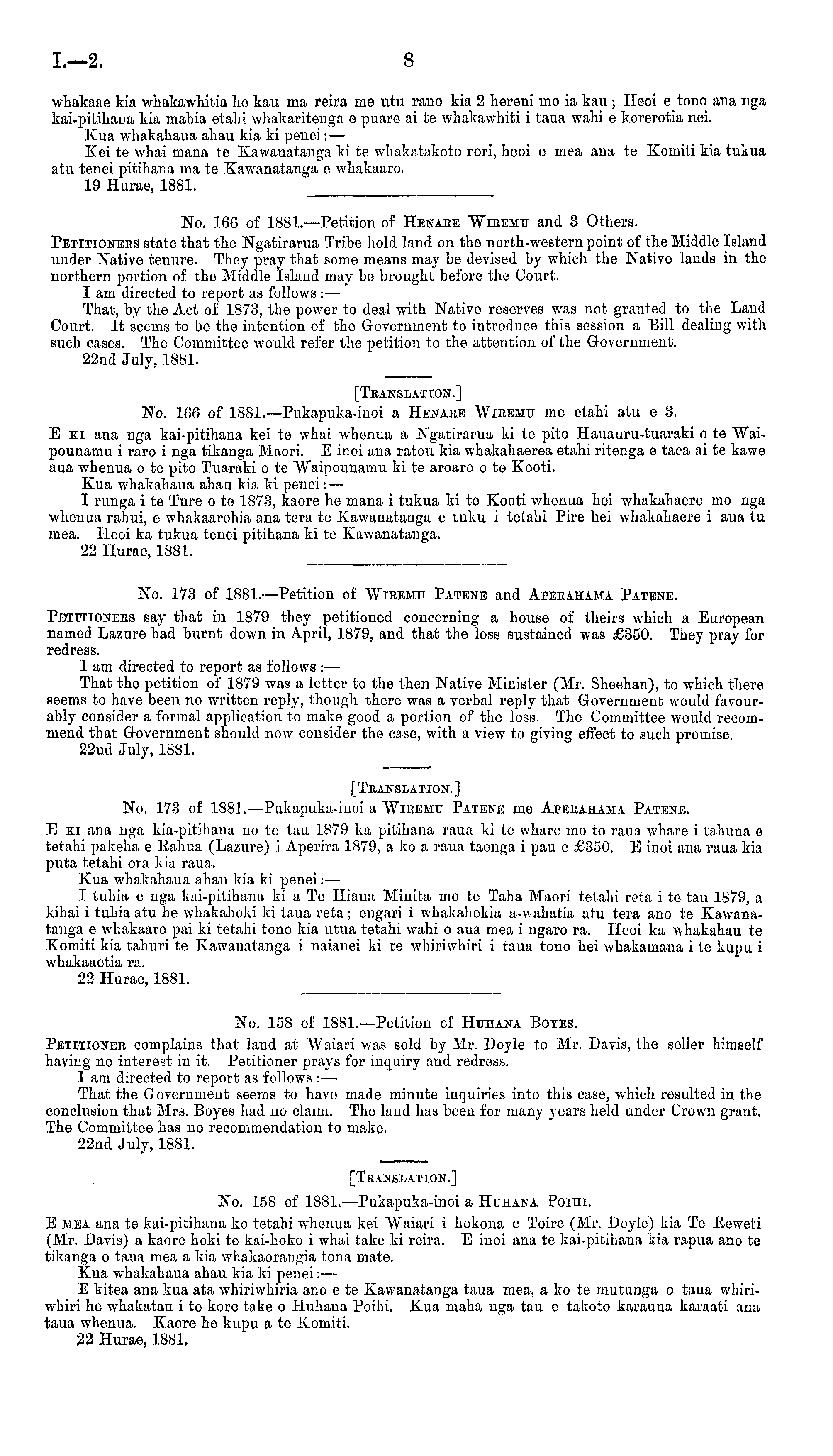 [Teanslation.] No. 158 of 1881.—Pukapuka-inoi a Huhana Poihi. E mea ana te kai-pitihana ko tetahi whenua kei Waiari i hokona c Toire (Mr. Doyle) kia Te Beweti (Mr. Davis) a kaore hoki te kai-hoko i whai take ki reira. E inoi ana te kai-pitihana kia rapua ano te tikanga o taua mea a kia whakaorangia tona mate. Kua whakahaua ahau kia ki penei:— E kitea ana kua ata whiriwhiria ano c te Kawanatanga taua mea, a ko te mutunga o taua whiriwhiri he whakatau ite kore take o Huhana Poihi. Kua maha nga tau c takoto karauna karaati ana taua whenua. Kaore he kupu ate Komiti. 22 Hurae, 1881.