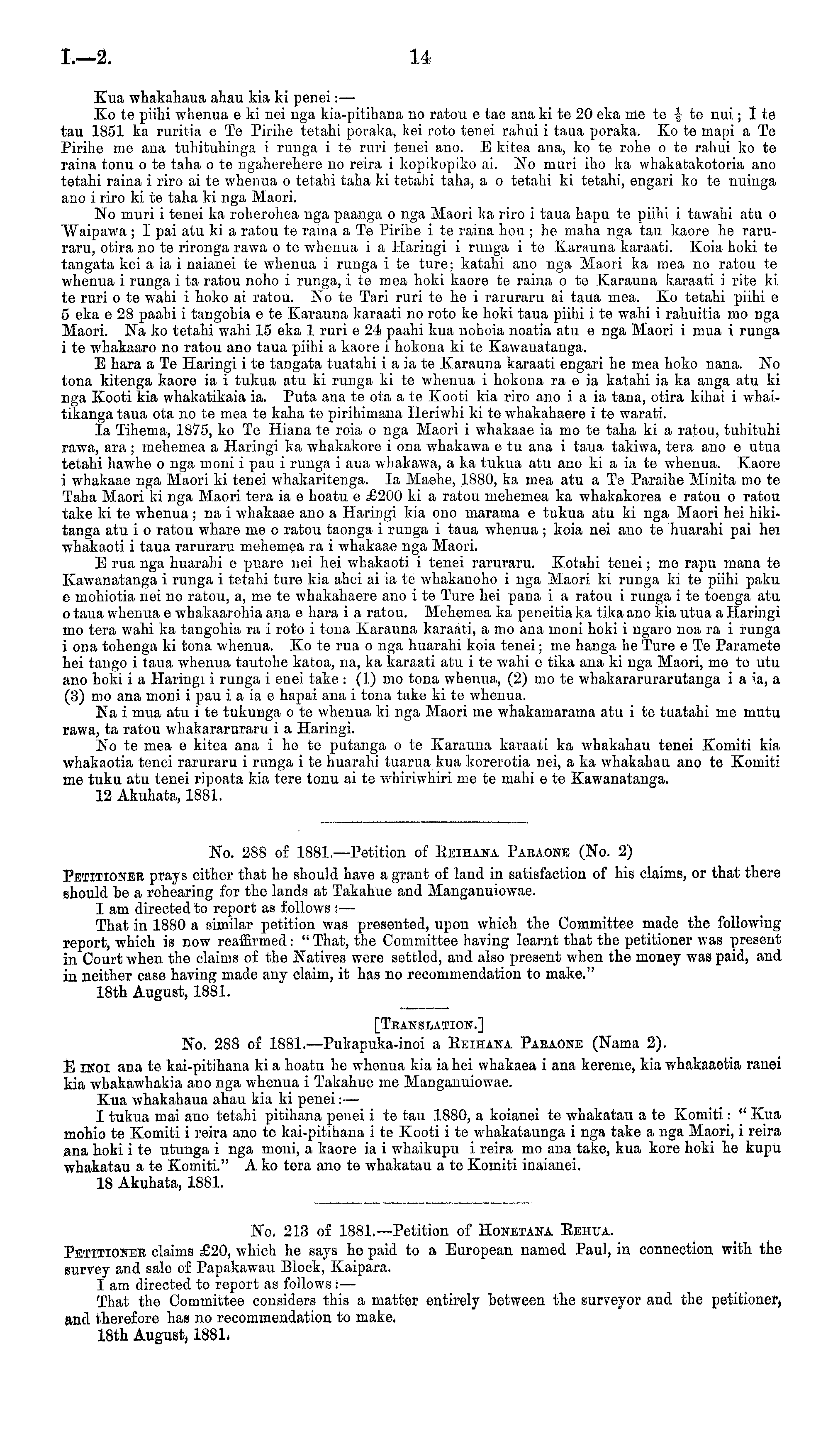 [Translation.] No. 288 of 1881.—Pukapuka-inoi a Beihana Paeaone (Nama 2). E INOI ana te kai-pitihana ki a hoatu he whenua kia ia hei whakaea i ana kereme, kia whakaaetia ranei kia whakawhakia ano nga whenua i Takahue me Manganuiowae. Kua whakahaua ahau kia ki penei:— I tukua mai ano tetahi pitihana penei i te tau 1880, a koianei te whakatau ate Komiti: " Kua mohio te Komiti i reira ano te kai-pitihana i te Kooti i te whakataunga i nga take a nga Maori, i reira ana hoki i te utunga i nga moni, a kaore ia i whaikupu i reira mo ana take, kua kore hoki he kupu whakatau ate Komiti." Ako tera ano te whakatau ate Komiti inaianei. 18 Akuhata, 1881.