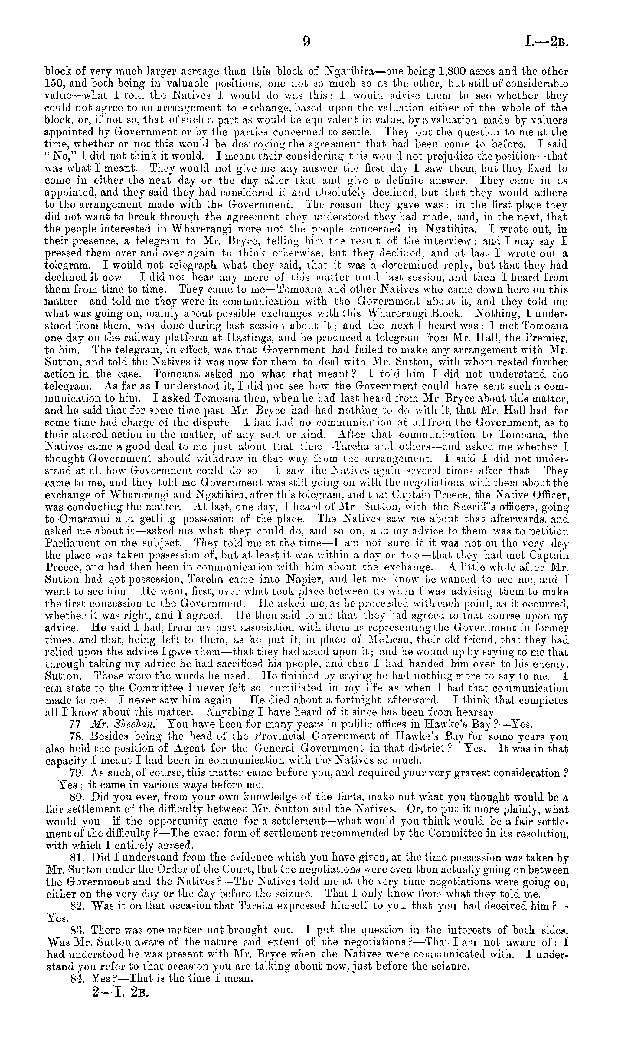 block of very rnucli larger acreage than this block of Ngatihira—one being 1,800 acres and the other 150, and both being in valuable positions, one not so much so as the other, but still of considerable value —what I told the Natives I would do was this : 1 would advise them to see whether they could not agree to an arrangement to exchange, based upon the valuation either of the whole of the block, or, if not so, that of such a part as would be equivalent in value, by a valuation made by valuers appointed by Government or by the parties concerned to settle. They put the question to me at the time, whether or not this would be destroying the agreement that had heen como to before. I said " No," I did not think it would. I meant their considering this would not prejudice the position —that was what I meant. They would not give me any answer the first day I saw them, but they fixed to come in either the next day or the day after that and give a definite answer. They came in as appointed, and they said they had considered it and absolutely declined, but that they would adhere to the arrangement made with the Government. The reason they gave was : in the first place they did not want to break through the agreement they understood they had made, and, in the next, that the people interested in Wharerangi were not the people concerned in Ngatihira. I wrote out, in their presence, a telegram to Mr. Bryce, telling him the result of the interview; and I may say I pressed them over and over again to think otherwise, but they declined, and at last I wrote out a telegram. I would not telegraph what they said, that it was a determined reply, but that they had declined it now I did not hear any more of this matter until last session, and then I heard from them from time to time. They came to me —Tomoana and other Natives who came down here on this matter—and told me they were in communication with the Government about it, and they told me what was going on, mainly about possible exchanges with this Wharerangi Block. Nothing, I understood from them, was done during last session about it; and the next I heard was : I met Tomoana one day on the railway platform at Hastings, and he produced a telegram from Mr. Hall, the Premier, to him. The telegram, in effect, was that Government had failed to make any arrangement with Mr. Sutton, and told the Natives it was now for them to deal with Mr. Sutton, with whom rested further action in the case. Tomoana asked me what that meant ? I told him I did not understand the telegram. As far as I understood it, I did not see how the Government could have sent such a communication to him. I asked Tomoana then, when he had last heard from Mr. Bryce about this matter, and he said that for some time past Mr. Bryce had had nothing to do with it, that Mr. Hall had for some time had charge of the dispute. I had had no communication at all from the Government, as to their altered action in the matter, of any sort or kind. After that communication to Tomoana, the Natives came a good deal to me just about that time —Tareha and others—and asked me whether I thought Government should withdraw in that way from the arrangement. I said I did not understand at all how Government could do so. I saw the Natives again several times after that. They came to me, and they told me Government was still going on with the negotiations with them about the exchange of Wharerangi and Ngatihira, after this telegram, and that Captain Preece, the Native Officer, was conducting the matter. At last, ono day, I heard of Mr, Sutton, with the Sheriff's officers, going to Omaranui aud getting possession of the place. The Natives saw me about that afterwards, and asked me about it—asked me what they could do, and so on, and my advice to them was to petition Parliament on the subject. They told mo at the time—I am not sure if it was not on the very day the place was taken possession of, but at least it was within a day or two —that they had met Captain Preece, and had then been in communication with him about the exchange. A little while after Mr. Sutton had got possession, Tareha came into Napier, and let me know ho wanted to seo me, and I went to see him. He went, first, over what took place between us when I was advising them to make the first concession to the Government. He asked me, as he proceeded with each point, as it occurred, whether it was right, and I agreed. He then said to me that they had agreed to that course upon my advice. He said I had, from my past association with them as representing the Government in former times, and that, being loft to them, as he put it, in place of McLean, their old friend, that they had relied upon the advice I gave them —-that they had acted upon it; and he wound up by saying to me that through taking my advice he had sacrificed his people, and that I had handed him over to his enemy, Suttou. Those were the words he used. He finished by saying he had nothing more to say to mo. I can state to the. Committee I never felt so humiliated in my life as when I had that communication made to me. I never saw him again. He died about a fortnight afterward. I think that completes all I know about this matter. Anything I have heard of it since has been from hearsay 77 Mr. Sheehan.~\ You have been for many years in public offices in Hawke's Bay?—Tea. 78. Besides being the head of the Provincial Government of Hawke's Bay for some years you also held the position of Agent for the General Government in that district? —Tes. It was in that capacity I meant I had been in communication with the Natives so much. 79. As such, of course, this matter came before you, and required your very gravest consideration ? Tes; it came in various ways before me. SO. Did you ever, from your own knowledge of the facts, make out what you thought would be a fair settlement of the difficulty between Mr. Sutton and the Natives. Or, to put it more plainly, what would you —if th