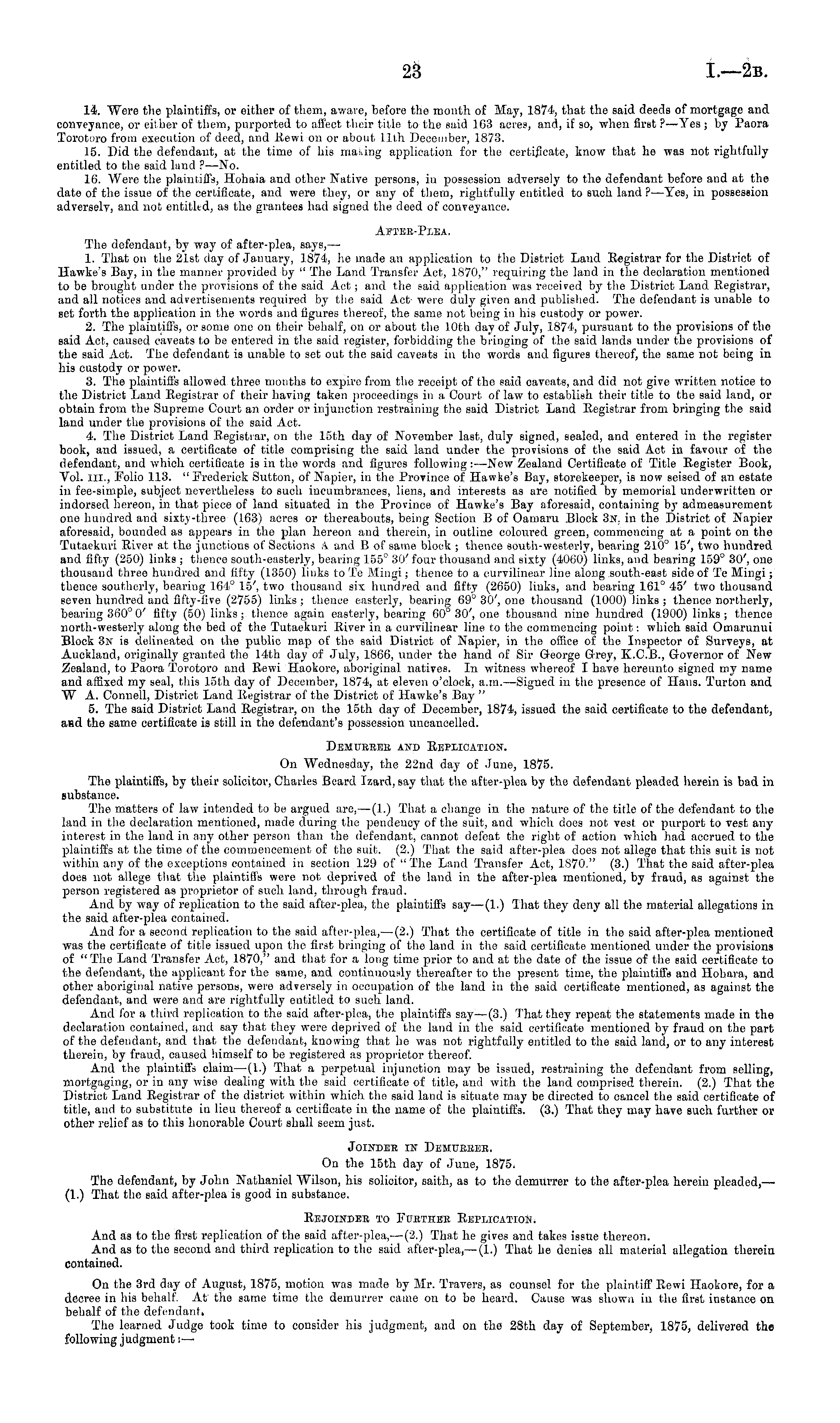 14. Were the plaintiffs, or either of them, aware, before the month of May, 1874, that the said deeds of mortgage and conveyance, or either of them, purported to affect their title to the said 163 acres, and, if so, when first ? —Yes ; by Paora Torotoro from execution of deed, and Rewi on or about 11th December, 1873. 15. Did the defendant, at the time of his mailing application for the certificate, know that he was not rightfully entitled to the said land ?—No. 16. Were the plaintiff's, Hohaia and other Native persons, in possession adversely to the defendant before and at the date of the issue of the certificate, and were they, or any of them, rightfully entitled to such land ?—Yes, in possession adversely, and not entitled, as the grantees had signed the deed of conveyance. Aftee-Piea. The defendant, by way of after-plea, says, — 1. That on the 21st day of January, 1874, he made an application to the District Land Registrar for the District of Hawke's Bay, in the manner provided by " The Land Transfer Act, 1870," requiring the land in the declaration mentioned to be brought under the provisions of the said Act; and the said application was received by the District Land Registrar, and all notices and advertisements required by the said Act were duly given and published. The defendant is unable to set forth the application in the words and figures thereof, the same not being in his custody or power. 2. The plaintiffs, or some one on their behalf, on or about the 10th day of July, 1874, pursuant to the provisions of the said Act, caused caveats to be entered in the said register, forbidding the bringing of the said lands under the provisions of the said Act. The defendant is unable to set out the said caveats in the words and figures thereof, the same not being in his custody or power. 3. The plaintiffs allowed three mouths to expire from the receipt of the said caveats, and did not give written notice to the District Land Registrar of their having taken proceedings in a Court of law to establish their title to the said land, or obtain from the Supreme Court an order or injunction restraining the said District Land Registrar from bringing the said land under the provisions of the said Act. 4. The District Land Registrar, on the 15th day of November last, duly signed, sealed, and entered in the register book, and issued, a certificate of title comprising the said land under the provisions of the said Act in favour of the defendant, and which certificate is in the words and figures following:—New Zealand Certificate of Title Register Book, Vol. 111., Folio 113. "Frederick Sutton, of Napier, in the Province of Hawke's Bay, storekeeper, is now seised of an estate in fee-simple, subject nevertheless to such iucumbrances, liens, and interests as are notified by memorial underwritten or indorsed hereon, in that piece of land situated in the Province of Hawke's Bay aforesaid, containing by admeasurement one hundred and sixty-three (163) acres or thereabouts, being Section B of Oamaru Block 3s. in the District of Napier aforesaid, bounded as appears in the plan hereon and therein, in outline coloured green, commencing at a point on the Tutaekuri River at the junctions of Sections .4 and B of same block ; thence south-westerly, bearing 210° 15', two hundred and fifty (250) links; thence south-easterly, bearing 155° 30' four thousand and sixty (4060) links, and bearing 159° 30', one thousand three hundred and fifty (1350) links to Te Mingi; thence to a curvilinear line along south-east side of Te Mingi; thence southerly, bearing 161° 15', two thousand six hundred and fifty (2650) links, and bearing 161° 45' two thousand seven hundred and fifty-live (2755) links; thence easterly, bearing 69° 30', one thousand (1000) links ; thence northerly, bearing 360° 0' fifty (50) links; thence again easterly, bearing 60° 30', one thousand nine hundred (1900) links ; thence north-westerly along the bed of the Tutaekuri River in a curvilinear line to the commencing point: which said Omarunui Block 3n is delineated on the public map of the said District of Napier, in the office of the Inspector of Surveys, at Auckland, originally granted the 14th day of July, 1866, under the hand of Sir George Grey, K.C.8., Governor of New Zealand, to Paora Torotoro and Rewi Haokore, aboriginal natives. In witness whereof I have hereunto signed my name and affixed my seal, this loth day of December, 1874, at eleven o'clock, a.m.—Signed in the presence of Hans. Turton and W A. Conuell, District Land Registrar of the District of Hawke'B Bay " 5. The said District Land Registrar, on the 15th day of December, 1874, issued the said certificate to the defendant, and the same certificate is still in the defendant's possession uncancelled. Demuebee and Replication. On Wednosday, the 22nd day of June, 1875. The plaintiffs, by their solicitor, Charles Beard Izard, say that the after-plea by the defendant pleaded herein is bad in substance. The matters of law intended to be argued are, —(1.) That a change in the nature of the title of the defendant to the land in the declaration mentioned, made during the pendency of the suit, and which does not vest or purport to vest any interest in the land in any other person than the defendant, cannot defeat the right of action which had accrued to the plaintiffs at the time of the commencement of the suit. (2.) That the said after-plea does not allege that this suit is not within any of the exceptions contained in section 129 of "The Land Transfer Act, 1870." (3.) That the said after-plea does not allege that the plaintiffs were not deprived of the land in the after-plea mentioned, by fraud, as against the person registered as proprietor of such land, through fraud. And by way of replication to the said after-plea, the plaintiffs say—(l.) That they deny all the material allegations in the said after-plea contained. And for a second replication to the said after-plea,—(2.) That
