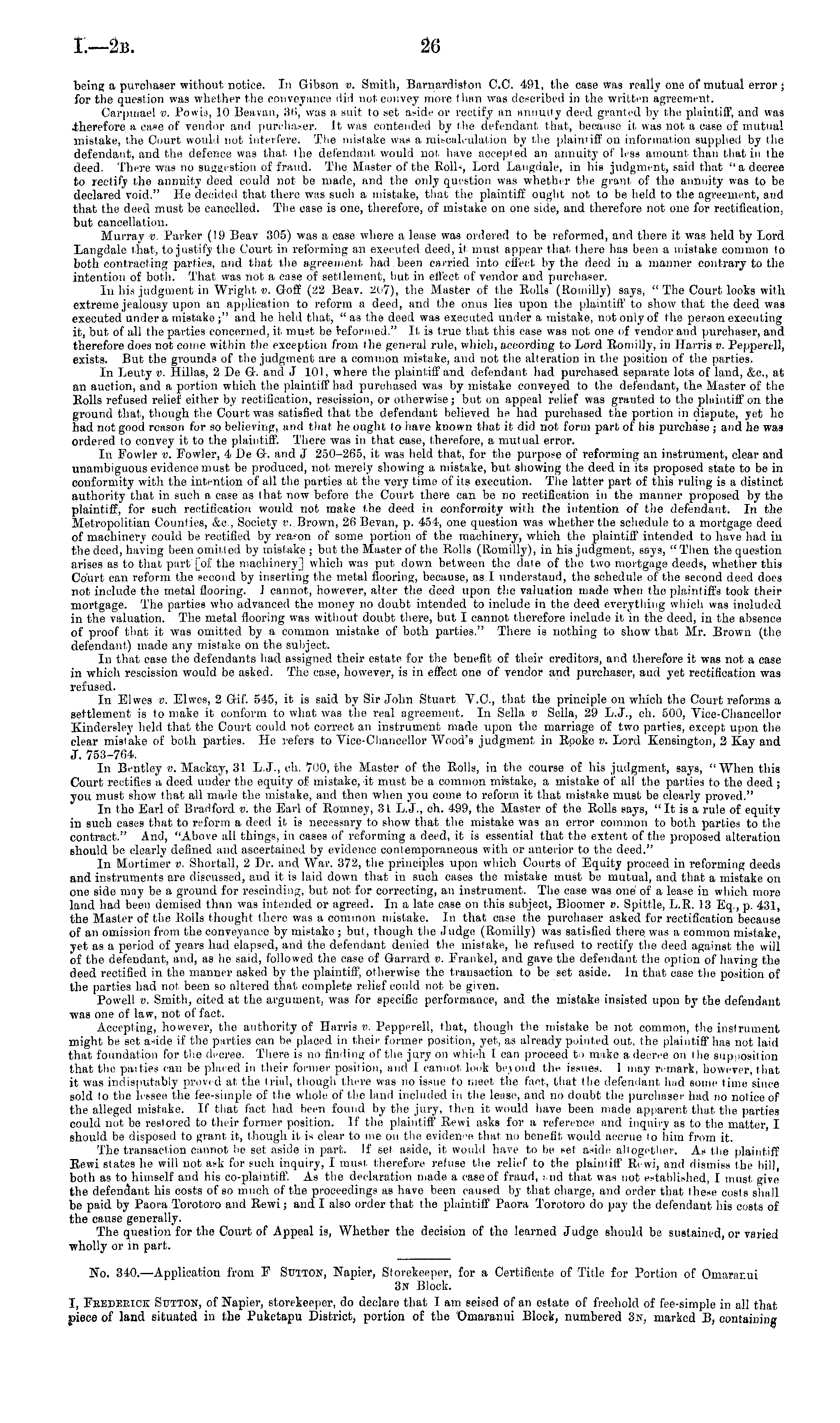 No. 340. —Application from 1? Sutton, Napier, Storekeeper, for a Certificate of Title for Portion of Omarorui 3N Block. I, Feedekick Sutton, of Napier, storekeeper, do declare that I am seised of an estate of freehold of fee-simple in all that piece of land situated iu the Puketapu District, portion of the Omaranui Block, numbered Sv, marked B, containing