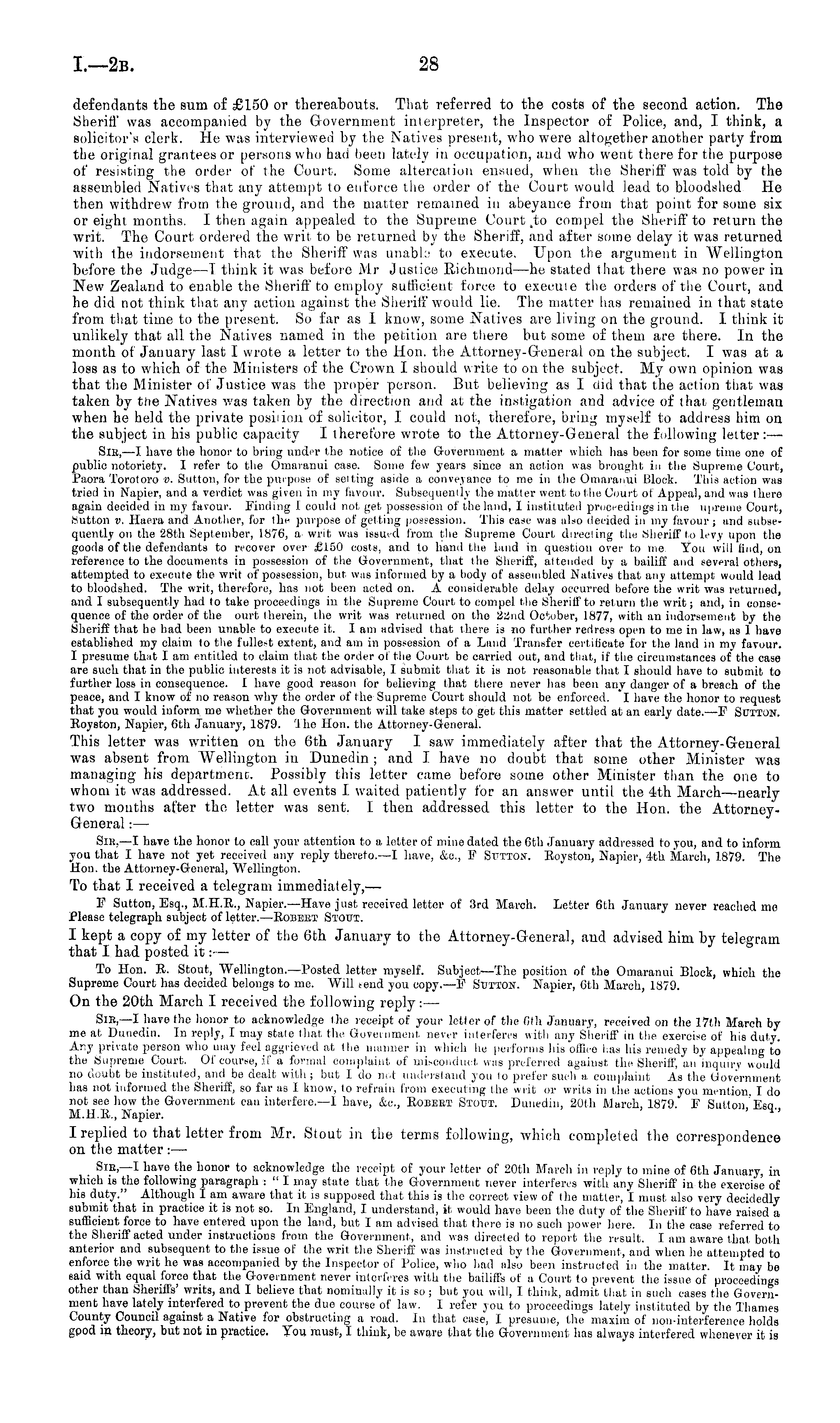 defendants the sum of £150 or thereabouts. That referred to the costs of the second action. The Sheriff was accompanied by the Government interpreter, the Inspector of Police, and, I think, a solicitor's clerk. He was interviewed by the Natives present, who were altogether another party from the original grantees or persons who had been lately in occupation, and who went there for the purpose of resisting the order of the Court. Some altercation ensued, when the Sheriff was told by the assembled Natives that any attempt to enforce the order of the Court would lead to bloodshed He then withdrew from the ground, and the matter remained in abeyance from that point for some six or eight months. I then again appealed to the Supreme Court .to compel the Sheriff to return the writ. The Court ordered the writ to be returned by the Sheriff, and after some delay it was returned with the indorsement that the Sheriff' was unable to execute. Upon the argument in Wellington before the Judge—l. think it was before Mr Justice Richmond —he stated that there was no power in New Zealand to enable the Sheriff to employ sufficient force to execute the orders of the Court, and he did not think that any action against the Sheriff would lie. The matter has remained in that state from that time to the present. So far as I know, some Natives are living on the ground. I think it unlikely that all the Natives named in the petition are there but some of them are there. In the month of January last I wrote a letter to the Hon. the Attorney-General on the subject. I was at a loss as to which of the Ministers of the Crown I should write to on the subject. My own opinion was that the Minister of Justice was the proper person. But believing as I did that the action that was taken by the Natives was taken by the direction and at the instigation and advice of that gentleman when he held the private position of solicitor, I could not, therefore, bring myself to address him on the subject in his public capacity I therefore wrote to the Attorney-General the following letter: — Sill, —I bare the honor to bring und.-r the notice of the Government a matter which lias been for some time one of public notoriety. I refer to the Omaranui case. Some few years since an action was brought in the Supreme Court, Paora Torotoro v. Sutton, for the purpose of selling aside a conveyance to me in the Omaranui Block. This action was tried in Napier, and a verdict was given in my favour. Subsequently the matter went to the Court of Appeal, and was there again decided in my favour. Finding 1 could not get possession of the land, I instituted proceedings in the upreine Court, button v. Haera and Another, for tin- purpose of getting possession. This case was also decided in my favour ; and subsequently on the 28th September, 1876, a writ was issued from the Supreme Court directing the Sheriff to levy upon the goods of the defendants to recover over £150 costs, and to hand the land in question over to me You will find, on reference to the documents in possession of the Government, that the Sheriff, attended by a bailiff and several others, attempted to execute the writ of possession, but was informed by a body of assembled Natives that any attempt would lead to bloodshed. The writ, therefore, has not been acted on. A considerable delay occurred before the writ was returned, and I subsequently had to take proceedings in the Supreme Court to compel the Sheriff to return the writ; and, in consequence of the order of the ourt therein, the writ was returned on the 22nd October, 1877, with an indorsement by the Sheriff that he had been unable to execute it. lam advised that there is no further redress open to me in law, as 1 have established my claim to the fullest extent, and am in possession of a Land Transfer certificate for the land in my favour. I presume that I am entitled to claim that the order of the Court be carried out, and that, if the circumstances of the case are such that in the public interests it is not advisable, I submit that it is not reasonable that I should have to submit to further loss in consequence. I have good reason for believing that there never has been any danger of a breach of the peace, and I know of no reason why the order of the Supreme Court should not be enforced. I have the honor to request that you would inform me whether the Government will take steps to get this matter settled at an early date.—F Sutton. Royston, Napier, 6th January, 1879. The Hon. the Attorney-General. This letter was written on the 6th January I saw immediately after that the Attorney-General was absent from Wellington in Dunedin ; and I have no doubt that some other Minister was managing his department. Possibly this letter came before some other Minister than the one to whom it was addressed. At all events I waited patiently for an answer until the 4th March—nearly two mouths after the letter was sent. I then addressed this letter to the Hon. the AttorneyGeneral :— Sir, —I have the honor to call your attention to a letter of mine dated the 6th January addressed to you, and to inform you that I have not yet received any reply thoreto.--I have, &c, F Suttok. Royston, Napier, 4th March, 1879. The .Hon. the Attorney-General, Wellington. To that I received a telegram immediately,— F Sutton, Esq., M.H.R., Napier.—Have just received letter of 3rd March. Letter 6th January never reached me Please telegraph subject of letter. —Robert Stout. I kept a copy of my letter of the 6th January to the Attorney-General, and advised him by telegram that I had posted it:— To Hon. R. Stout, Wellington.—Posted letter myself. Subject—The position of the Omaranui Block, which the Supreme Court has decided belongs to mc. Will tend you copy. —F Sutton. Napier, 6th March, 1879. On the 20th March I received the following reply:— Sie,—l have the honor to acknowledge the receipt of your letter of the 6th January, received on the 17th Marc