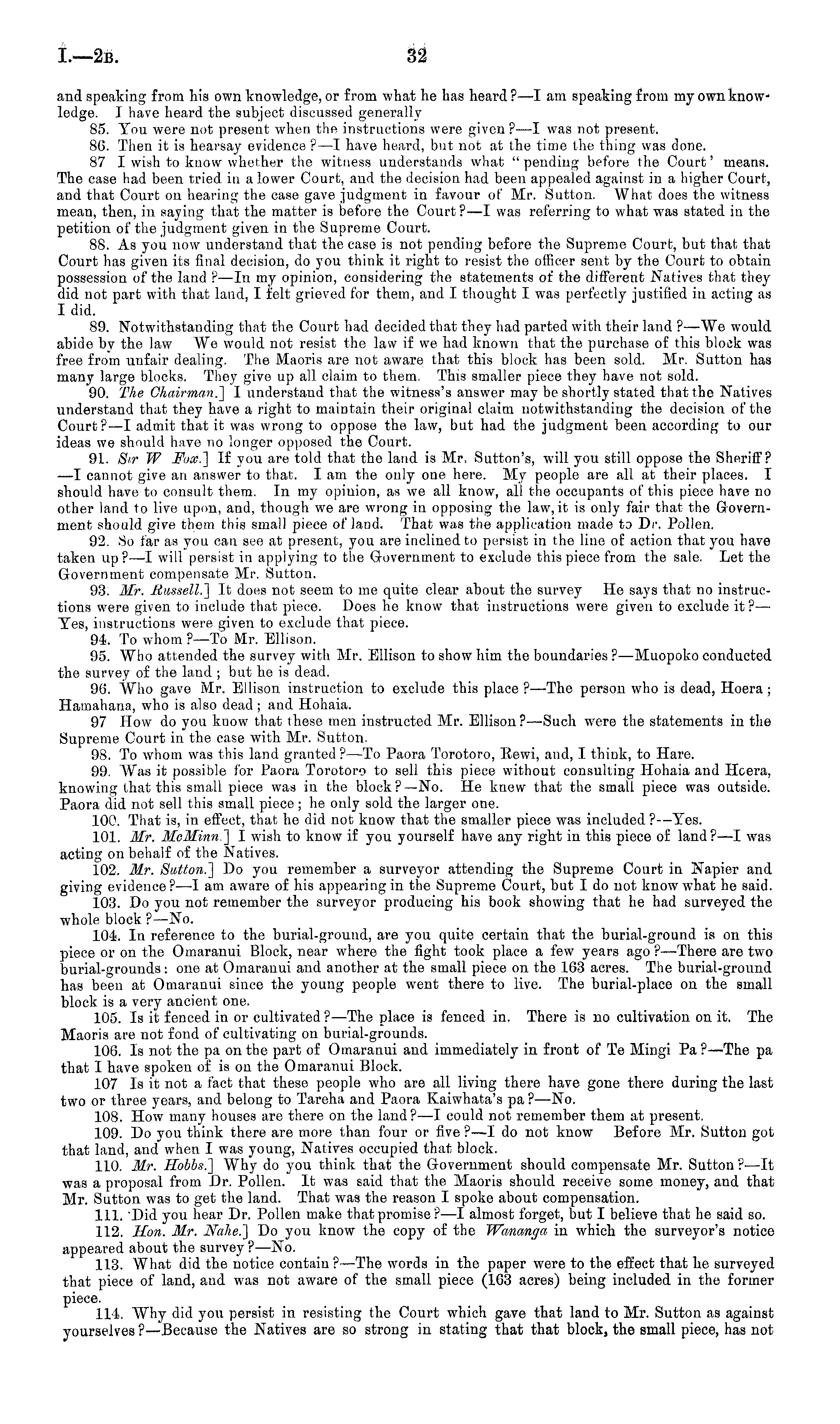 and speaking from his own knowledge, or from what he has heard ? —I am speaking from my own knowledge. I have heard the subject discussed generally 85. You were not present when the instructions were given ? —I was not present. 86. Then it is hearsay evidence ? —I have heard, but not at the time the thing was done. 87 I wish to know whether the witness understands what " pending before the Court' means. The case had been tried in a lower Court, and the decision had been appealed against in a higher Court, and that Court on hearing the case gave judgment in favour of Mr. Sutton. What does the witness mean, then, in saying that the matter is before the Court?—l was referring to what was stated in the petition of the judgment given in the Supreme Court. 88. As you now understand that the case is not pending before the Supreme Court, but that that Court has given its final decision, do you think it right to resist the officer sent by the Court to obtain possession of the land ? —ln my opinion, considering the statements of the different Natives that they did not part with that land, I felt grieved for them, and I thought I was perfectly justified in acting as I did. 89. Notwithstanding that the Court had decided that they had parted with their land ?—We would abide by the law We would not resist the law if we had known that the purchase of this bloek was free from unfair dealing. The Maoris are not aware that this block has been sold. Mr. Sutton has many large blocks. They give up all claim to them. This smaller piece they have not sold. 90. The Chairman.] I understand that the witness's answer may be shortly stated that the Natives understand that they have a right to maintain their original claim notwithstanding the decision of the Court? —I admit that it was wrong to oppose the law, but had the judgment been according to our ideas we should have no longer opposed the Court. 91. Sir W Fox.] If you are told that the land is Mr. Sutton's, will you still oppose the Sheriff? —I cannot give an answer to that. lam the only one here. My people are all at their places. I should have to consult them. In my opinion, as we all know, all the occupants of this piece have no other land to live upon, and, though we are wrong in opposing the law-, it is only fair that the Government should give them this small piece of land. That was the application made to Dr. Pollen. 92. So far as you can see at present, you are inclined to persist in the line of action that you have taken up ?—I will persist in applying to the Government to exclude this piece from the sale. Let the Government compensate Mr. Sutton. 93. Mr. Russell.] It does not seem to me quite clear about the survey He says that no instructions were given to include that piece. Does he know that instructions were given to exclude it? — Yes, instructions were given to exclude that piece. 94. To whom ?—To Mr. Ellison. 95. Who attended the survey with Mr. Ellison to show him the boundaries ?—Muopoko conducted the survey of the land ; but he is dead. 90. Who gave Mr. Ellison instruction to exclude this place ? —The person who is dead, Hoera; Hamahana, who is also dead ; and Hohaia. 97 How do you know that these men instructed Mr. Ellison?—Such were the statements in the Supreme Court in the case with Mr. Sutton. 98. To whom was this land granted ? —To Paora Torotoro, Bewi, and, I think, to Hare. 99. Was it possible for Paora Torotoro to sell this piece without consulting Hohaia and Hoera, knowing that this small piece was in the block?—No. He knew that the small piece was outside. Paora did not sell this small piece; he only sold the larger one. 100. That is, in effect, that he did not know that the smaller piece was included ? —Yes. 101. Mr. MeMinn.] I wish to know if you yourself have any right in this piece of land? —I was acting on behalf of the Natives. 102. Mr. Sutton.] Do you remember a surveyor attending the Supreme Court in Napier and giving evidence? —I am aware of his appearing in the Supreme Court, but Ido not know what he said. 103. Do you not remember the surveyor producing his book showing that he had surveyed the whole block ? —No. 104. In reference to the burial-ground, are you quite certain that the burial-ground is on this piece or on the Omaranui Block, near where the fight took place a few years ago ?—There are two burial-grounds : one at Omaranui and another at the small piece on the 163 acres. The burial-ground has been at Omaranui since the young people went there to live. The burial-place on the small block is a very ancient one. 105. Is it fenced in or cultivated ?—The place is fenced in. There is no cultivation on it. The Maoris are not fond of cultivating on burial-grounds. 106. Is not the pa on the part of Omaranui and immediately in front of Te Mingi Pa ?—The pa that I have spoken of is on the Omaranui Block. 107 Is it not a fact that these people who are all living there have gone there during the last two or three years, and belong to Tareha and Paora Kaiwhata's pa ? —No. 108. How many houses are there on the land ? —I could not remember them at present. 109. Do you think there are more than four or five ?—I do not know Before Mr. Sutton got that land, and when I was young, Natives occupied that block. 110. Mr. Hobbs.] Why do you think that the Government should compensate Mr. Sutton ?—lt was a proposal from Dr. Pollen. It was said that the Maoris should receive some money, and that Mr. Sutton was to get the land. That was the reason I spoke about compensation. 111. 'Did you hear Dr. Pollen make that promise?—l almost forget, but I believe that he said so. 112. Hon. Mr. Nahe.] Do you know the copy of the Wananga in which the surveyor's notice appeared about the survey ? —No. 113. What did the notice contain? —The words in the paper were to the effect that he surveyed that piece of land, and was not aware of the small piece (163 acres) being included in the former p