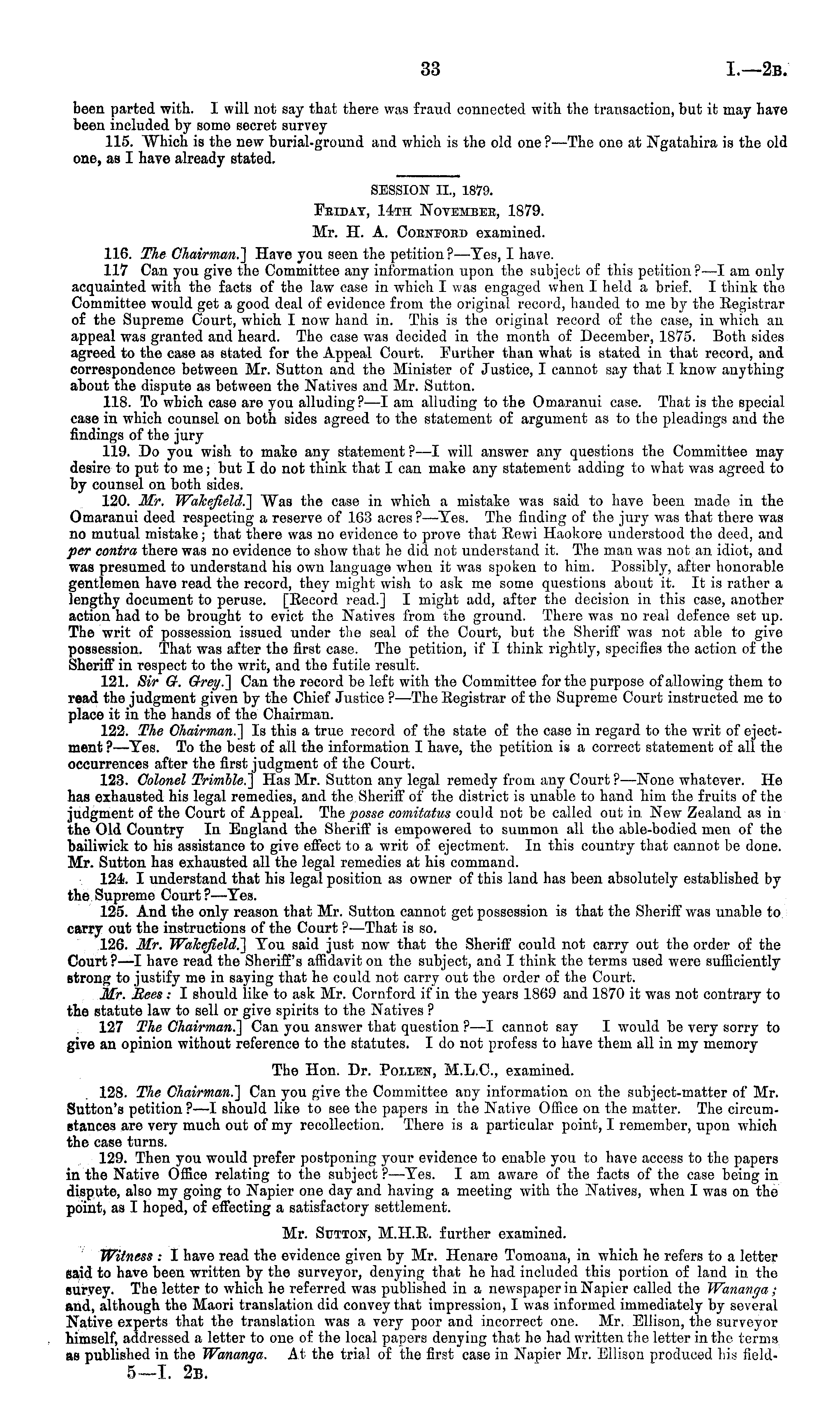 SESSION 11., 1879. Feidat, 14th Notembeb, 1879. Mr. H. A. Coenpohd examined. 116. The Chairman.] Have you seen the petition ?—Yes, I have. 117 Can you give the Committee any information upon the subject of this petition?—l am only acquainted with the facts of the law case in which I was engaged when I held a brief. I think the Committee would get a good deal of evidence from the original record, handed to me by the Registrar of the Supreme Court, which I now hand in. This is the original record of the case, in which an appeal was granted and heard. The case was decided in the month of December, 1875. Both sides agreed to the case as stated for the Appeal Court. Further than what is stated in that record, and correspondence between Mr. Sutton and the Minister of Justice, I cannot say that I know anything about the dispute as between the Natives and Mr. Sutton. 118. To which case are you alluding? —I am alluding to the Omaranui case. That is the special case in which counsel on both sides agreed to the statement of argument as to the pleadings and the findings of the jury 119. Do you wish to make any statement ? —I will answer any questions the Committee may desire to put to me; but Ido not think that I can make any statement adding to what was agreed to by counsel on both sides. 120. Mr. Wakefield.] Was the case in which a mistake was said to have been made in the Omaranui deed respecting a reserve of 163 acres ?—Yes. The finding of the jury was that there was no mutual mistake; that there was no evidence to prove that Bewi Haokore understood the deed, and per contra there was no evidence to show that he did not understand it. The man was not an idiot, and was presumed to understand his own language when it was spoken to him. Possibly, after honorable gentlemen have read the record, they might wish to ask me some questions about it. It is rather a lengthy document to peruse. [Record read.] I might add, after the decision in this case, another action had to be brought to evict the Natives from the ground. There was no real defence set up. The writ of possession issued under the seal of the Court, but the Sheriff was not able to give possession. That was after the first case. The petition, if I think rightly, specifies the action of the Sheriff in respect to the writ, and the futile result. 121. Sir G. Grey.] Can the record be left with the Committee for the purpose of allowing them to road the judgment given by the Chief Justice ?—The Registrar of the Supreme Court instructed me to place it in the hands of the Chairman. 122. The Chairman,] Is this a true record of the state of the case in regard to the writ of ejectment ? —Yes. To the best of all the information I have, the petition is a correct statement of all the occurrences after the first judgment of the Court. 123. Colonel Trimble.] Has Mr. Sutton any legal remedy from any Court ? —None whatever. He has exhausted his legal remedies, and the Sheriff of the district is unable to hand him the fruits of the judgment of the Court of Appeal. The posse comitatus could not be called out in New Zealand as in the Old Country In England the Sheriff is empowered to summon all the able-bodied men of the bailiwick to his assistance to give effect to a writ of ejectment. In this country that cannot be done. Mr. Sutton has exhausted all the legal remedies at his command. 124. I understand that his legal position as owner of this land has been absolutely established by the Supreme Court ?—Yes. 125. And the only reason that Mr. Sutton cannot get possession is that the Sheriff was unable to carry out the instructions of the Court ? —That is so. 126. Mr. Wakefield.] You said just now that the Sheriff could not carry out the order of the Court?—l have read the Sheriff's affidavit on the subject, and I think the terms used were sufficiently Btrong to justify me in saying that he could not carry out the order of the Court. Mr. Rees: I should like to ask Mr. Cornford if in the years 1869 and 1870 it was not contrary to the statute law to sell or give spirits to the Natives ? 127 The Chairman.] Can you answer that question ? —I cannot say I would be very sorry to give an opinion without reference to the statutes. Ido not profess to have them all in my memory The Hon. Dr. Pollen, M.L.C., examined. 128. The Chairman.] Can you give the Committee any information on the subject-matter of Mr. Sutton's petition ?—I should like to see the papers in the Native Office on the matter. The circumstances are very much out of my recollection. There is a particular point, I remember, upon which the case turns. 129. Then you would prefer postponing your evidence to enable you to have access to the papers in the Native Office relating to the subject ?—Yes. I am aware of the facts of the case being in dispute, also my going to Napier one day and having a meeting with the Natives, when I was on the point, as I hoped, of effecting a satisfactory settlement. Mr. Suttost, M.H.R. further examined. Witness : I have read the evidence given by Mr. Henare Tomoana, in which he refers to a letter said to have been written by the surveyor, denying that he had included this portion of land in the survey. The letter to which he referred was published in a newspaper in Napier called the Wananga ; and, although the Maori translation did convey that impression, I was informed immediately by several Native experts that the translation was a very poor and incorrect one. Mr. Ellison, the surveyor himself, addressed a letter to one of the local papers denying that he had written the letter in the terms as published in the Wananga. At the trial of the first case in Napier Mr. Ellison produced bis field--s—l. 2b.