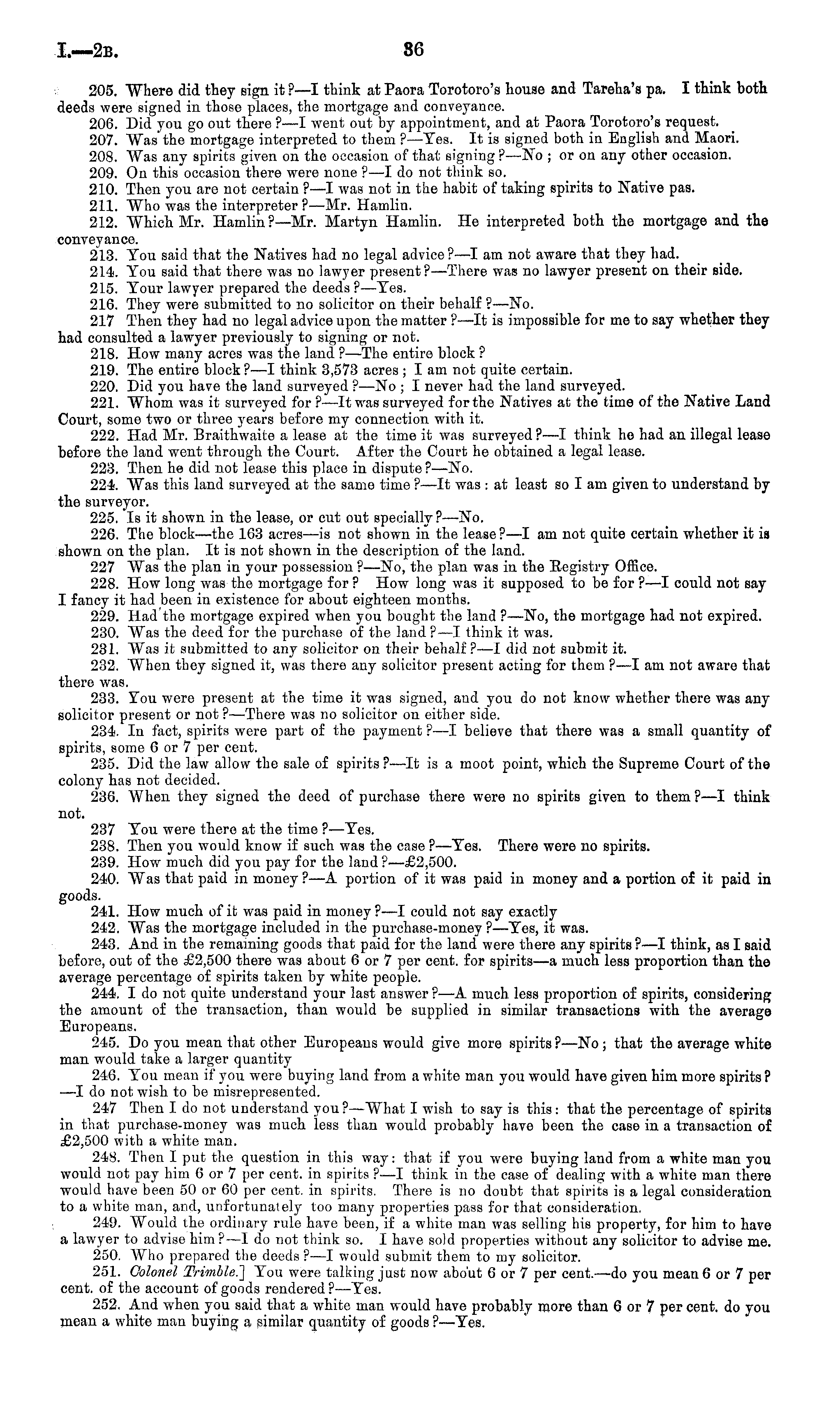 205. Where did they sign it ?—I think at Paora Torotoro's house and Tareha's pa. I think both deeds were signed in those places, the mortgage and conveyance. 206. Did you go out there ? —I went out by appointment, and at Paora Torotoro's request. 207. Was the mortgage interpreted to them ? —Yes. It is signed both in English and Maori. 208. AVas any spirits given on the occasion of that signing? —No ; or on any other occasion. 209. On this occasion there were none ? —I do not think so. 210. Then you are not certain ? —I was not in the habit of taking spirits to Native pas. 211. Who was the interpreter ?—Mr. Hamlin. 212. Which Mr. Hamlin ?—Mr. Martyn Hamlin. He interpreted both the mortgage and the conveyance. 213. You said that the Natives had no legal advice? —I am not aware that they had. 214. You said that there was no lawyer present? —There was no lawyer present on their side. 215. Your lawyer prepared the deeds ?—Yes. 216. They were submitted to no solicitor on their behalf ?—No. 217 Then they had no legal advice upon the matter ? —lt is impossible for me to say whether they had consulted a lawyer previously to signing or not. 218. How many acres was the land ?—The entire block ? 219. The entire block ? —I think 3,573 acres ;I am not quite certain. 220. Did you have the land surveyed ?—No ; I never had the land surveyed. 221. Whom was it surveyed for ?—lt was surveyed for the Natives at the time of the Native Land Court, some two or three years before my connection with it. 222. Had Mr. Braithwaite a lease at the time it was surveyed ?—I think he had an illegal lease before the land went through the Court. After the Court he obtained a legal lease. 223. Then he did not lease this place in dispute?—No. 224. Was this land surveyed at the same time ?—lt was : at least so I am given to understand by the surveyor. 225. Is it shown in the lease, or cut out specially?—No. 226. The block—the 163 acres —is not shown in the lease ? —I am not quite certain whether it ia shown on the plan. It is not shown in the description of the land. 227 Was the plan in your possession ?—No, the plan was in the Registry Office. 228. How long was the mortgage for ? How long was it supposed to be for ? —I could not say I fancy it had been in existence for about eighteen months. 229. Had the mortgage expired when you bought the land ? —No, the mortgage had not expired. 230. Was the deed for the purchase of the land ? —I think it was. 231. Was it submitted to any solicitor on their behalf? —I did not submit it. 232. When they signed it, was there any solicitor present acting for them ? —I am not aware that there was. 233. You were present at the time it was signed, and you do not know whether there was any solicitor present or not ?—There was no solicitor on either side. 234. In fact, spirits were part of the payment ? —I believe that there was a small quantity of spirits, some 6 or 7 per cent. 235. Did the law allow the sale of spirits?—lt is a moot point, which the Supreme Court of the colony has not decided. 236. When they signed the deed of purchase there were no spirits given to them ? —I think not. 237 You were there at the time ?—Yes. 238. Then you would know if such was the case ? —Yes. There were no spirits. 239. How much did you pay for the land ?—£2,500. 240. Was that paid in money ? —A portion of it was paid in money and a portion of it paid in goods. 241. How much of it was paid in money ?—I could not say exactly 242. Was the mortgage included in the purchase-money ?—Yes, it was. 243. And in the remaining goods that paid for the land were there any spirits?—l think, as I said before, out of the £2,500 there was about 6or 7 per cent, for spirits—a much less proportion than the average percentage of spirits taken by white people. 244. I do not quite understand your last answer?—A much less proportion of spirits, considering the amount of the transaction, than would be supplied in similar transactions with the average Europeans. 245. Do you mean that other Europeans would give more spirits?—No ; that the average white man would take a larger quantity 246. You mean if you were buying land from a white man you would have given him more spirits ? —I do not wish to be misrepresented. 247 Then Ido not understand you?—What I wish to say is this: that the percentage of spirits in that purchase-money was much less than would probably have been the case in a transaction of £2,500 with a white man. 248. Then I put the question in this way: that if you were buying land from a white man you would not pay him 6 or 7 per cent, in spirits ?—I think in the case of dealing with a white man there would have been 50 or 60 per cent, in spirits. There is no doubt that spirits is a legal consideration to a white man, and, unfortunately too many properties pass for that consideration. 249. Would the ordinary rule have been, if a white man was selling his property, for him to have a lawyer to advise him? —I do not think so. I have sold properties without any solicitor to advise me. 250. Who prepared the deeds ? —I would submit them to my solicitor. 251. Colonel Trimble.] You were talking just now about 6 or 7 per cent.—do you mean 6 or 7 per cent, of the account of goods rendered ? —-Yes. 252. And when you said that a white man would have probably more than 6 or 7 per cent, do you mean a white man buying a similar quantity of goods ?—Yes.