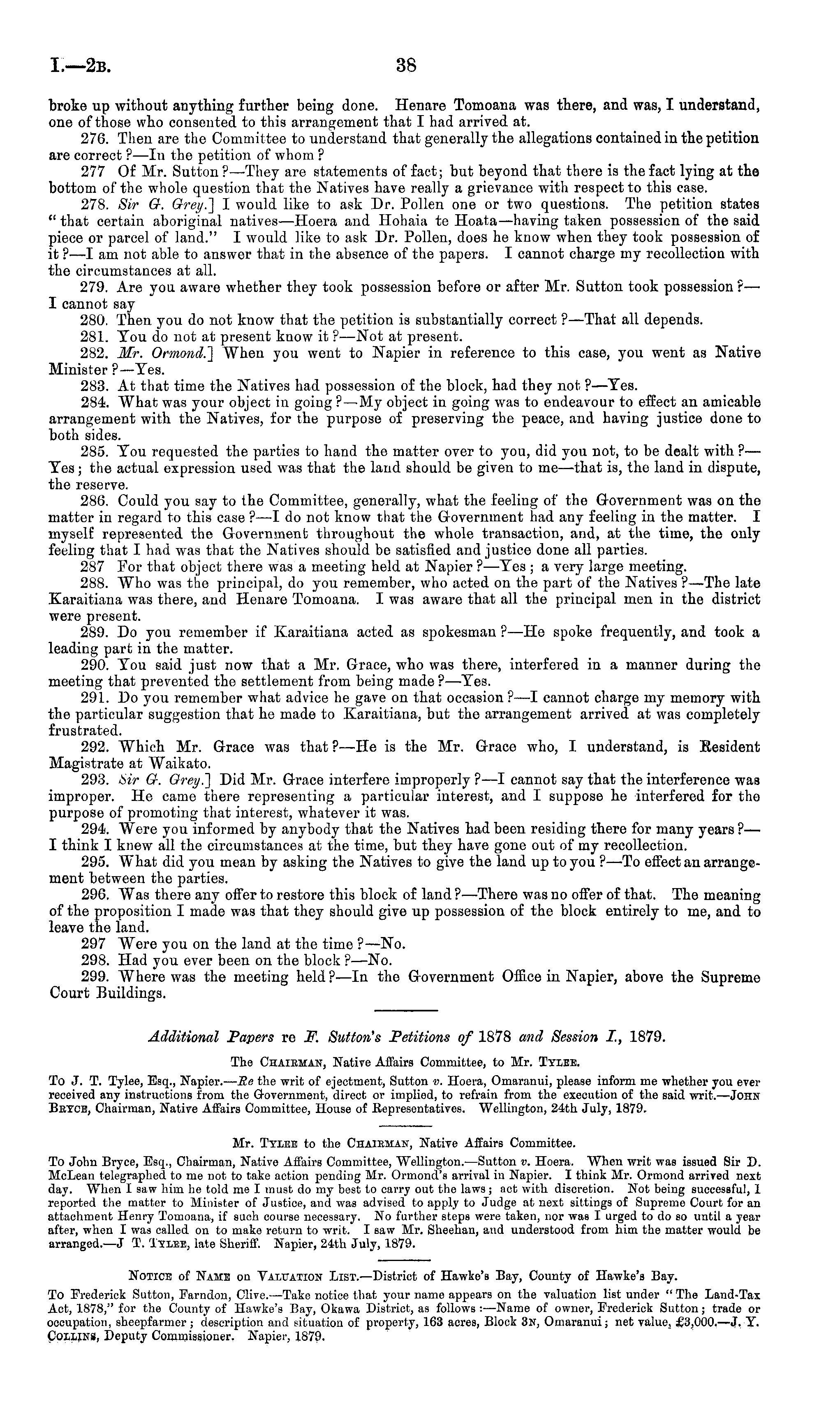 broke up without anything further being done. Henare Tomoana was there, and was, I understand, one of those who consented to this arrangement that I had arrived at. 276. Then are the Committee to understand that generally the allegations contained in the petition are correct ? —ln the petition of whom ? 277 Of Mr. Sutton ? —They are statements of fact; but beyond that there is the fact lying at the bottom of the whole question that the Natives have really a grievance with respect to this case. 278. Sir G. Grey.] I would like to ask Dr. Pollen one or two questions. The petition states " that certain aboriginal natives —Hoera and Hohaia te Hoata—having taken possession of the said piece or parcel of land." I would like to ask Dr. Pollen, does he know when they took possession of it ?—I am not able to answer that in the absence of the papers. I cannot charge my recollection with the circumstances at all. 279. Are you aware whether they took possession before or after Mr. Sutton took possession ? — I cannot say 280. Then you do not know that the petition is substantially correct ? —That all depends. 281. You do not at present know it ?—Not at present. 282. Mr. Ormond.] When you went to Napier in reference to this case, you went as Native Minister ? —Yes. 283. At that time the Natives had possession of the block, had they not ?—Yes. 284. What was your object in going ? —-My object in going was to endeavour to effect an amicable arrangement with the Natives, for the purpose of preserving the peace, and having justice done to both sides. 285. You requested the parties to hand the matter over to you, did you not, to be dealt with ?— Yes; the actual expression used was that the land should be given to me—that is, the land in dispute, the reserve. 286. Could you say to the Committee, generally, what the feeling of the Government was on the matter in regard to this case ? —I do not know that the Government had any feeling in the matter. I myself represented the Government throughout the whole transaction, and, at the time, the only feeling that I had was that the Natives should be satisfied and justice done all parties. 287 For that object there was a meeting held at Napier ?—Yes ; a very large meeting. 288. Who was the principal, do you remember, who acted on the part of the Natives ?—The late Karaitiana was there, and Henare Tomoana. I was aware that all the principal men in the district were present. 289. Do you remember if Karaitiana acted as spokesman ? —He spoke frequently, and took a leading part in the matter. 290. You said just now that a Mr. Grace, who was there, interfered in a manner during the meeting that prevented the settlement from being made ?—Yes. 291. Do you remember what advice he gave on that occasion ?—I cannot charge my memory with the particular suggestion that he made to Karaitiana, but the arrangement arrived at was completely frustrated. 292. Which Mr. Grace was that ? —He is the Mr. Grace who, I understand, is Resident Magistrate at Waikato. 293. Mr G. Grey.] Did Mr. Grace interfere improperly ?—I cannot say that the interference was improper. He came there representing a particular interest, and I suppose he interfered for the purpose of promoting that interest, whatever it was. 294. Were you informed by anybody that the Natives had been residing there for many years ?— I think I knew all the circumstances at the time, but they have gone out of my recollection. 295. What did you mean by asking the Natives to give the land up to you ?—To effect an arrangement between the parties. 296. Was there any offer to restore this block of land ?—There was no offer of that. The meaning of the proposition I made was that they should give up possession of the block entirely to me, and to leave the land. 297 Were you on the land at the time ? —No. 298. Had you ever been on the block ?—No. 299. Where was the meeting held ? —ln the Government Office in Napier, above the Supreme Court Buildings.