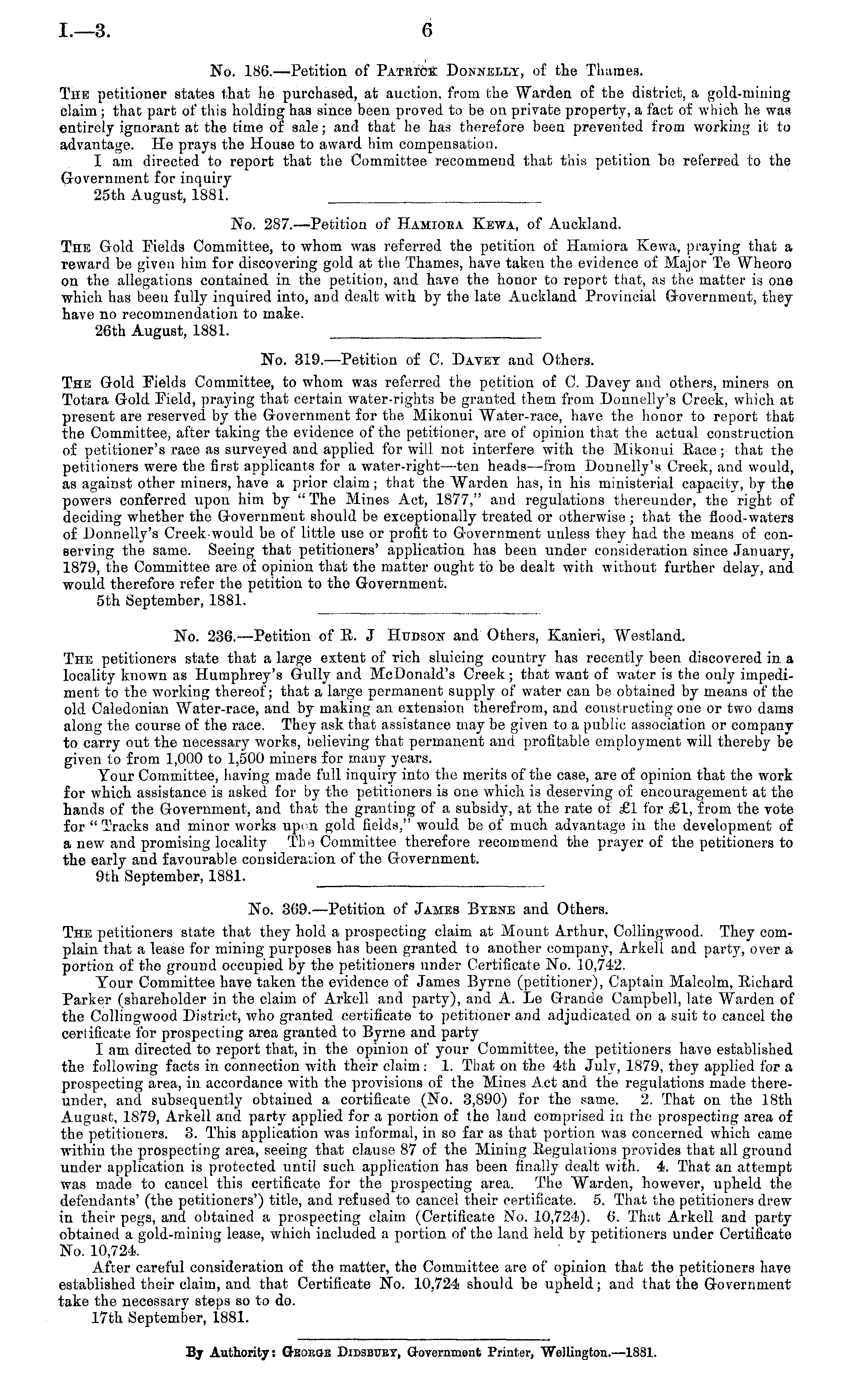 No. 186.—Petition of PATitrcE Donnelly, of the Thames. The petitioner states that he purchased, at auction, from the Warden of the district, a gold-mining claim; that part of this holding has since been proved to be on private property, a fact of which he was entirely ignorant at the time of sale; and that he has therefore been prevented from working it to advantage. He prays the Houae to award him compensation. I am directed to report that the Committee recommend that this petition be referred to the Government for inquiry 25th August, 1881.