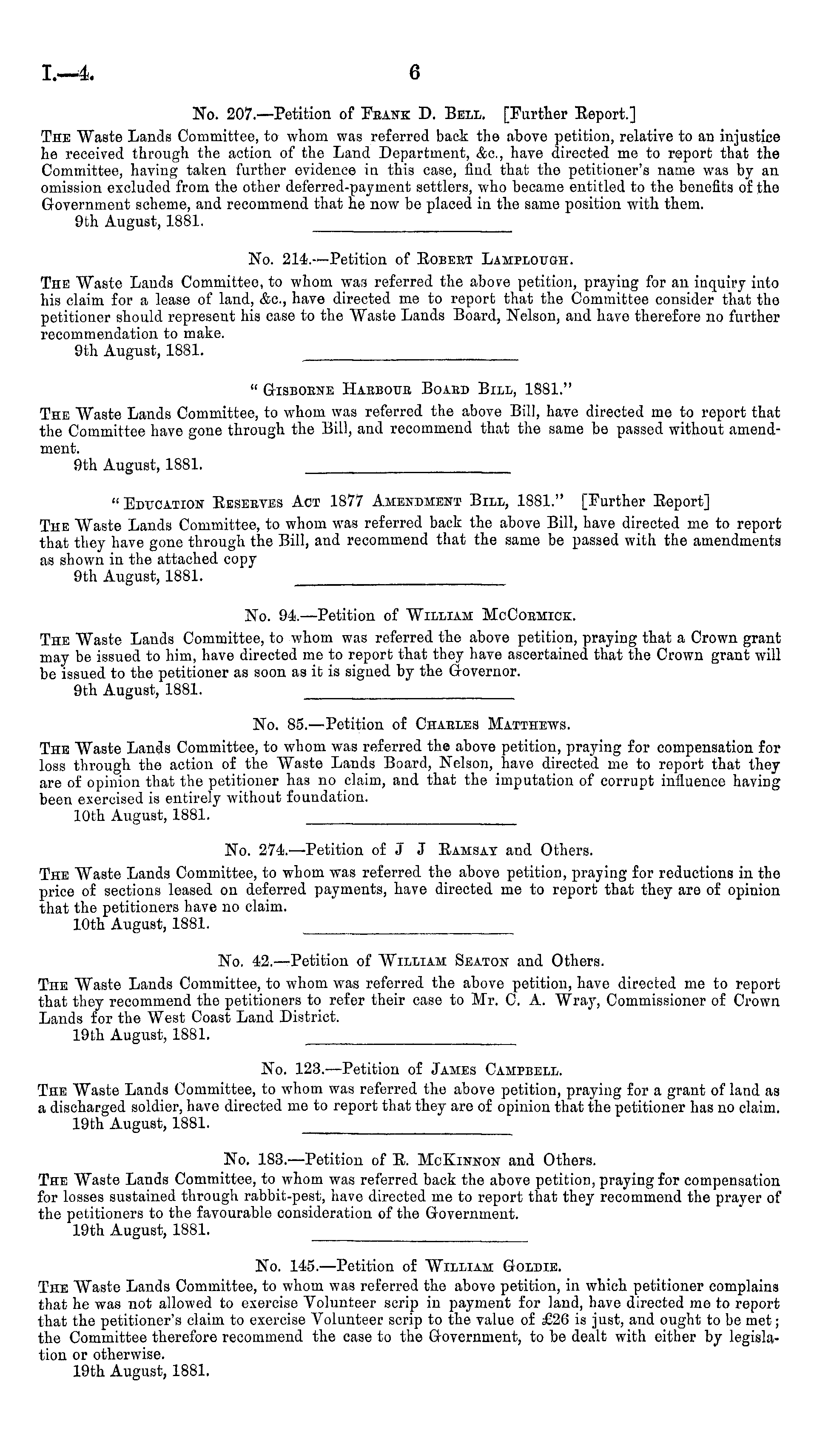 No. 207.—Petition of Feank D. Bell, [Further Eeport.] The Waste Lands Committee, to whom was referred back the above petition, relative to an injustice he received through the action of the Land Department, &c, have directed me to report that the Committee, having taken further evidence in this case, find that the petitioner's name was by an omission excluded from the other deferred-payment settlers, who became entitled to the benefits of the Government scheme, and recommend that he now be placed in the same position with them. 9th August, 1881.