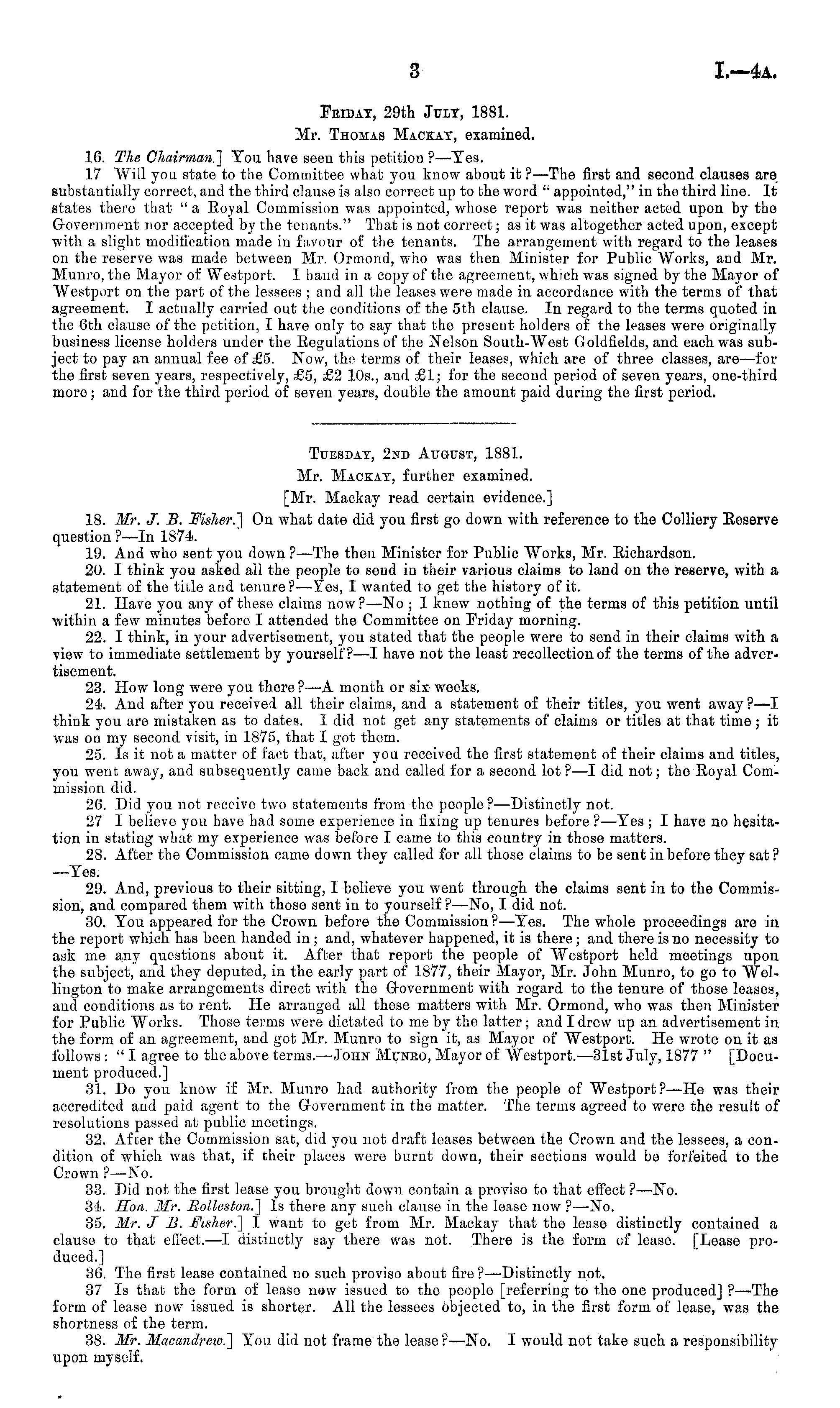 Tuesday, 2nd August, 1881. Mr. Mackay, further examined. [Mr. Mackay read certain evidence.] 18. Mr. J. B. Fisher.] On what date did you first go down with reference to the Colliery Reserve question ?—ln 1874. 19. And who sent you down ? —The then Minister for Public Works, Mr. Richardson. 20. I think you asked all the people to send in their various claims to land on the reserve, with a statement of the title and tenure?—xes, I wanted to get the history of it. 21. Have you any of these claims now?—No ; I knew nothing of the terms of this petition until within a few minutes before I attended the Committee on Friday morning. 22. I think, in your advertisement, you stated that the people were to send in their claims with a view to immediate settlement by yourself?—l have not the least recollection of the terms of the advertisement. 23. How long were you there ?—A month or six weeks. 24. And after you received all their claims, and a statement of their titles, you went away ?—I think you are mistaken as to dates. I did not get any statements of claims or titles at that time ;it was on my second visit, in 1875, that I got them. 25. Is it not a matter of fact that, after you received the first statement of their claims and titles, you went away, and subsequently came back and called for a second lot ? —I did not; the Royal Commission did. 26. Did you not receive two statements from the people ?—Distinctly not. 27 I believe you have had some experience in fixing up tenures before ? —Yes ; I have no hesitation in stating what my experience was before I came to this country in those matters. 28. After the Commission came down they called for all those claims to be sent in before they sat ? —Yes. 29. And, previous to their sitting, I believe you went through the claims sent in to the Commission, and compared them with those sent in to yourself ? —No, I did not. 30. You appeared for the Crown before the Commission?—Yes. The whole proceedings are in the report which has been handed in ; and, whatever happened, it is there ; and there is no necessity to ask me any questions about it. After that report the people of Westport held meetings upon the subject, and they deputed, in the early part of 1877, their Mayor, Mr. John Munro, to go to Wellington to make arrangements direct with the Government with regard to the tenure of those leases, and conditions as to rent. He arranged all these matters with Mr. Ormond, who was then Minister for Public Works. Those terms were dictated to me by the latter; and I drew up an advertisement in the form of an agreement, and got Mr. Munro to sign it, as Mayor of Westport. He wrote on it as follows :" I agree to the above terms. —John Muneo, Mayor of Westport.—3lst July, 1877 " [Document produced.] 31. Do you know if Mr. Munro had authority from the people of Westport?—He was their accredited and paid agent to the Government in the matter. The terms agreed to were the result of resolutions passed at public meetings. 32. After the Commission sat, did you not draft leases between the Crown and the lessees, a condition of which was that, if their places were burnt down, their sections would be forfeited to the Crown ? —No. 33. Did not the first lease you brought down contain a proviso to that effect ?—No. 34. Hon. Mr. Rolleston.] Is there any such clause in the lease now ? —No. 35. Mr. J B. Fisher^] I want to get from Mr. Mackay that the lease distinctly contained a clause to that effect.—l distinctly Bay there was not. There is the form of lease. [Lease produced.] 36. The first lease contained no such proviso about fire ? —Distinctly not. 37 Is that the form of lease now issued to the people [referring to the one produced] ?—The form of lease now issued is shorter. All the lessees objected to, in the first form of lease, was the shortness of the term. 38. Mr. Macandreio.] You did not frame the lease?—No. I would not take such a responsibility upon myself.