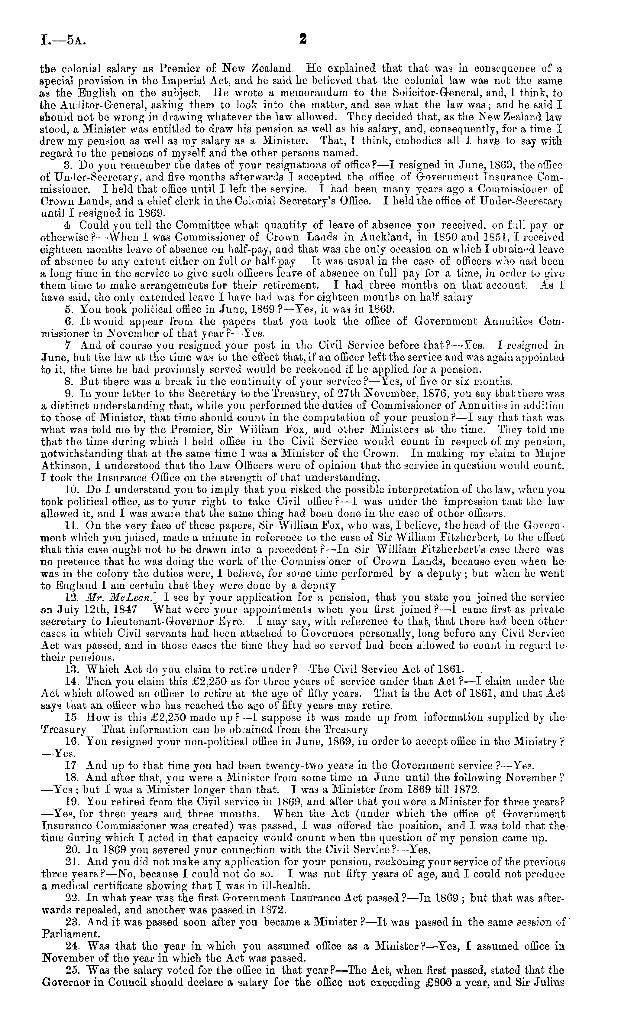 the colonial salary as Premier of New Zealand. He explained that that was in consequence of a special provision in the Imperial Act, and he said he believed that the colonial law was not the same as the English on the subject. He wrote a memorandum to the Solicitor-General, and, I think, to the Aulitor-General, asking them to look into the matter, and see what the law was; and he said I should not be wrong in drawing whatever the law allowed. They decided that, as the New Zealand law stood, a Minister was entitled to draw his pension as well as his salary, and, consequently, for a time I drew my pension as well as my salary as a Minister. That, I think, embodies all 1 have to say with regard to the pensions of myself and the other persons named. 3. Do you remember the dates of your resignations of office?—l resigned in June, 18G9, the office of Un<ler-Secretary, and five months afterwards I accepted the office of Government Insurance Commissioner. I held that office until I left the service. I had been many years ago a Commissioner of Crown Lands, and a chief clerk in the Colonial Secretary's Office. I held the office of Uuder-Seeretary until I resigned in 1869. 4 Could you tell the Committee what quantity of leave of absence you received, on full pay or otherwise? —When I was Commissioner of Crown Lands in Auckland, in 1850 and 1851, I received eighteen months leave of absence on half-pay, and that was the only occasion on which I obiained leave of absence to any extent either on full or half pay It was usual in the case of officers who had been a long time in the service to give such officers leave of absence on full pay for a time, in order to give them time to make arrangements for their retirement. I had three months on that account. As I have said, the only extended leave I have had was for eighteen months on half salary 5. You took political office in June, 1869 ?—Yes, it was in 1869. 6. It would appear from the papers that you took the office of Government Annuities Commissioner in November of that year ? —Yes. 7 And of course you resigned your post in the Civil Service before that?— Yes. I resigned in June, but the law at the time was to the effect that, if an officer left the service and was again appointed to it, the time he had previously served would be reckoned if he applied for a pension. 8. But there was a break in the continuity of your service? —Yes, of five or six months. 9. In your letter to the Secretary to the Treasury, of 27th November, 1876, you say that there was a distinct understanding that, while you performed the duties of Commissioner of Annuities in addition to those of Minister, that time should count in the computation of your pension? —I say that that was what was told me by the Premier, Sir William Fox, and other Ministers at the time. They told me that the time during which I held office in the Civil Service would count in respect of my pension, notwithstanding that at the same time I was a Minister of the Crown. In making my claim to Major Atkinson, I understood that the Law Officers were of opinion that the service in question would count. I took the Insurance Office on the strength of that understanding. 10. Do I understand you to imply that you risked the possible interpretation of the law, when you took political office, as to your right to take Civil office ?—I was under the impression that the law allowed it, and I was aware that the same thing had been done in the case of other officers. 11. On the very face of these papers, Sir William Fox, who was, I believe, the head of the Government which you joined, made a minute in reference to the case of Sir William Fitzherbert, to the effect that this case ought not to be drawn into a precedent ?—ln Sir William Fitzherbert's case there was no pretence that he was doing the work of the Commissioner of Crown Lands, because even when he was in the colony the duties were, 1 believe, for some time performed by a deputy; but when he went to England I am certain that they were done by a deputy 12. Mr. McLean.] I see by your application for a pension, that you state you joined the service on July 12th, 1847 What were your appointments when you first joined? —I came first as private secretary to Lieutenant-Governor Eyre. I may say, with reference to that, that there had been other cases in which Civil servants had been attached to Governors personally, long before any Civil Service Act was passed, and in those cases the time they had so served had been allowed to count in regard to their pensions. 13. Which Act do you claim to retire under? —The Civil Service Act of 1861. 14. Then you claim this £2,250 as for three years of service under that Act ?—I claim under the Act which allowed an officer to retire at the age of fifty years. That is the Act of 1861, and that Act says that an officer who has reached the age of fifty years may retire. 15- How is this £2,250 made up? —I suppose it was made up from information supplied by the Treasury That information can be obiained from the Treasury 16. You resigned your non-political office in June, 1569, in order to accept office in the Ministry ? —Yes. 17 And up to that time you had been twenty-two years in the Government service ? —Yes. 18. And after that, you were a Minister from some time in June until the following November ? —Yes ; but I was a Minister longer than that. I was a Minister from 1869 till 1872. 19. You retired from the Civil service in 1869, and after that you were a Minister for three years? —Yes, for three years and three months. When the Act (under which the office of Government Insurance Commissioner was created) was passed, I was offered the position, and I was told that the time during which I acted in that capacity would count when the question of my pension came up. 20. In 1869 you severed your connection with the Civil Service ? —Yes. 2L. And you did not make any application for your pension, reckoning you