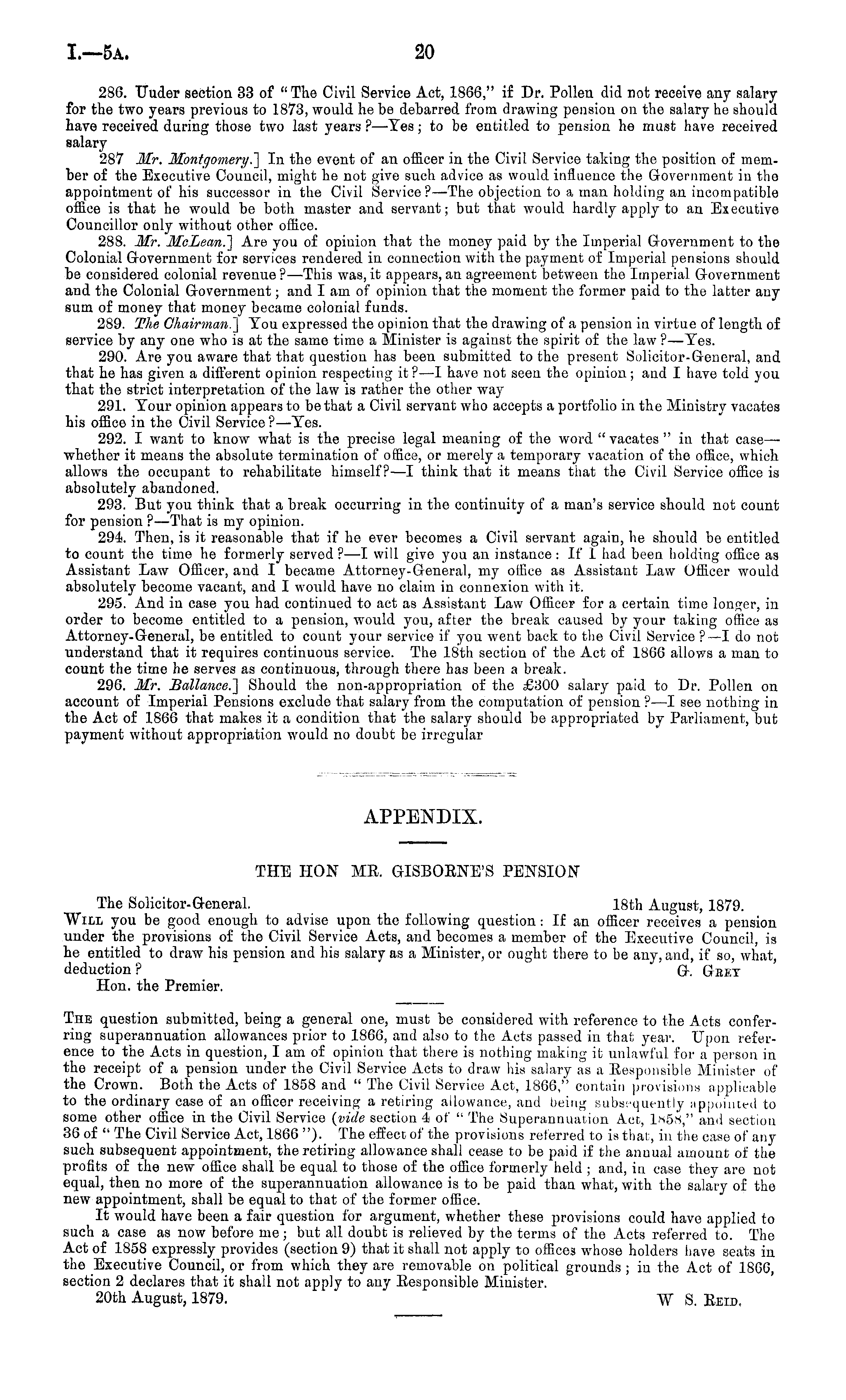 286. Uuder section 33 of "The Civil Service Act, 1866," if Dr. Pollen did not receive any salary for the two years previous to 1873, would he be debarred from drawing pension on the salary he should have received during those two last years ?—Yes; to be entitled to pension he must have received salary 287 Mr. Montgomery, .] In the event of an officer in the Civil Service taking the position of member of the Executive Council, might he not give such advice as would influence the Government in the appointment of his successor in the Civil Service? —The objection to a man holding an incompatible office is that he would be both master and servant; but that would hardly apply to an Executive Councillor only without other office. 288. Mr. McLean.'] Are you of opinion that the money paid by the Imperial Government to the Colonial Government for services rendered in connection with the payment of Imperial pensions should be considered colonial revenue ?—This was, it appears, an agreement between the Imperial Government and the Colonial Government; and lam of opinion that the moment the former paid to the latter any sum of money that money became colonial funds. 289. The Chairman.^ You expressed the opinion that the drawing of a pension in virtue of length of service by any one who is at the same time a Minister is against the spirit of the law ?—Yes. 290. Are you aware that that question has been submitted to the present Solicitor-General, and that he has given a different opinion respecting it? —I have not seen the opinion; and I have told you that the strict interpretation of the law is rather the other way 291. Your opinion appears to be that a Civil servant who accepts a portfolio in the Ministry vacates his office in the Civil Service ?—Yes. 292. I want to know what is the precise legal meaning of the word " vacates " in that case — whether it means the absolute termination of office, or merely a temporary vacation of the office, which allows the occupant to rehabilitate himself? —I think that it means that the Civil Service office is absolutely abandoned. 293. But you think that a break occurring in the continuity of a man's service should not count for pension ?—That is my opinion. 294. Then, is it reasonable that if he ever becomes a Civil servant again, he should be entitled to count the time he formerly served ?—I will give you an instance: If 1 had been holding office as Assistant Law Officer, and I became Attorney-General, my office as Assistant Law Officer would absolutely become vacant, and I would have no claim in connexion with it. 295. And in case you had continued to act as Assistant Law Officer for a certain time longer, in order to become entitled to a pension, would you, after the break caused by your taking office as Attorney-General, be entitled to count your service if you went back to the Civil Service ? —I do not understand that it requires continuous service. The 18th section of the Act of 1866 allows a man to count the time he serves as continuous, through there has been a break. 296. Mr. Ballance.~] Should the non-appropriation of the £300 salary paid to Dr. Pollen on account of Imperial Pensions exclude that salary from the computation of pension ?—I see nothing in the Act of 1866 that makes it a condition that the salary should be appropriated by Parliament, but payment without appropriation would no doubt be irregular