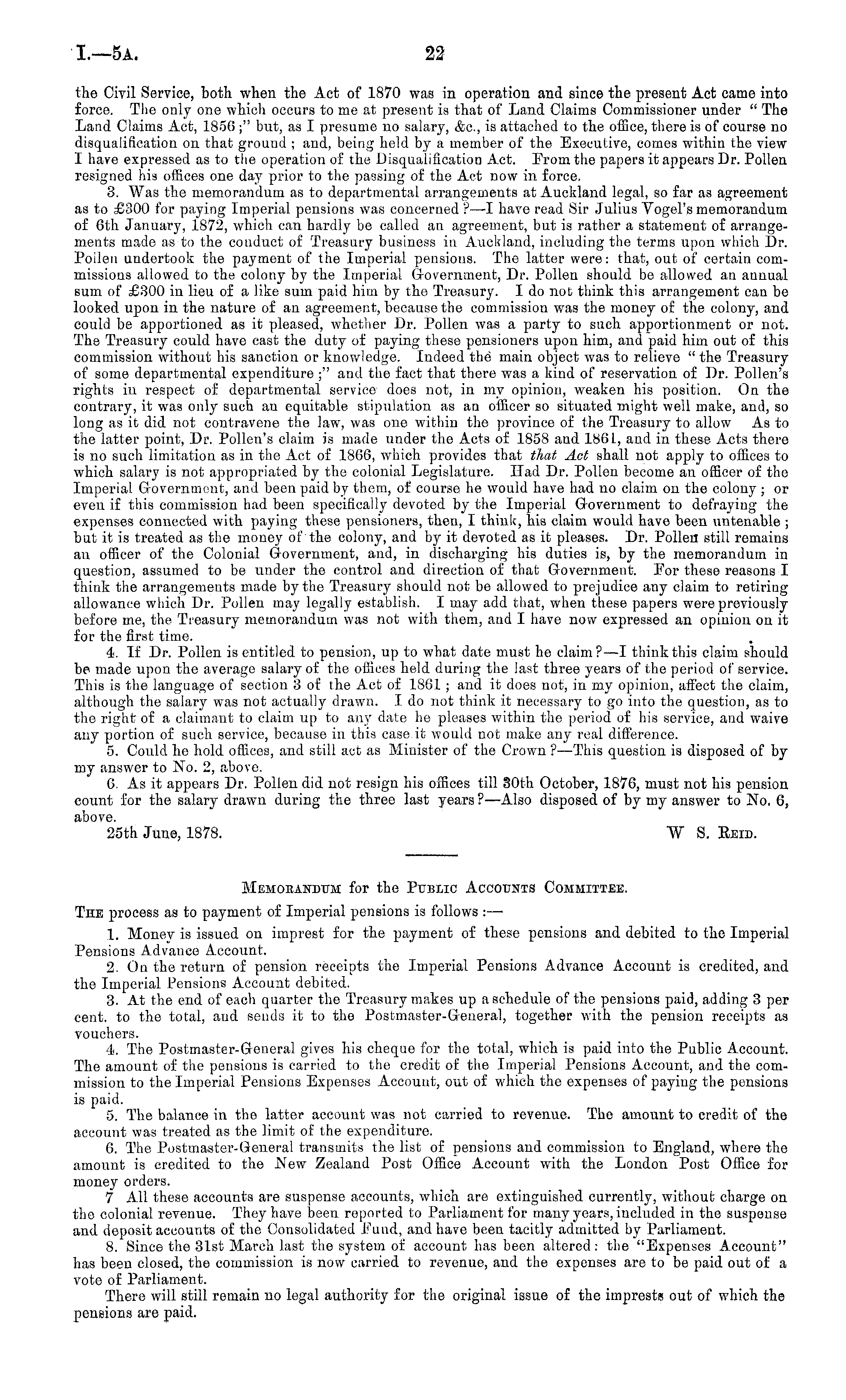 the Civil Service, both when the Act of 1870 was in operation and since the present Act came into force. The only one which occurs to me at present is that of Land Claims Commissioner under " The Land Claims Act, 1856 ;" but, as I presume no salary, Ac, is attached to the office, there is of course no disqualification on that ground ; and, being held by a inemher of the Executive, comes within the view I have expressed as to the operation of the Disqualification Act. From the papers it appears Dr. Pollen resigned his offices one day prior to the passing of the Act now in force. 3. Was the memorandum as to departmental arrangements at Auckland legal, so far as agreement as to £300 for paying Imperial pensions was concerned ?—I have read Sir Julius Vogel's memorandum of 6th January, 1872, which can hardly be called an agreement, but is rather a statement of arrangements made as to the conduct of Treasury business in Auckland, including the terms upon which Dr. Poilen undertook the payment of the Imperial pensions. The latter were: that, out of certain commissions allowed to the colony by the Imperial Government, Dr. Pollen should be allowed an annual sum of £300 in lieu of a like sum paid him by the Treasury. Ido not think this arrangement can be looked upon in the nature of an agreement, because the commission was the money of the colony, and could be apportioned as it pleased, whether Dr. Pollen was a party to such apportionment or not. The Treasury could have cast the duty of paying these pensioners upon him, and paid him out of this commission without his sanction or knowledge. Indeed the main object was to relieve " the Treasury of some departmental expenditure ;" and the fact that there was a kind of reservation of Dr. Pollen's rights in respect of departmental service does not, in my opinion, weaken his position. On the contrary, it was only such an equitable stipulation as an officer so situated might well make, and, so long as it did not contravene the law, was one within the province of the Treasury to allow As to the latter point, Dr. Pollen's claim is made under the Acts of 1858 and 186 L, and in these Acts there is no such limitation as in the Act of 1866, which provides that that Act shall not apply to offices to which salary is not appropriated by the colonial Legislature. Had Dr. Pollen become an officer of the Imperial Government, and been paid by them, of course he would have had no claim on the colony ; or even if this commission had been specifically devoted by the Imperial Government to defraying the expenses connected with paying these pensioners, then, I think, his claim would have been untenable ; but it is treated as the money of the colony, and by it devoted as it pleases. Dr. Pollen still remains an officer of the Colonial Government, and, in discharging his duties is, by the memorandum in question, assumed to be under the control and direction of that Government. For these reasons I think the arrangements made by the Treasury should not be allowed to prejudice any claim to retiring allowance which Dr. Pollen may legally establish. I may add that, when these papers were previously before me, the Treasury memorandum was not with them, and I have now expressed an opinion on it for the first time. 4. If Dr. Pollen is entitled to pension, up to what date must he claim?—l think this claim should be made upon the average salary of the offices held during the last three years of the period of service. This is the language of section 3 of the Act of 1861 ; and it does not, in my opinion, affect the claim, although the salary was not actually drawn. Ido not think it necessary to go into the question, as to the right of a claimant to claim up to any date he pleases within the period of his service, and waive any portion of such service, because in this case it would not make any real difference. 5. Could he hold offices, and still act as Minister of the Crown ? —This question is disposed of by my answer to No. 2, above. 6. As it appears Dr. Pollen did not resign his offices till 30th October, 1876, must not his pension count for the salary drawn during the three last years ?—Also disposed of by my answer to No. 6, above. 25th. June, 1878. W S. Eeid.