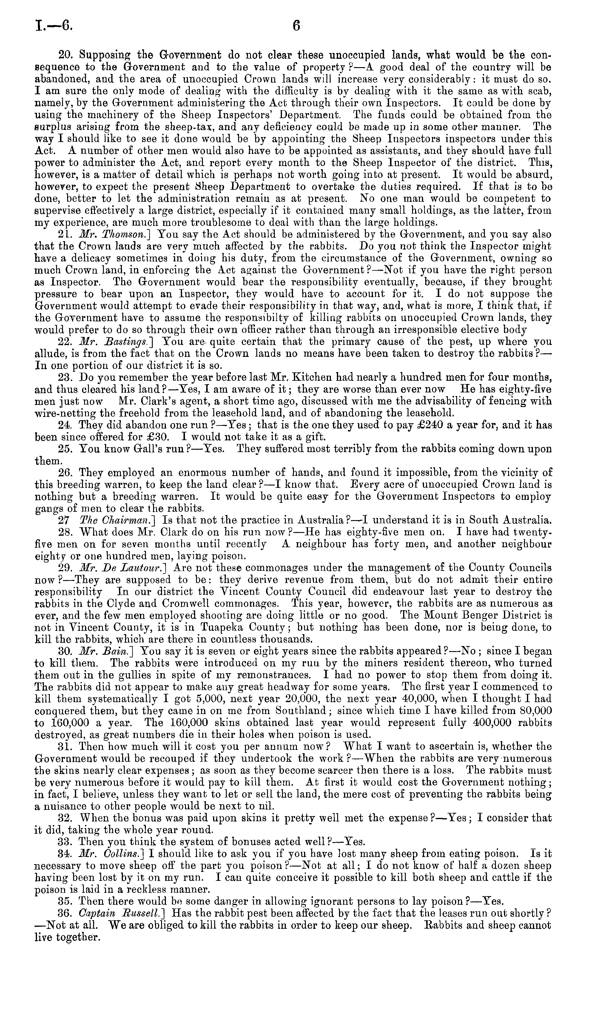 20. Supposing the G-overnment do not clear these unoccupied lands, what would be the consequence to the Government and to the value of property ? —A. good deal of the country will be abandoned, and the area of unoccupied Crown lands will increase very considerably: it must do so. I am sure the only mode of dealing with the difficulty is by dealing with it the same as with scab, namely, by the Government administering the Act through their own Inspectors. It could be done by using the machinery of the Sheep Inspectors' Department. The funds could be obtained from the surplus arising from the sheep-tax, and any deficiency could be made up in some other manner. The way I should like to see it done would be by appointing the Sheep Inspectors inspectors under this Act. A number of other men would also have to be appointed as assistants, and they should have full power to administer the Act, and report every month to the Sheep Inspector of the district. This, however, is a matter of detail which is perhaps not worth going into at present. It would be absurd, however, to expect the present Sheep Department to overtake the duties required. If that is to be done, better to let the administration remain as at present. No one man would be competent to supervise effectively a large district, especially if it contained many small holdings, as the latter, from my experience, are much more troublesome to deal with than the large holdings. 21. Mr. Thomson.] You say the Act should be administered by the Government, and you say also that the Crown lands are very much affected by the rabbits. Do you not think the Inspector might have a delicacy sometimes in doing his duty, from the circumstance of the Government, owning so much Crown land, in enforcing the Act against the Government? —Not if you have the right person as Inspector. The Government would bear the responsibility eventually, because, if they brought pressure to bear upon an Inspector, they would have to account for it. I do not suppose the Government would attempt to evade their responsibility in that way, and, what is more, I think that, if the Government have to assume the responsibilty of killing rabbits on unoccupied Crown lands, they would prefer to do so through their own officer rather than through an irresponsible elective body 22. Mr. Bastings.] You are- quite certain that the primary cause of the pest, up where you allude, is from the fact that on the Crown lands no means have been taken to destroy the rabbits ?— In one portion of our district it is so. 23. Do you remember the year before last Mr. Kitchen had nearly a hundred men for four months, and thus cleared his land ? —Yes, lam aware of it; they are worse than ever now He has eighty-five men just now Mr. Clark's agent, a short time ago, discussed with me the advisability of fencing with wire-netting the freehold from the leasehold land, and of abandoning the leasehold. 24. They did abandon one run ? —Yes ; that is the one they used to pay £240 a year for, and it has been since offered for £30. I would not take it as a gift. 25. You know Gall's run ? —Yes. They suffered most terribly from the rabbits coming down upon them. 26. They employed an enormous number of hands, and found it impossible, from the vicinity of this breeding warren, to keep the land clear?—l know that. Every acre of unoccupied Crown land is nothing but a breeding warren. It would be quite easy for the Government Inspectors to employ gangs of men to clear the rabbits. 27 The Chairman.'] Is that not the practice in Australia?—l understand it is in South Australia. 28. What does Mr. Clark do on his run now ? —He has eighty-five men on. I have had twentyfive men on for seven months until recently A neighbour has forty men, and another neighbour eight f or one hundred men, laying poison. 29. Mr. De Lautour.~) Are not these commonages under the management of the County Councils now ?—They are supposed to be: they derive revenue from them, but do not admit their entire responsibility In our district the Vincent County Council did endeavour last year to destroy the rabbits in the Clyde and Cromwell commonages. This year, however, the rabbits are as numerous as ever, and the few men employed shooting are doing little or no good. The Mount Benger District is not in Vincent County, it is in Tuapeka County; but nothing has been done, nor is being done, to kill the rabbits, which are there in countless thousands. 30. Mr. Bain.] You say it is seven or eight years since the rabbits appeared ? —-No ; since I began to kill them. The rabbits were introduced on my run by the miners resident thereon, who turned them out in the gullies in spite of my remonstrances. I had no power to stop them from doing it. The rabbits did not appear to make any great headway for some years. The first year I commenced to kill them systematically I got 5,000, next year 20,000, the next year 40,000, when I thought I had conquered them, but they came in on me from Southland ; since which time I have killed from 80,000 to 160,000 a year. The 160,000 skins obtained last year would represent fully 400,000 rabbits destroyed, as great numbers die in their holes when poison is used. 31. Then how much will it cost you per annum now ? "What I want to ascertain is, whether the Government would be recouped if they undertook the work ? —When the rabbits are very numerous the skins nearly clear expenses ; as soon as they become scarcer then there is a loss. The rabbits must be very numerous before it would pay to kill them. At first it would cost the Government nothing; in fact, I believe, unless they want to let or sell the land, the mere cost of preventing the rabbits being a nuisance to other people would be next to nil. 32. When the bonus was paid upon skins it pretty well met the expense ?—Yes; I consider that it did, taking the whole year round. 33. Then you think the system of bonuses acted well ? —Yes. 34. Mr. Collins.] I sh