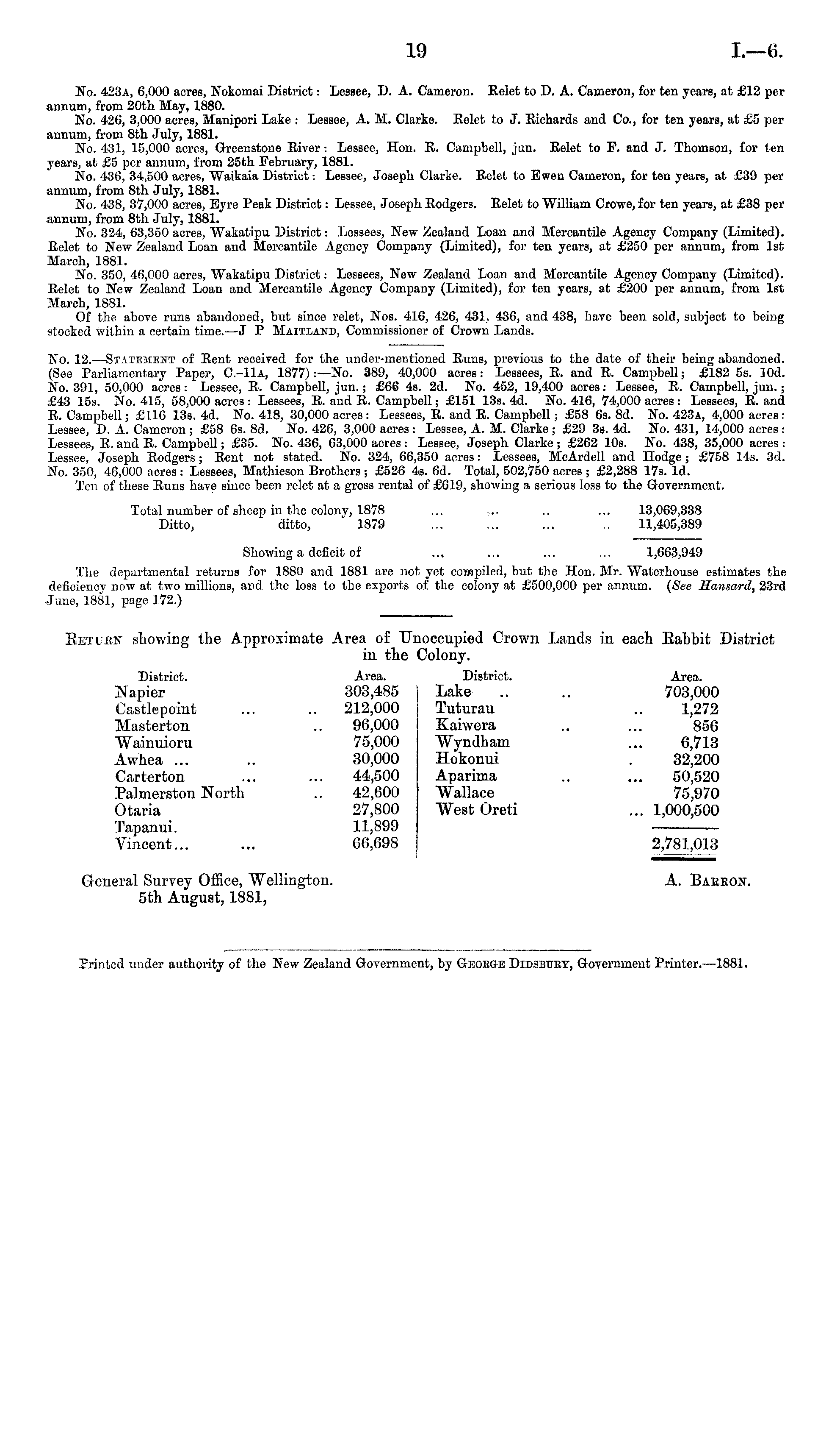 No. 12. —Statement of Rent received for the under-mentioned Runs, previous to the date of their being abandoned. (See Parliamentary Paper, C.-IU, 1877):—No. 389, 40,000 acres: Lessees, E. and R. Campbell; £182 ss. ]od. 3STo. 391, 50,000 acres: Lessee, E. Campbell, jun.; £66 4s. 2d. No. 452, 19,400 acres: Lessee, R. Campbell, jun.; £43 15s. No. 415, 58,000 acres : Lessees, R. and R. Campbell; £151 13s. 4d. No. 416, 74,000 acres: Lessees, E. and R. Campbell; £116 13s. 4d. No. 418, 30,000 acres : Lessees, R. and E. Campbell ; £58 6s. Bd. No. 423a, 4,000 acres: Lessee, D. A. Cameron ; £58 6s. Bd. No. 426, 3,000 acres : Lessee, A. M. Clarke; £29 3s. 4d. No. 431, 14,000 acres : Lessees, R. and R. Campbell; £35. No. 436, 63,000 acres : Lessee, Joseph Clarke ; £262 10s. No. 438, 35,000 acres : Lessee, Joseph Rodgers; Rent not stated. No. 324, 66,350 acres: Lessees, McArdell and Hodge; £758 14s. 3d. No. 350, 46,000 acres : Lessees, Mathieson Brothers ; £526 4s. 6d. Total, 502,750 acres ; £2,288 17s. Id. Ten of these Runs have since been relet at a gross rental of £619, showing a serious loss to the Government. Total number of sheep in the colony, 1878 ... ~. .. ... 13,069,338 Ditto, ditto, 1879 ... ... ... .. 11,405,389 Showing a deficit of ... ... ... ... 1,663,949 The departmental returns for 1880 and 1881 are not yet compiled, but tlie Hon. Mr. Waterhouse estimates the deficiency now at two millions, and the loss to the exports of the colony at £500,000 per annum. (See Hansard, 23rd June, 1881, page 172.)