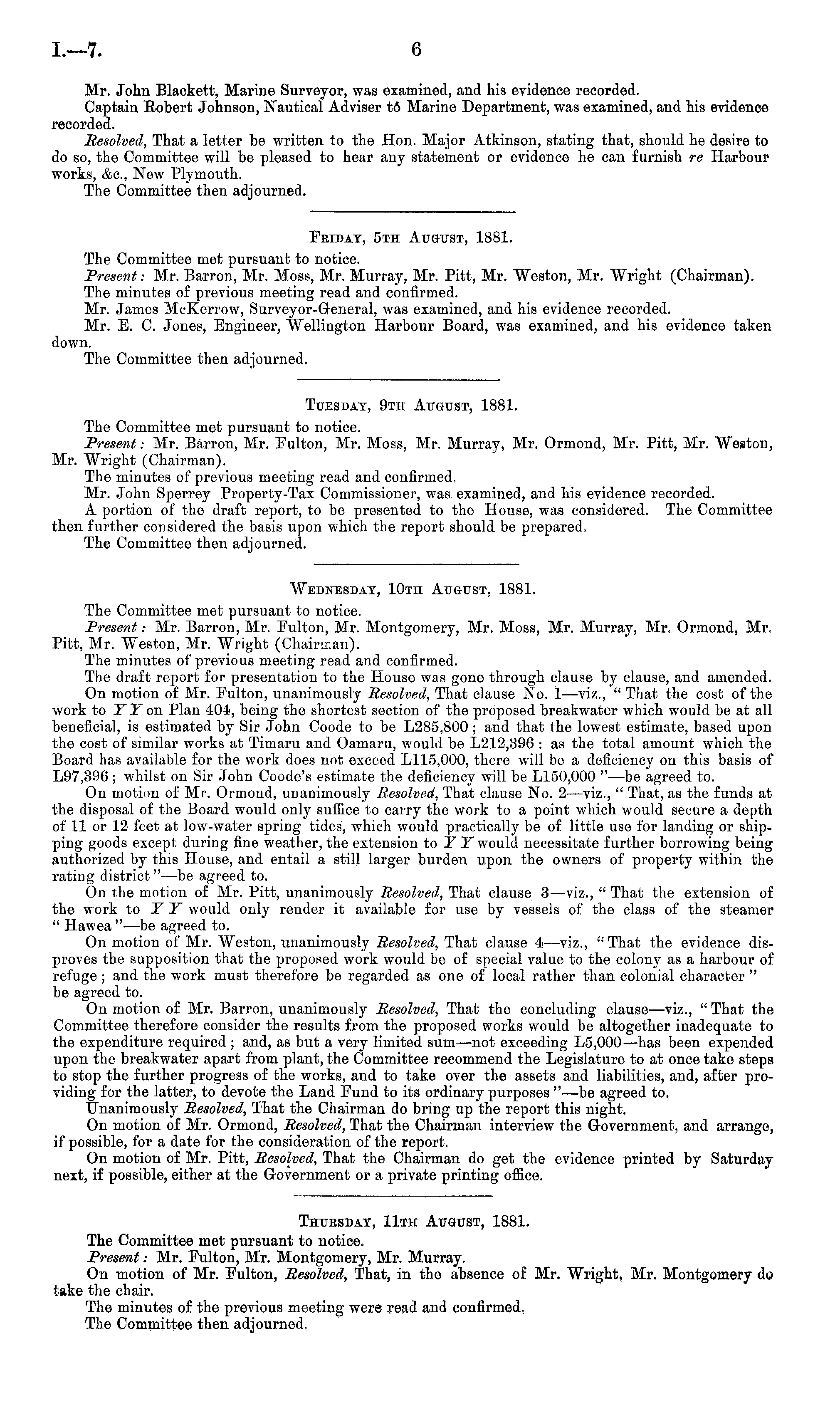 Wednesday, 10th August, 1881. The Committee met pursuant to notice. Present: Mr. Barron, Mr. Fulton, Mr. Montgomery, Mr. Moss, Mr. Murray, Mr. Ormond, Mr. Pitt, Mr. Weston, Mr. Wright (Chairman). The minutes of previous meeting read and confirmed. The draft report for presentation to the House was gone through clause by clause, and amended. On motion of Mr. Fulton, unanimously Besolved, That clause No. I—viz., " That the cost of the work to YY on Plan 404, being the shortest section of the proposed breakwater which would be at all beneficial, is estimated by Sir John Coode to be L 285,800; and that the lowest estimate, based upon the cost of similar works at Timaru and Oamaru, would be L 212,396 : as the total amount which the Board has available for the work does not exceed L 115,000, there will be a deficiency on this basis of L 97,396; whilst on Sir John Coode's estimate the deficiency will be L 150,000 " —be agreed to. On motion of Mr. Ormond, unanimously Resolved, That clause No. 2—viz., " That, as the funds at the disposal of the Board would only suffice to carry the work to a point which would secure a depth of 11 or 12 feet at low-water spring tides, which would practically be of little use for landing or shipping goods except during fine weather, the extension to V V would necessitate further borrowing being authorized by this House, and entail a still larger burden upon the owners of property within the rating district" —be agreed to. On the motion of Mr. Pitt, unanimously Resolved, That clause 3 —viz., " That the extension of the work to YY would only render it available for use by vessels of the class of the steamer " Hawea" —be agreed to. On motion of Mr. Weston, unanimously Resolved, That clause 4 —viz., "That the evidence disproves the supposition that the proposed work would be of special value to the colony as a harbour of refuge ; and the work must therefore be regarded as one of local rather than colonial character " be agreed to. On motion of Mr. Barron, unanimously Resolved, That the concluding clause—viz., " That the Committee therefore consider the results from the proposed works would be altogether inadequate to the expenditure required ; and, as but a very limited sum —not exceeding L 5,00 been expended upon the breakwater apart from plant, the Committee recommend the Legislature to at once take steps to stop the further progress of the works, and to take over the assets and liabilities, and, after providing for the latter, to devote the Land Fund to its ordinary purposes " —be agreed to. Unanimously Besolved, That the Chairman do bring up the report this night. On motion of Mr. Ormond, Besolved, That the Chairman interview the Government, and arrange, if possible, for a date for the consideration of the report. On motion of Mr. Pitt, Resolved, That the Chairman do get the evidence printed by Saturday next, if possible, either at the Government or a private printing office.
