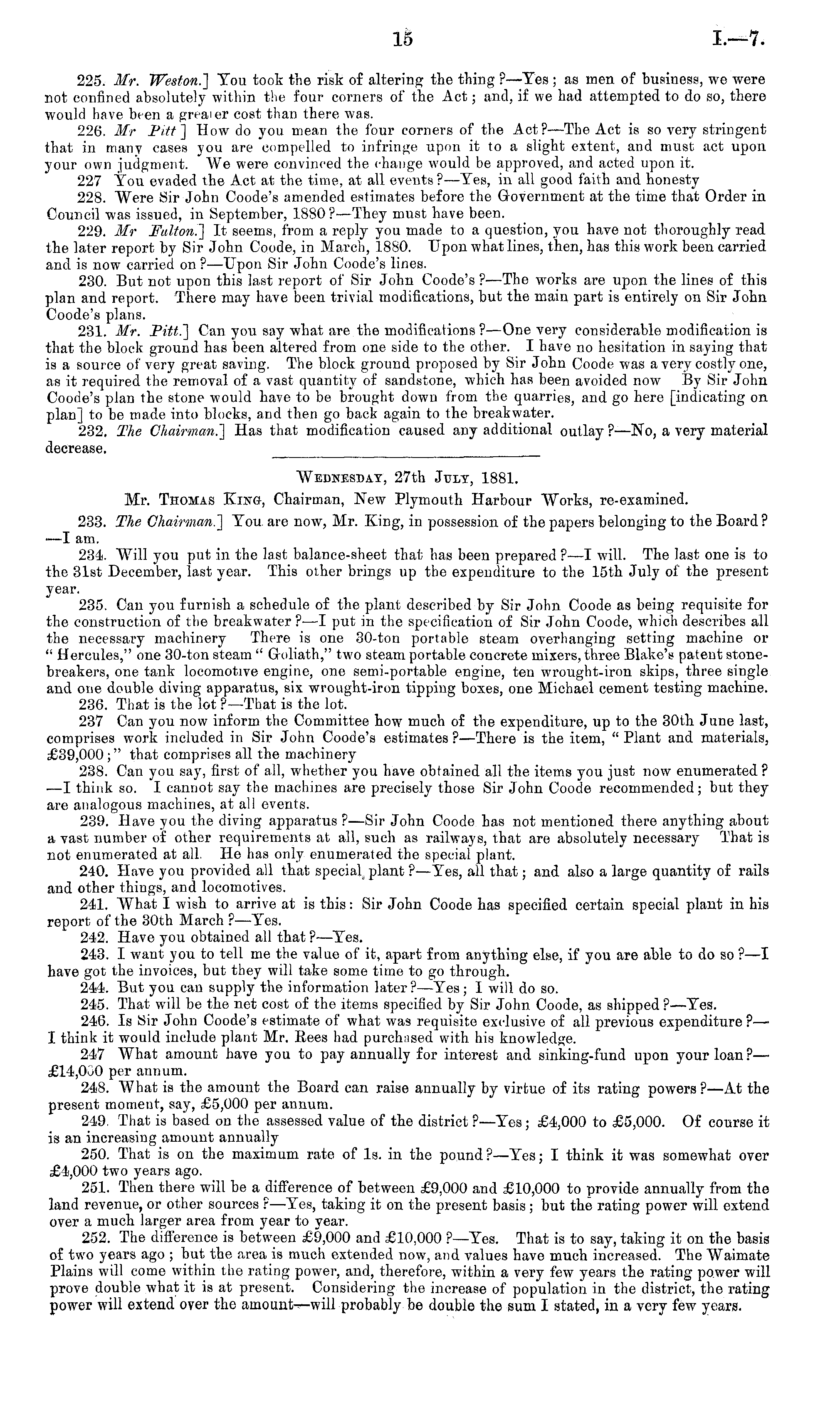 Wednesday, 27th July, 1881. Mr. Thomas King, Chairman, New Plymouth Harbour Works, re-examined. 233. The Chairman.] You are now, Mr. King, in possession of the papers belonging to the Board ? —I am. 234. Will you put in the last balance-sheet that has been prepared ?■ —I will. The last one is to the 31st December, last year. This other brings up the expenditure to the 15th July of the present year--235. Can you furnish a schedule of the plant described by Sir John Coode as being requisite for the construction of the breakwater ? —I put in the specification of Sir John Coode, which describes all the necessary machinery There is one 30-ton portable steam overhanging setting machine or " Hercules," one 30-ton steam " Goliath," two steam portable concrete mixers, three Blake's patent stonebreakers, one tank locomotive engine, one semi-portable engine, ten wrought-iron skips, three single and one double diving apparatus, six wrought-iron tipping boxes, one Michael cement testing machine. 236. That is the lot ?—That is the lot. 237 Can you now inform the Committee how much of the expenditure, up to the 30th June last, comprises work included in Sir John Coode's estimates ?—There is the item, " Plant and materials, £39,000 ;" that comprises all the machinery 238. Can you say, first of all, whether you have obtained all the items you just now enumerated? —I think so. I cannot say the machines are precisely those Sir John Coode recommended; but they are analogous machines, at all events. 239. Have you the diving apparatus ?—Sir John Coode has not mentioned there anything about a vast number of other requirements at all, such as railways, that are absolutely necessary That is not enumerated at all. He has only enumerated the special plant. 240. Have you provided all that special plant ? —Yes, all that; and also a large quantity of rails and other things, and locomotives. 241. What I wish to arrive at is this: Sir John Coode has specified certain special plant in his report of the 30th March ? —Yes. 242. Have you obtained all that ? —Yes. 243. I want you to tell me the value of it, apart from anything else, if you are able to do so ? —I have got the invoices, but they will take some time to go through. 244. But you can supply the information later?— Yes; I will do so. 245. That will be the net cost of the items specified by Sir John Coode, as shipped ? —Yes. 246. Is Sir John Coode's estimate of what was requisite exclusive of all previous expenditure ?—■ I think it would include plant Mr. Eees had purchased with his knowledge. 247 What amount have you to pay annually for interest and sinking-fund upon your loan ?— £14,0^0 per annum. 248. What is the amount the Board can raise annually by virtue of its rating powers?—At the present moment, say, £5,000 per annum. 249. That is based on the assessed value of the district ?—Yes; £4,000 to £5,000. Of course it is an increasing amount annually 250. That is on the maximum rate of Is. in the pound?— Yes; I think it was somewhat over £4,000 two years ago. 251. Then there will be a difference of between £9,000 and £10,000 to provide annually from the land revenue, or other sources ? —Yes, taking it on the present basis; but the rating power will extend over a much larger area from year to year. 252. The difference is between £9,000 and £10,000 ? —Yes. That is to say, taking it on the basis of two years ago ; but the area is much extended now, and values have much increased. The Waimate Plains will come within the rating power, and, therefore, within a very few years the rating power will prove double what it is at present. Considering the increase of population in the district, the rating power will extend over the amount—will probably be double the sum I stated, in a very few years.